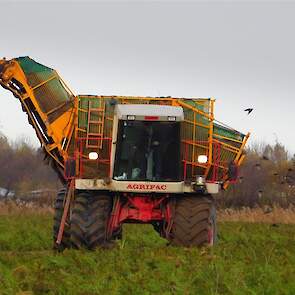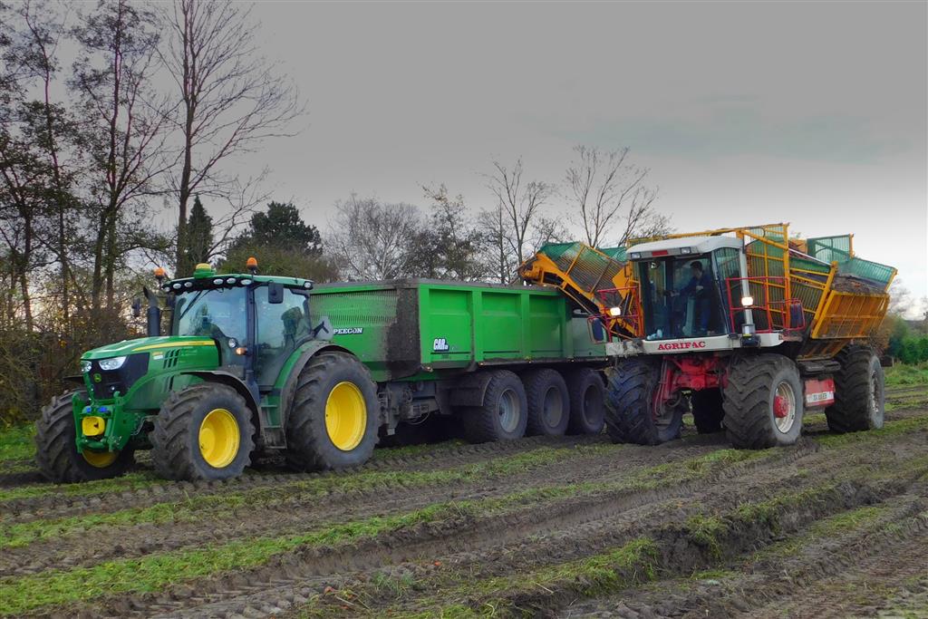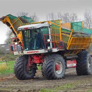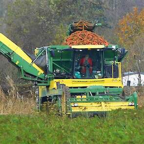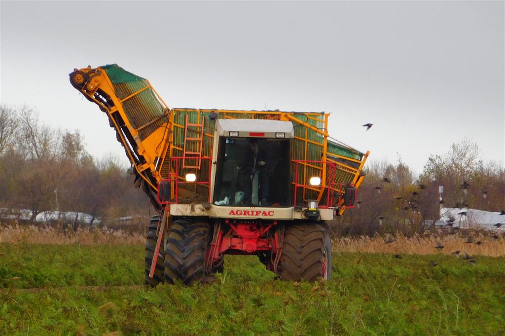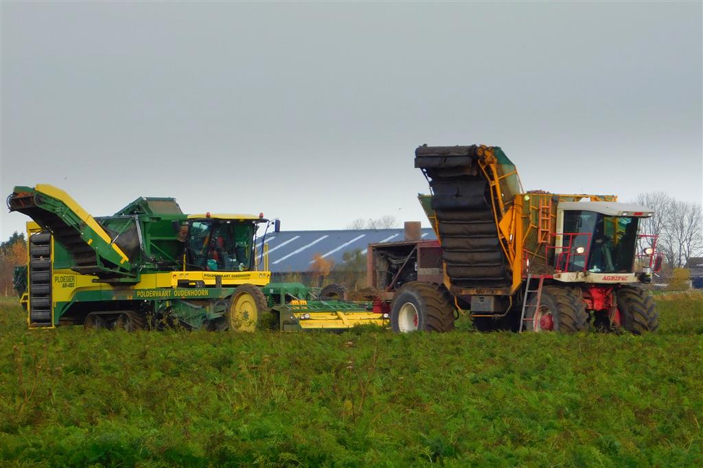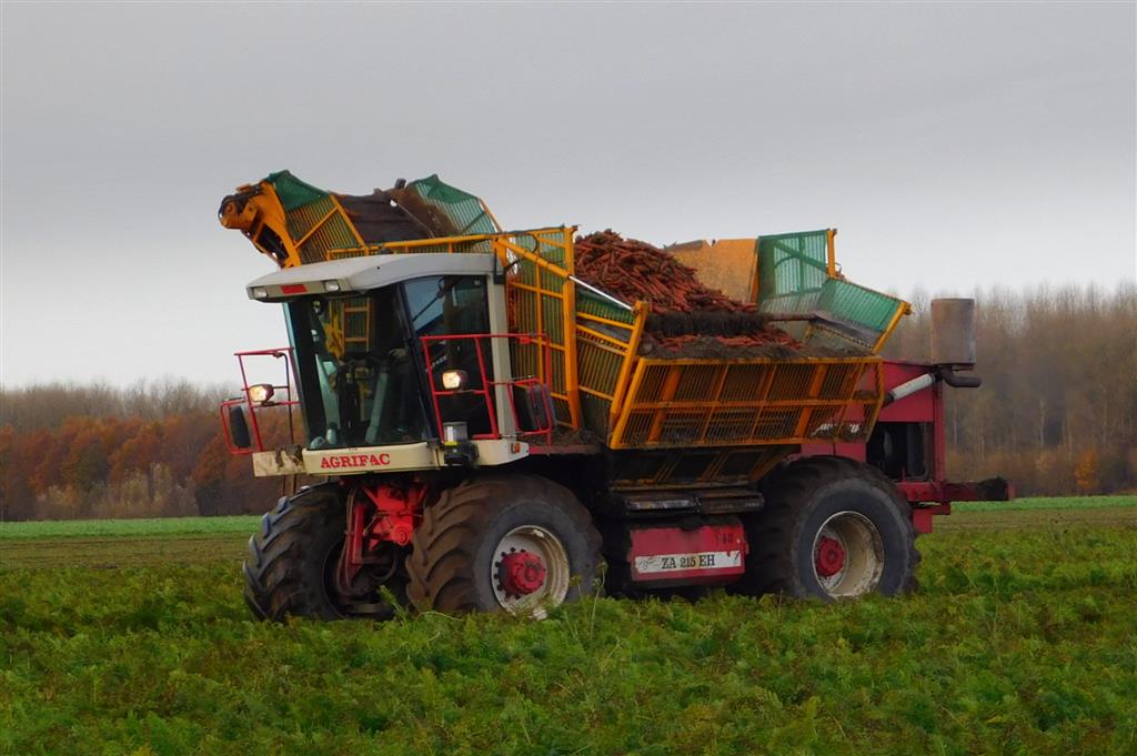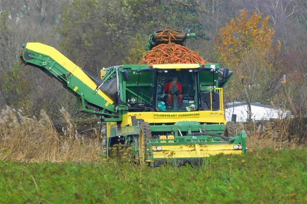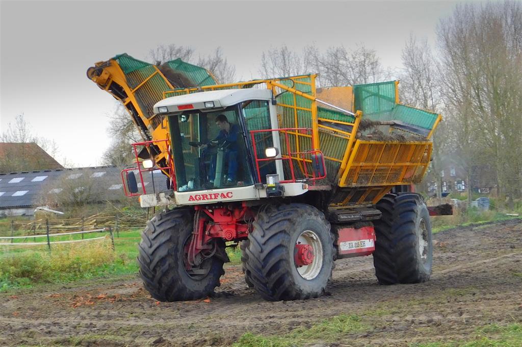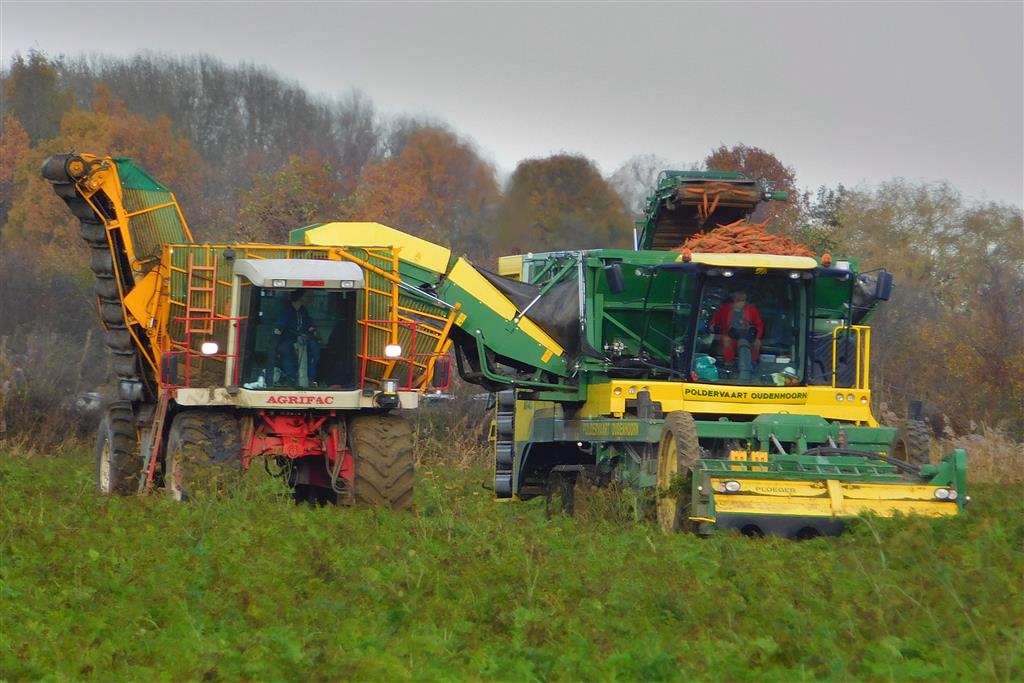 Loonbedrijf Poldervaart uit Oudenhoorn wortelen rooien met Ploeger.Voor het transport op de akker gebruikt men een oude Agrifac bietenrooier, ontdaan van het rooigedeelte. Om structuurschade zoveel mogelijk te beperken kan de Agrifac ook in hondengang rijden. Op deze manier worden er ook in natte stukken nauwelijks sporen gereden.