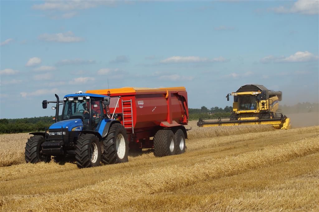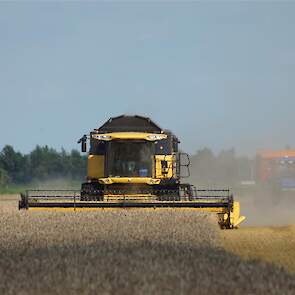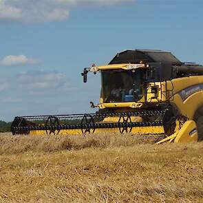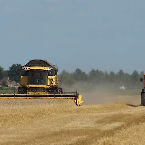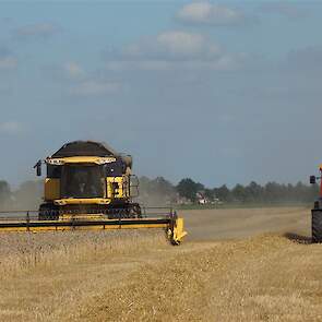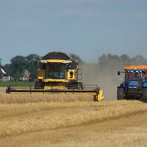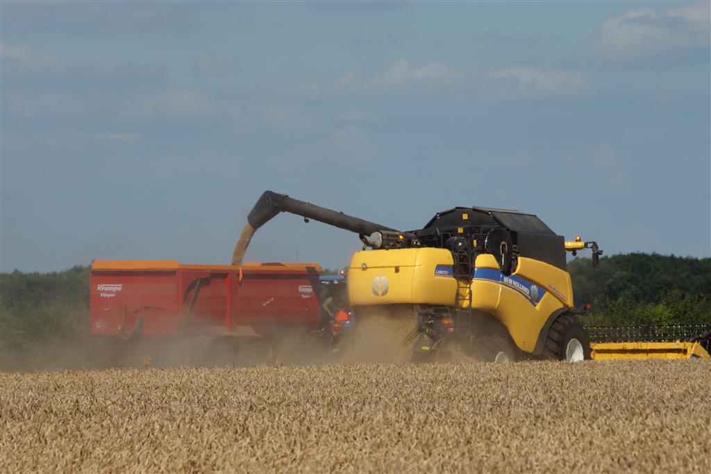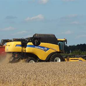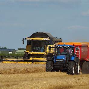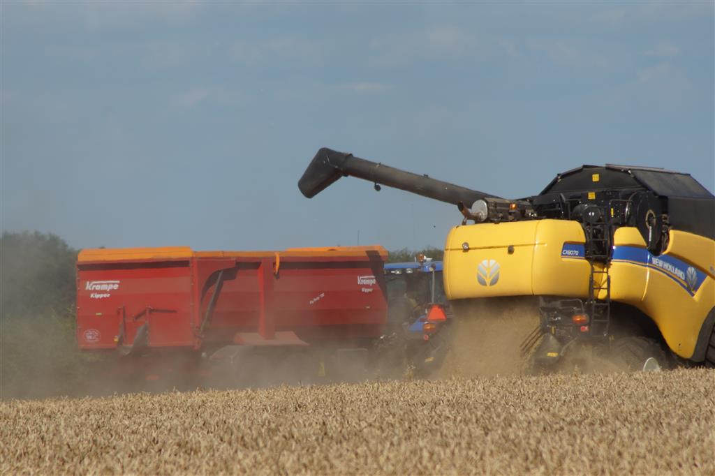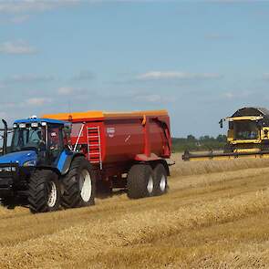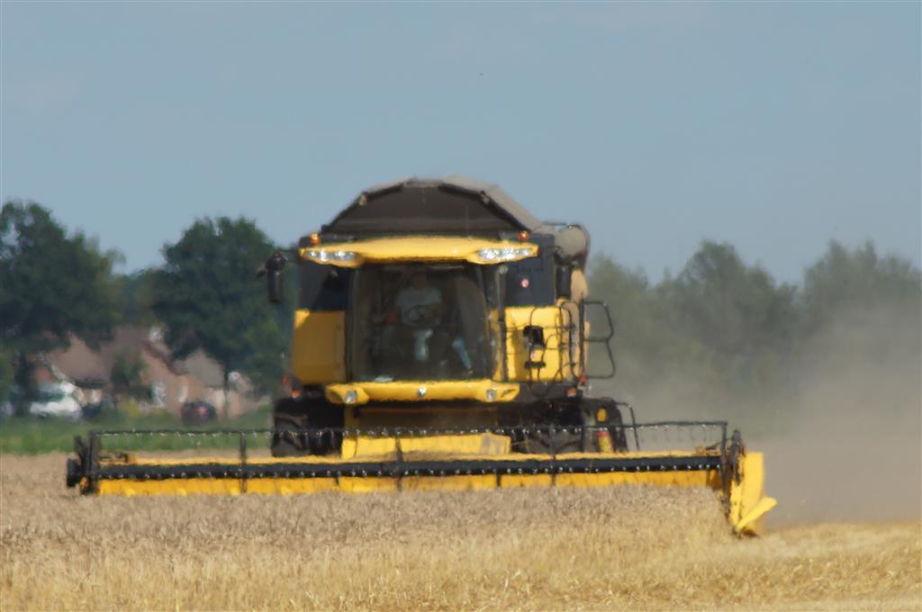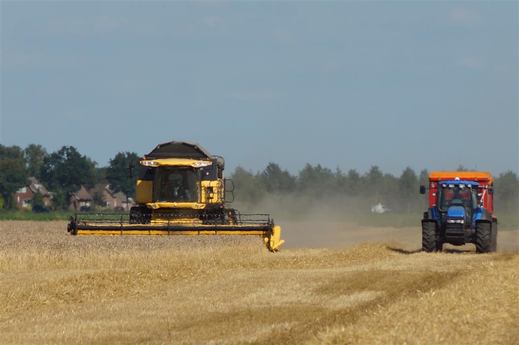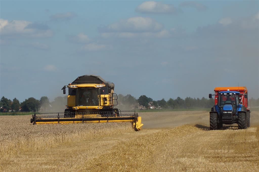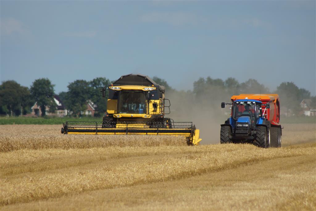 Looon en akkerbouwbedrijf Moorlag uit Nieuw Weerdinge aan het zomertarwe combinen New Holland T7.235 met Krampe BIg Body 700 en New Holland TM 155 zorgen voor het transport naar het eigen bedrijf waar het in silo`s word opgeslagen