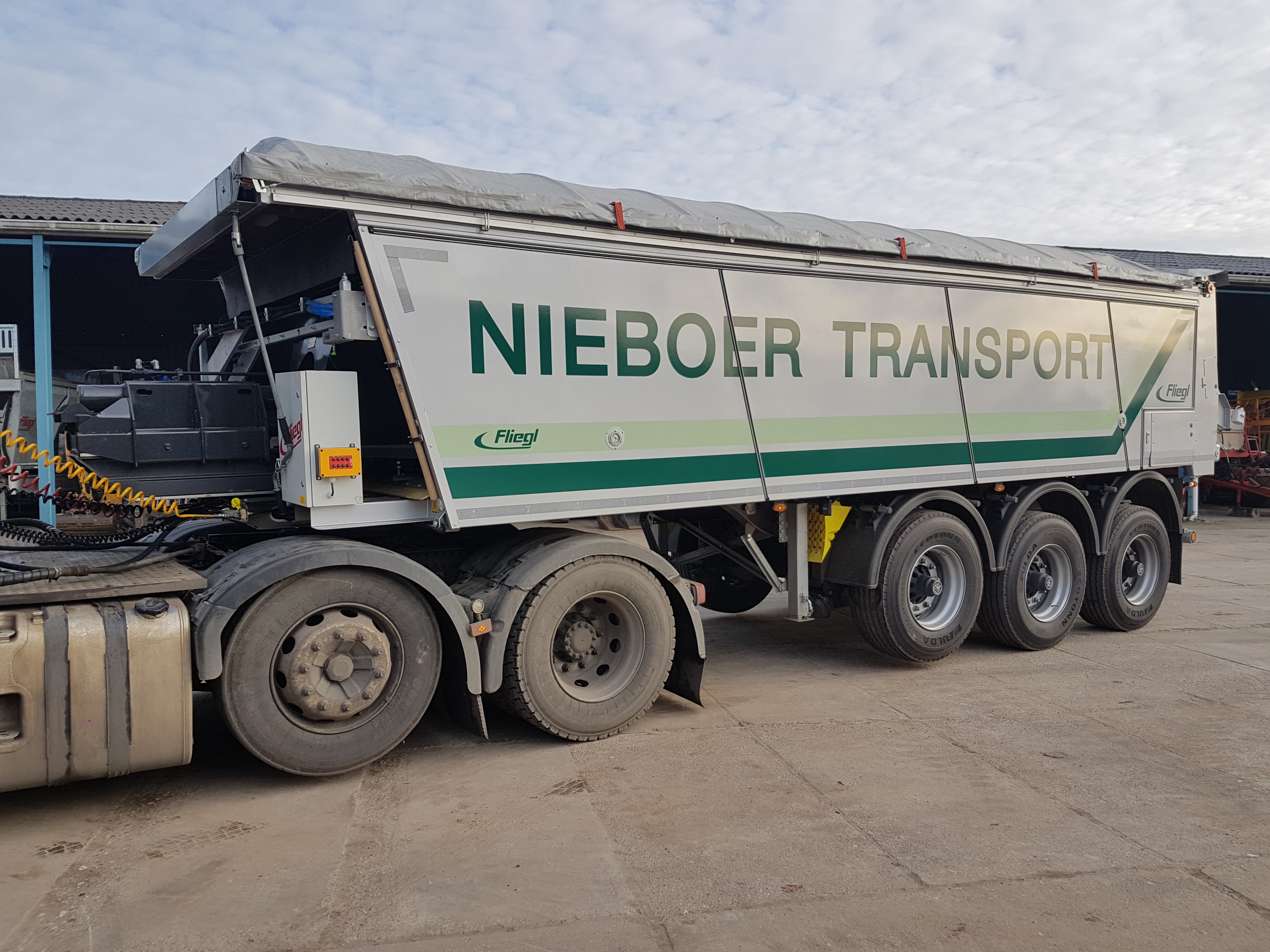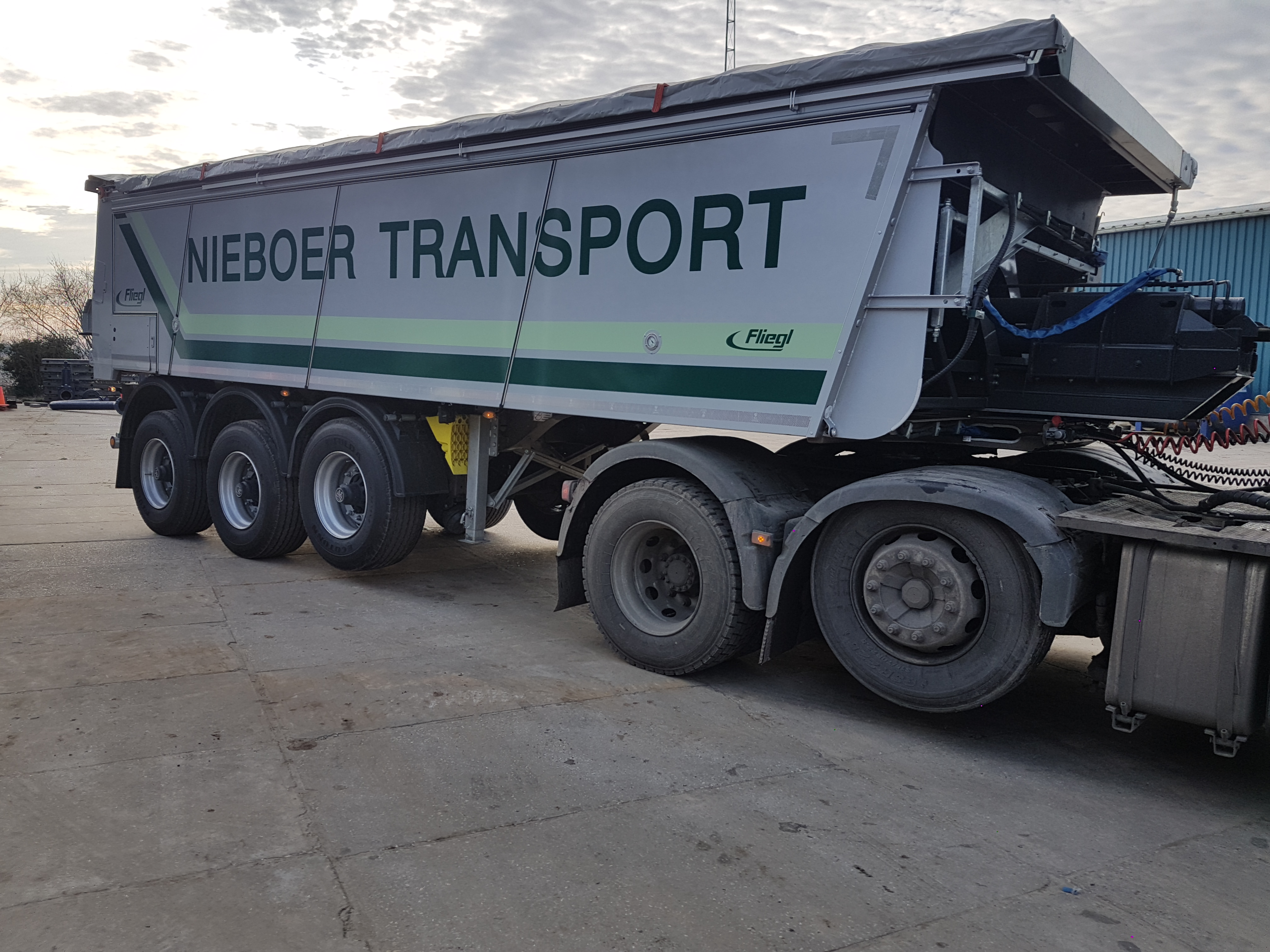 Ook het wegtransport is voorzien van afschuiftrailers. bijvoorbeeld aan Nieboer ui Hoogezand een geïsoleerde asfalt- afschuiftrailer.