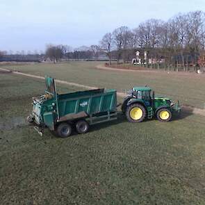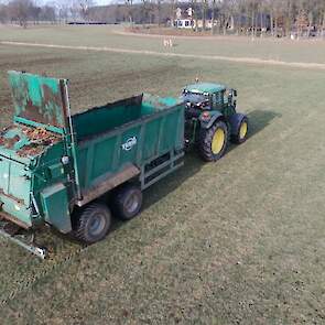 Loonbedrijf Paumen Maaseik geitenmest aan het verspreiden over blijvend grasland. Bij Melkgeitenhouderij Gimala Weert
