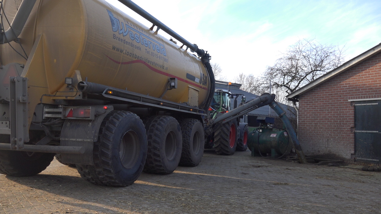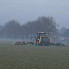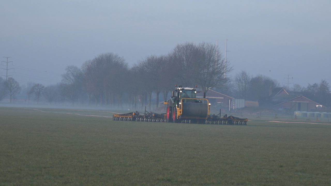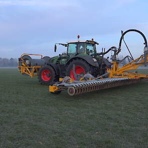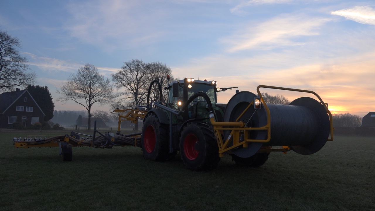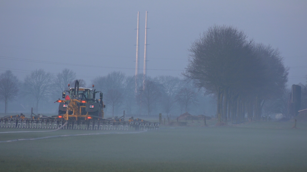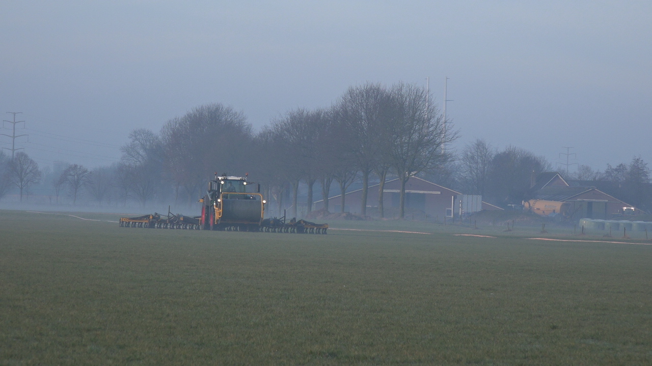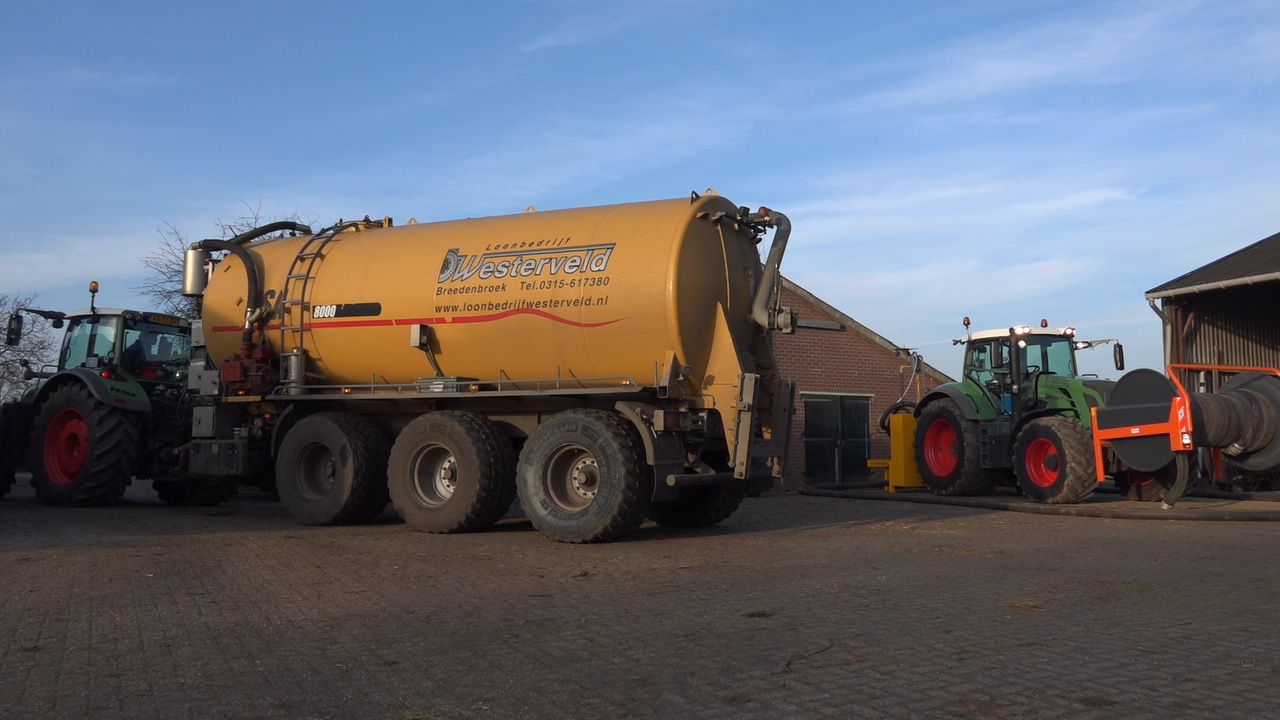 Vandaag mag het weer en is ook loonbedrijf Westerveld uit Breedenbroek met de mesttrein op pad en de 12,37 meter brede bemester van het merk Agrometer