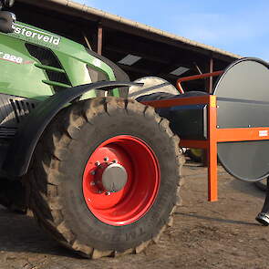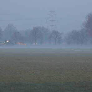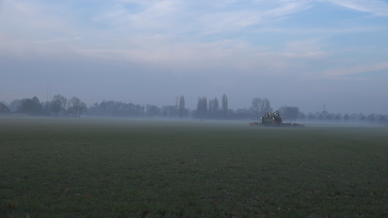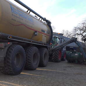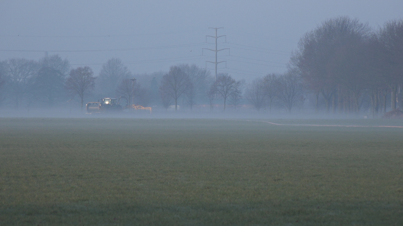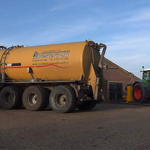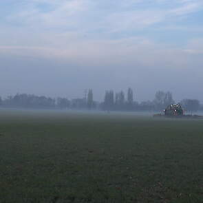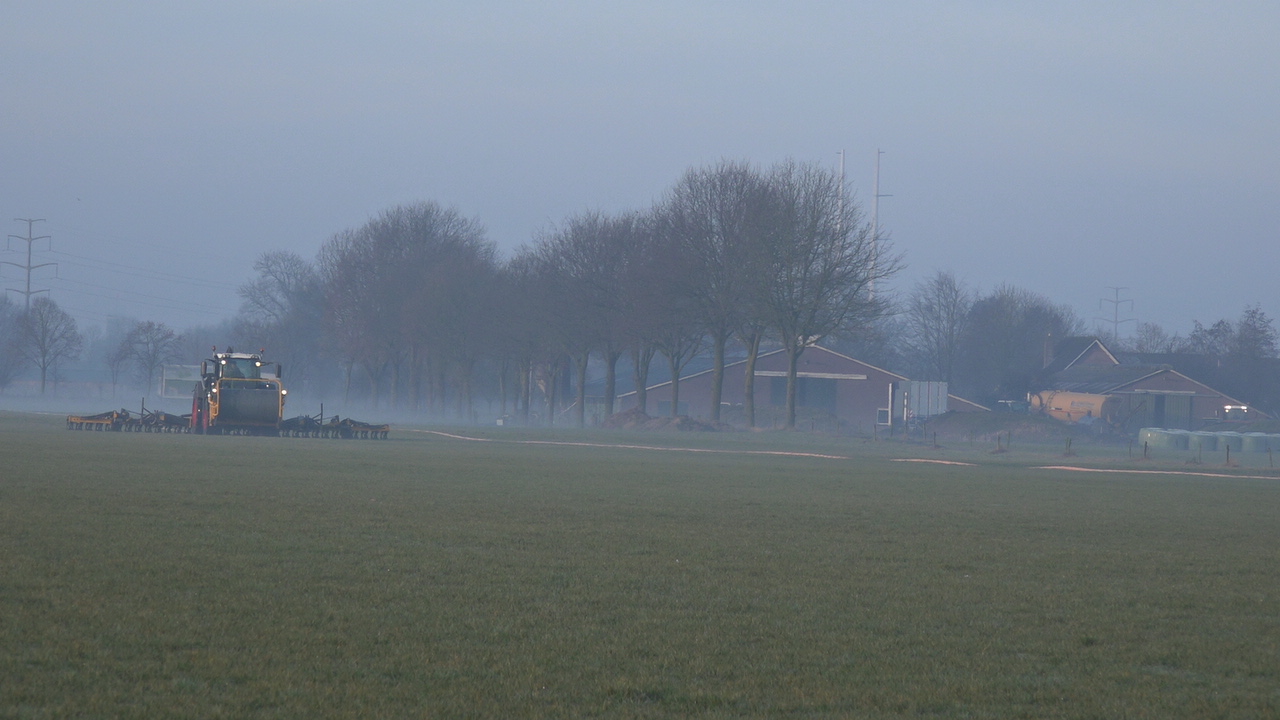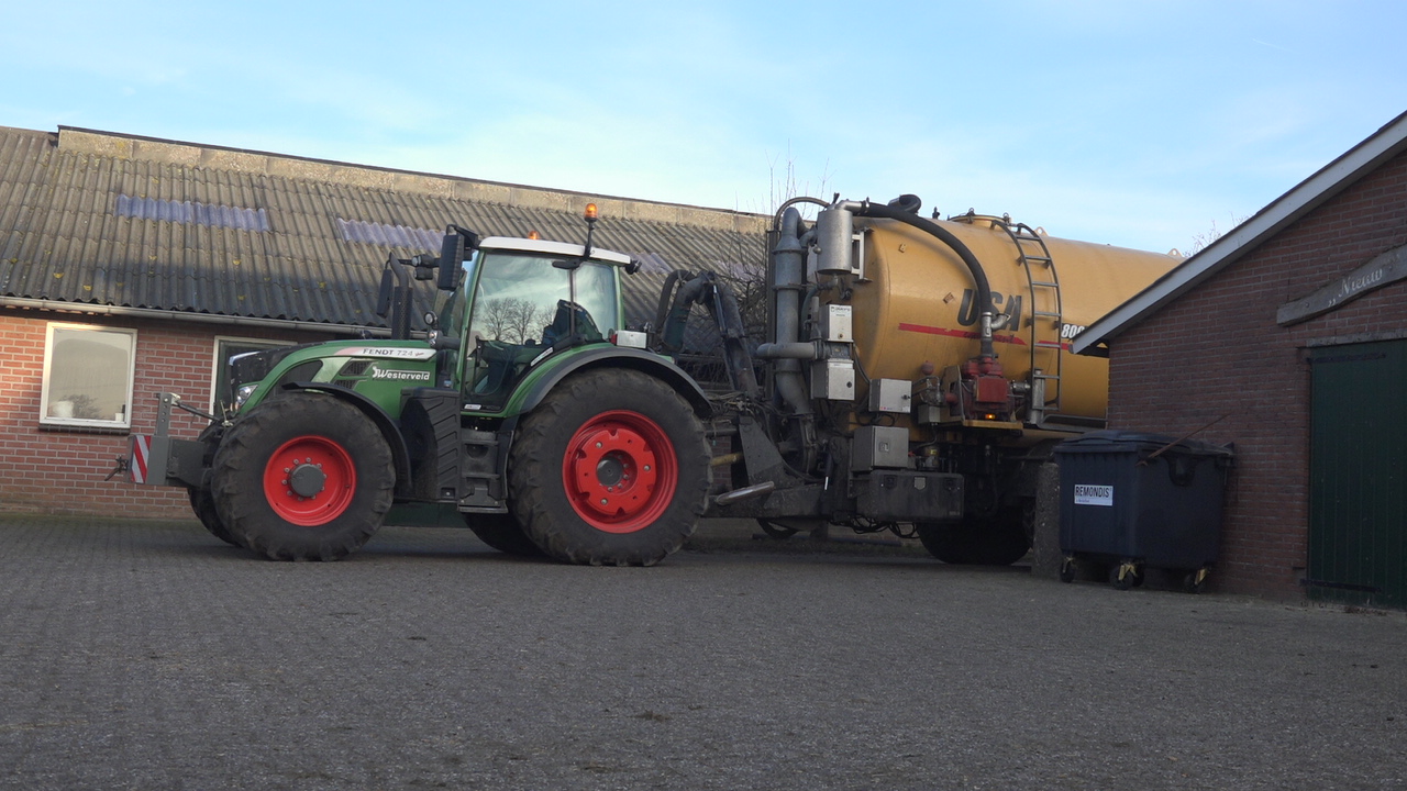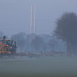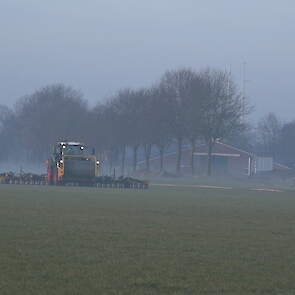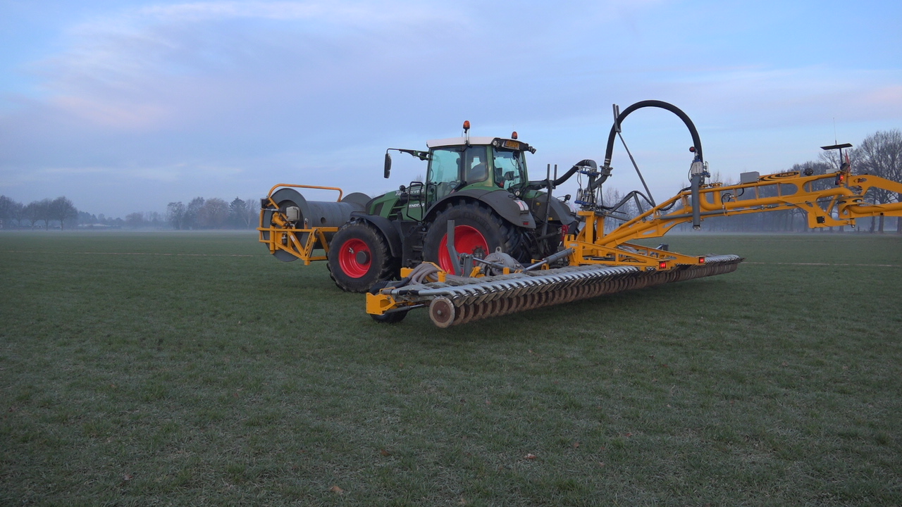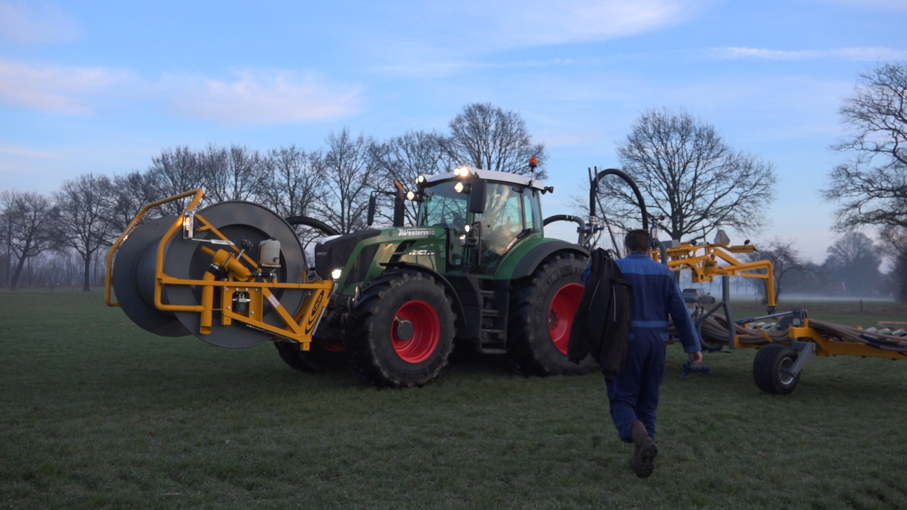 Vandaag mag het weer en is ook loonbedrijf Westerveld uit Breedenbroek met de mesttrein op pad en de 12,37 meter brede bemester van het merk Agrometer