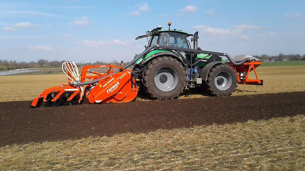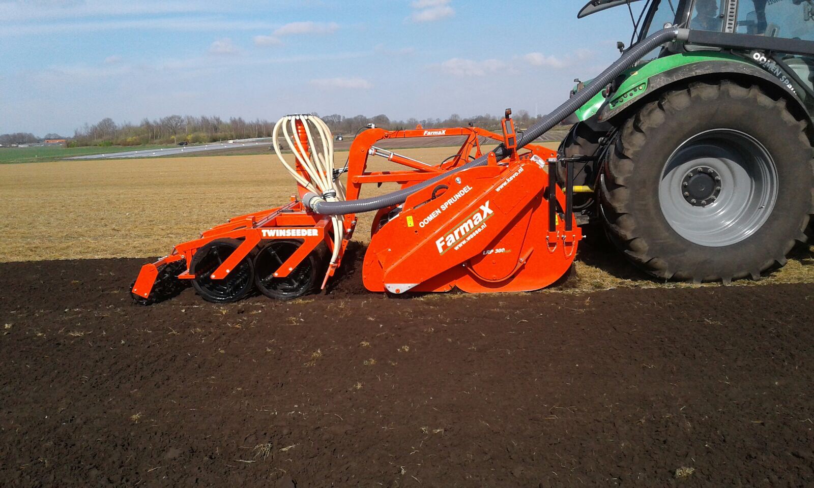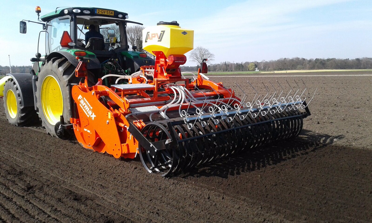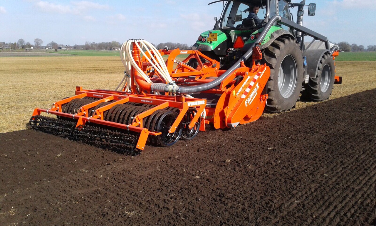De eerste Farmax Lrp Profi spitters zijn weer in bedrijf gesteld door Wasse uit Hijken.De spitters die te zien zijn in combinatie met een APV zaaier en een met een Samex twinseeder om gras te zaaien