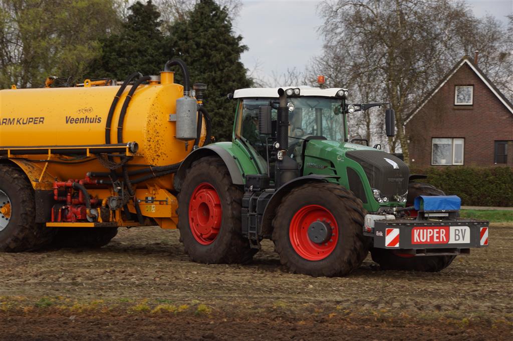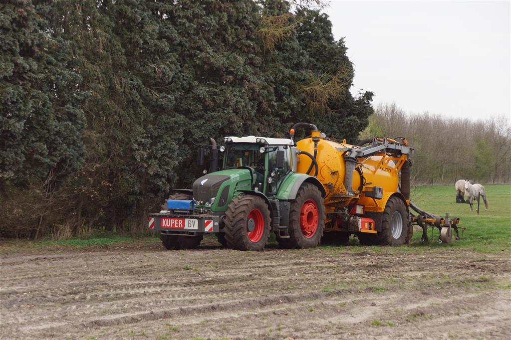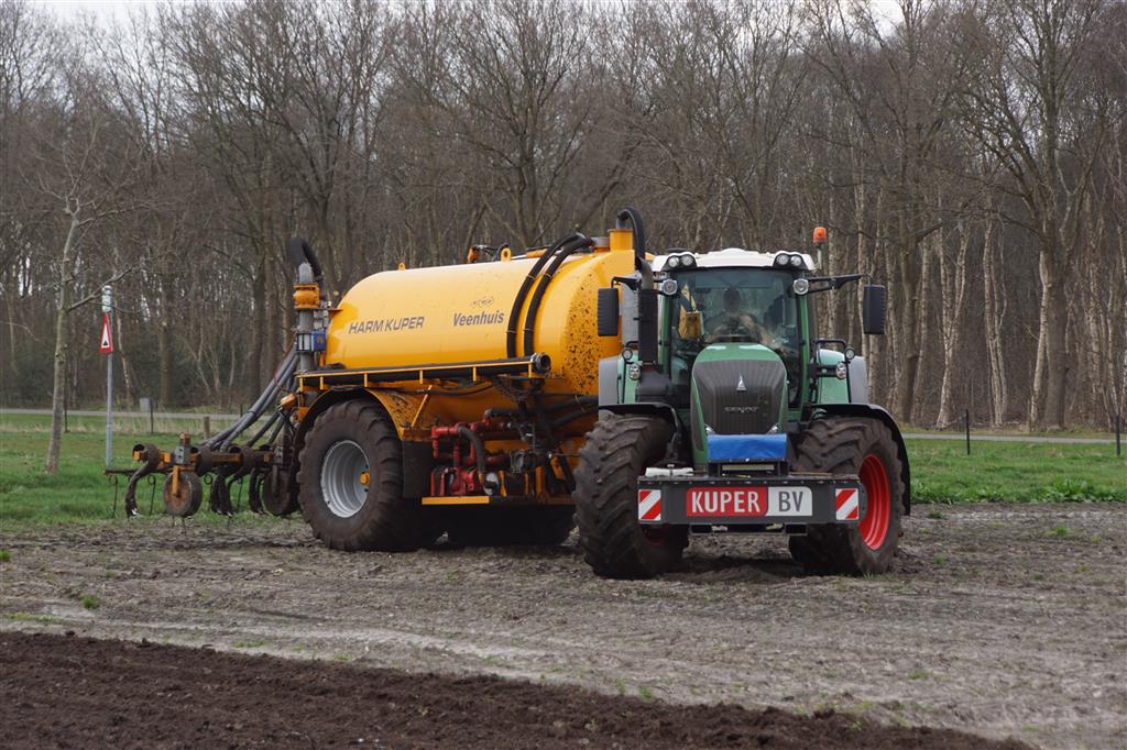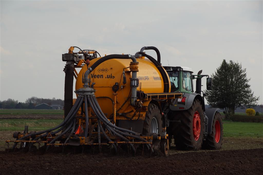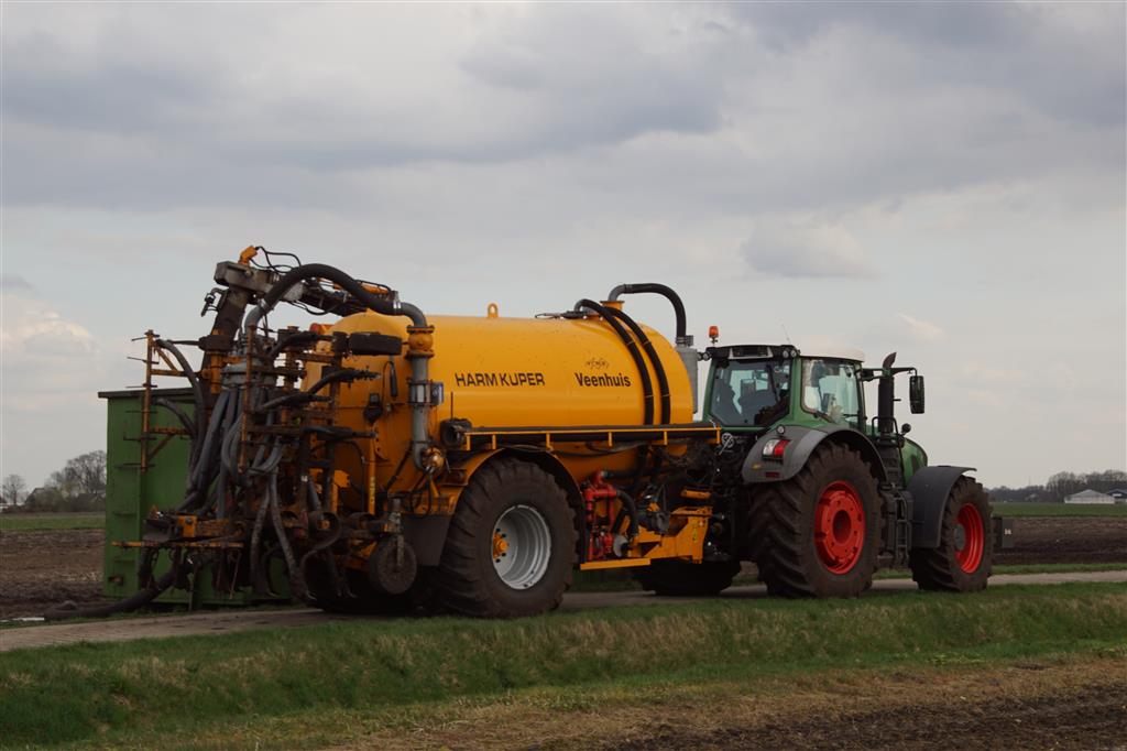 Loonbedrijf Kuper uit Klazienaveen met een gloednieuwe Fendt 936 en een 14 kuubs Veenhuis mesttank op een klein perceel aan het mest injecteren. Ondanks de imposante combinatie viel op hoe snel en gemakkelijk dit allemaal ging. De tank was dan ook snel weer leeg en kon naar de container toe voor nieuwe aanvoer