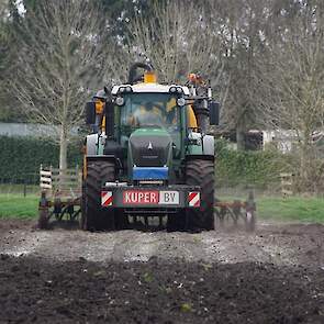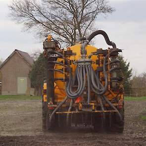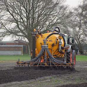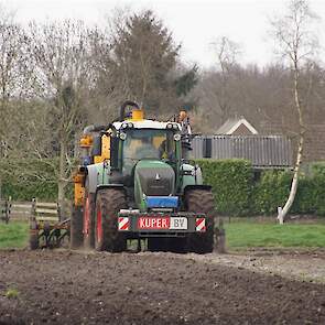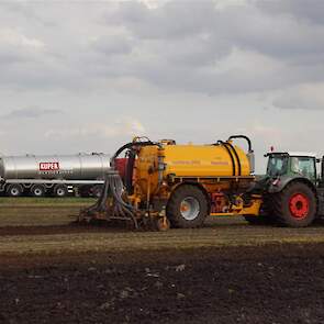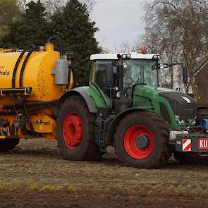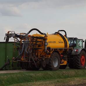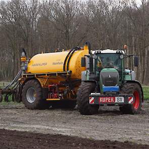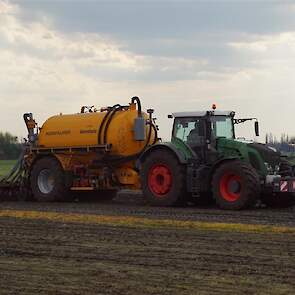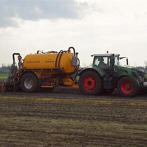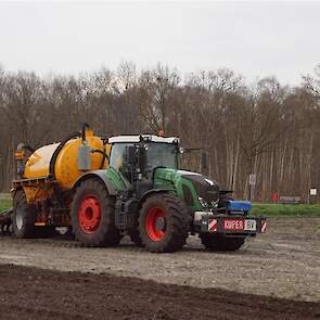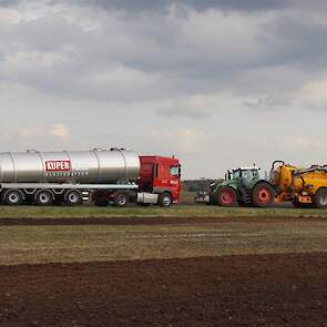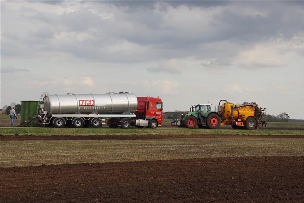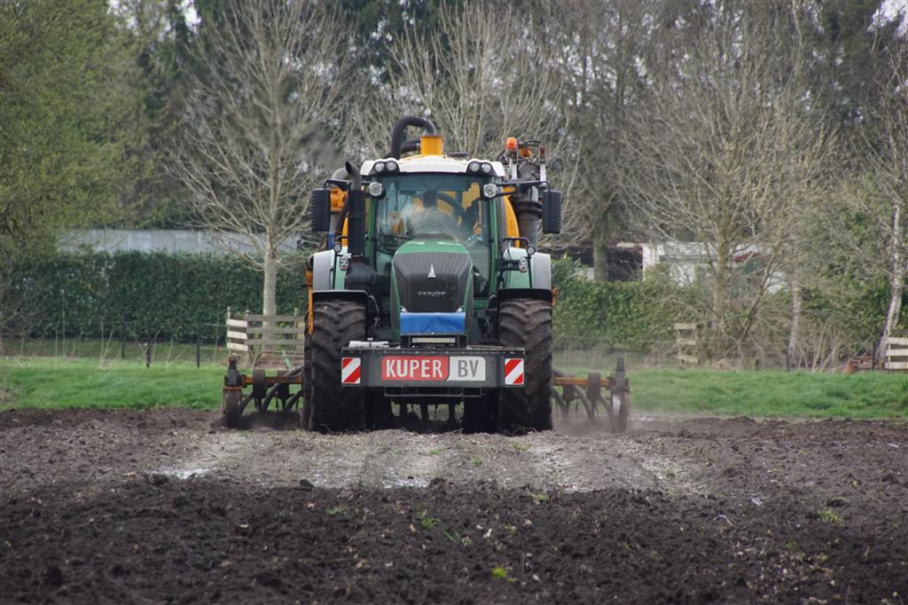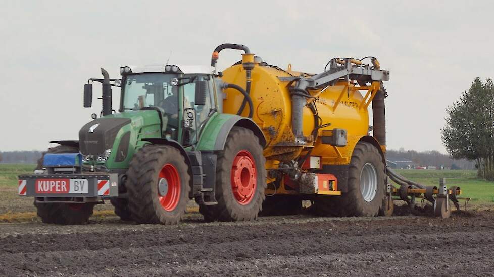 Loonbedrijf Kuper uit Klazienaveen met een gloednieuwe Fendt 936 en een 14 kuubs Veenhuis mesttank op een klein perceel aan het mest injecteren. Ondanks de imposante combinatie viel op hoe snel en gemakkelijk dit allemaal ging. De tank was dan ook snel weer leeg en kon naar de container toe voor nieuwe aanvoer