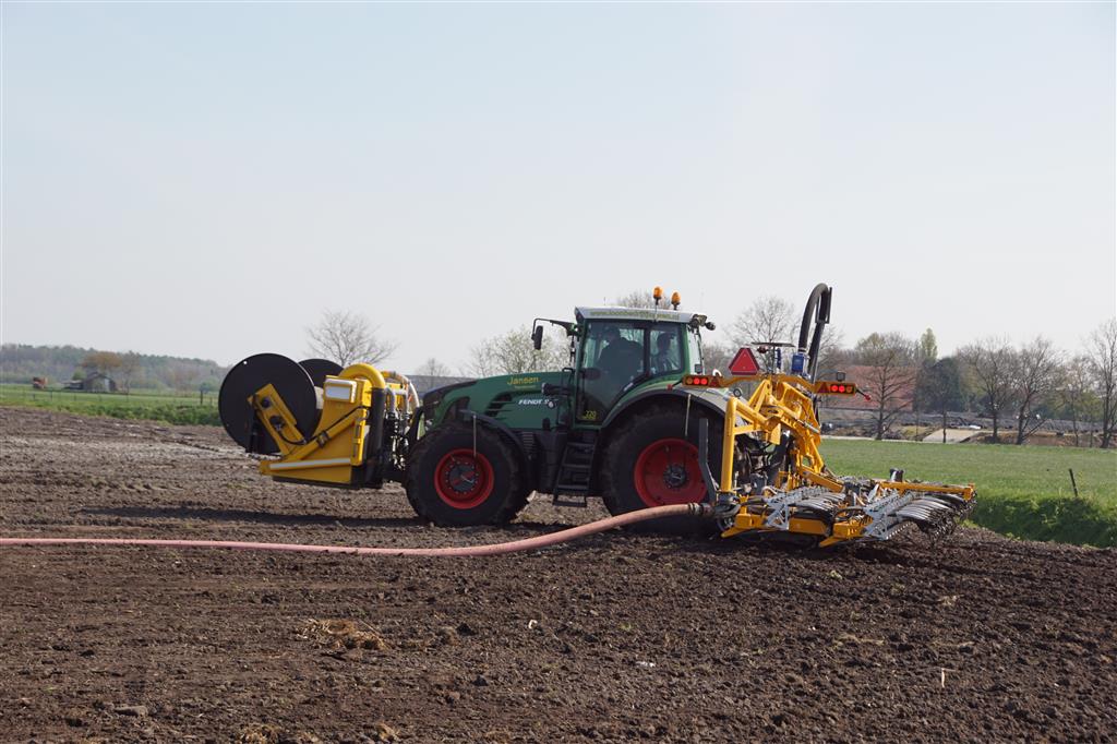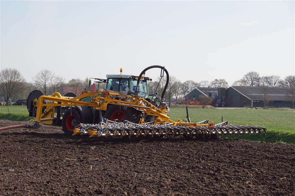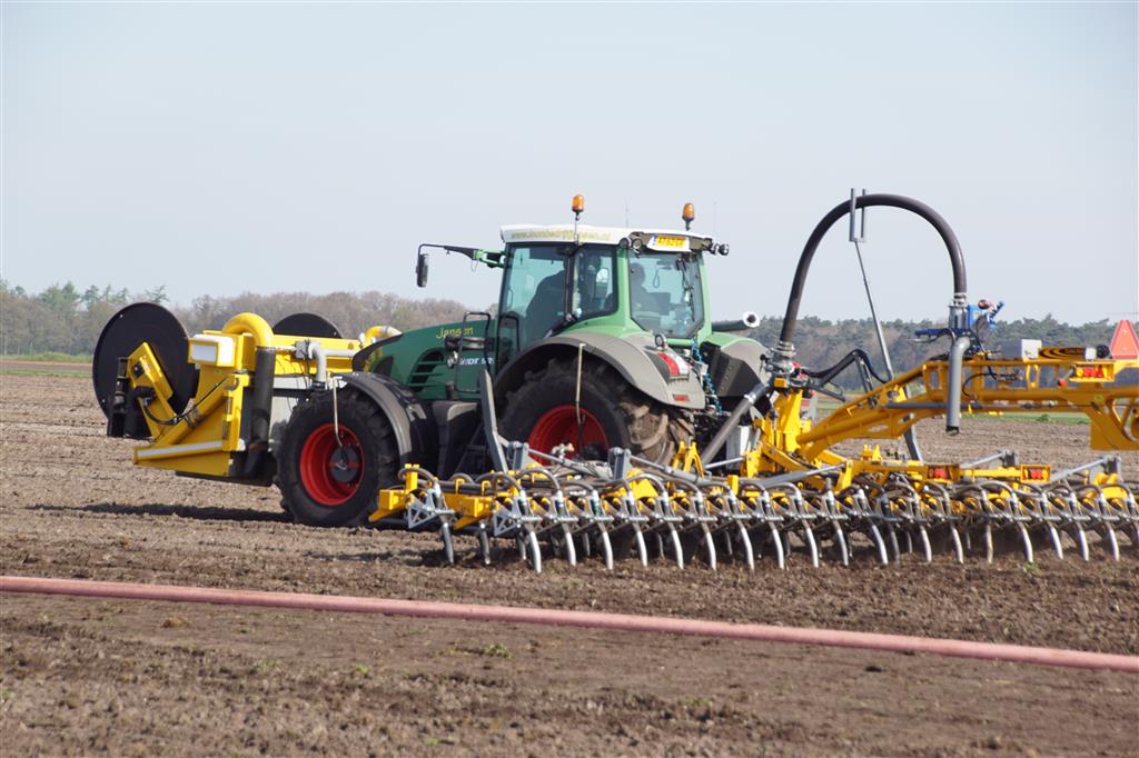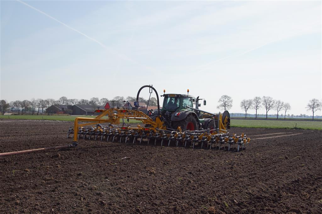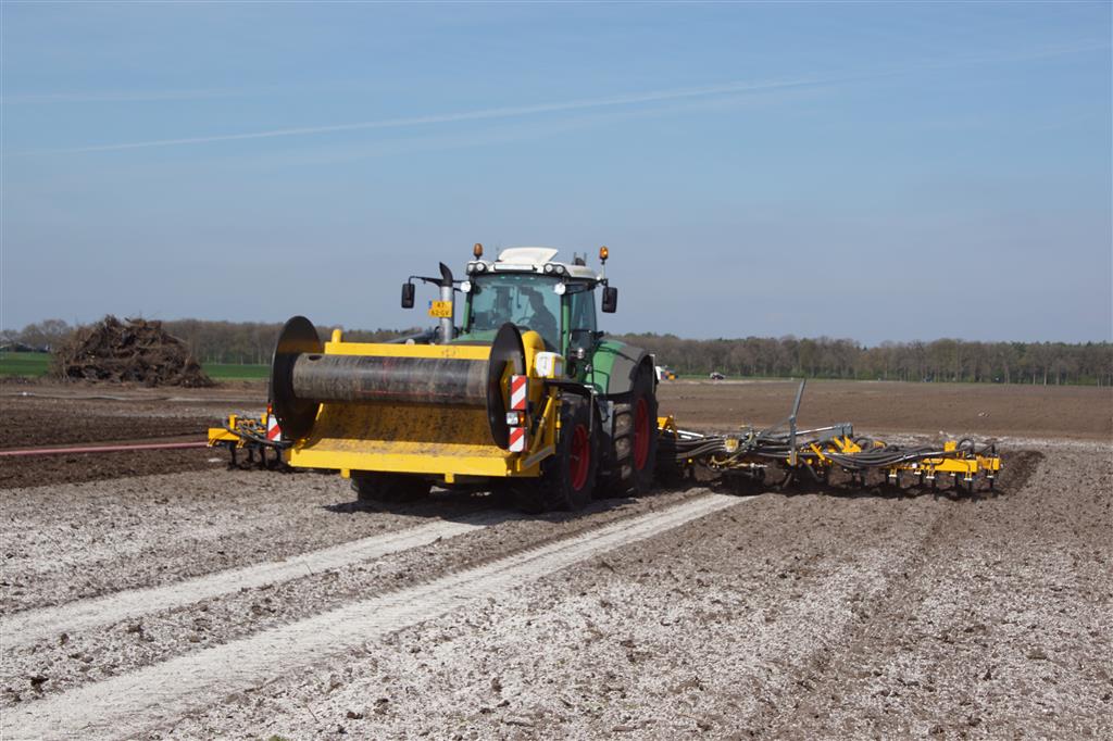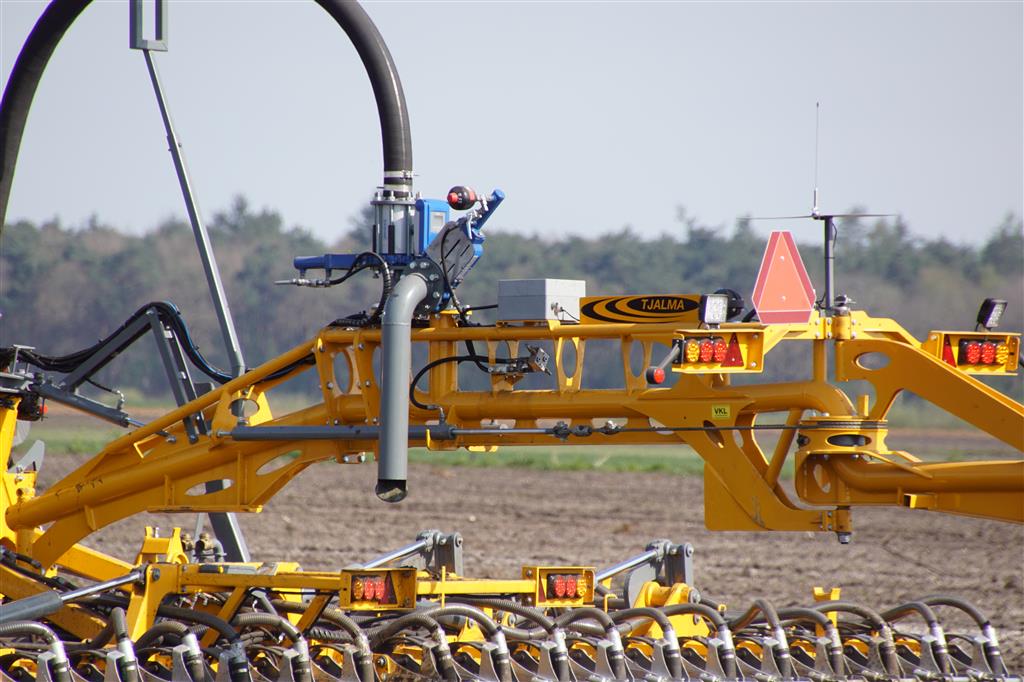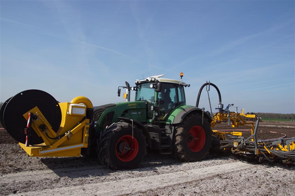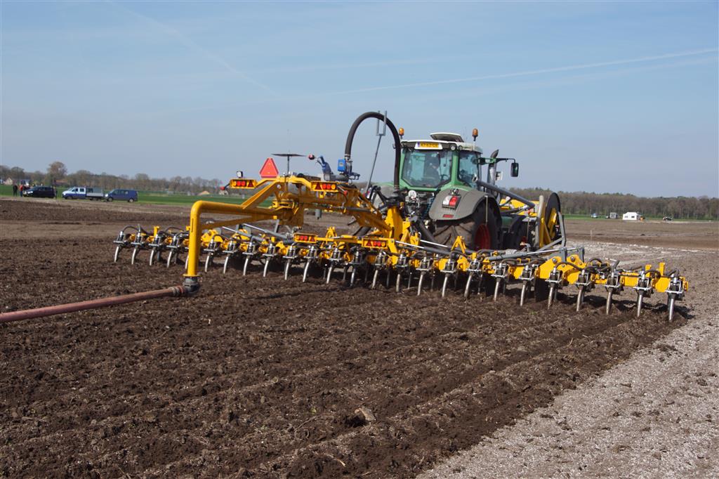 De Tjalma Hydrodisc Sleepslang Bouwlandbemester met maar liefst een breedte van 12,25m. Deze nieuwe machine is compleet ontwikkeld en geproduceerd in Groningen, door de firma S Tjalma BV. Met deze combinatie kan bouwland bemest worden doormiddel van een sleepslangsysteem. Deze bemester is voorzien van GPS met sectie afsluiting, voetafsluiters en diepteregeling. Deze machine draait bij loonbedrijf Jansen in Tiendeveen.