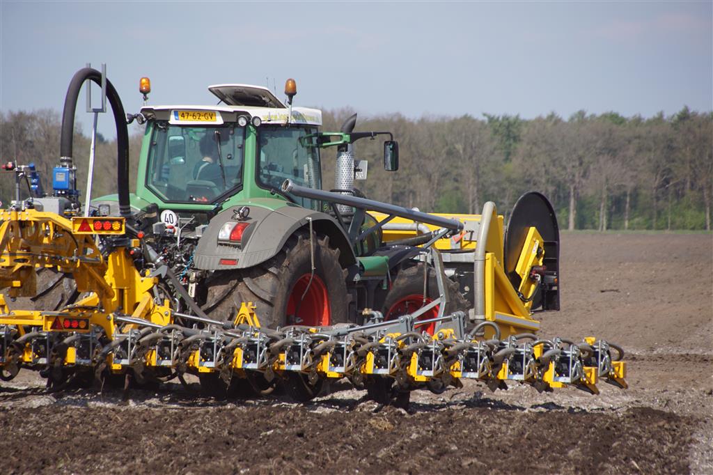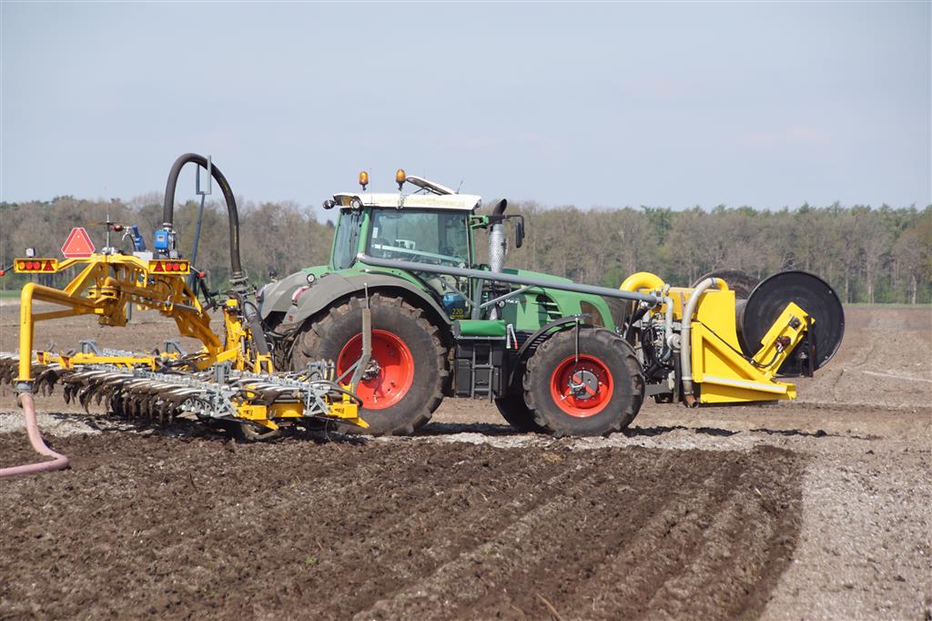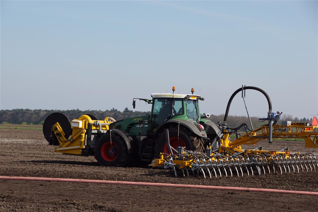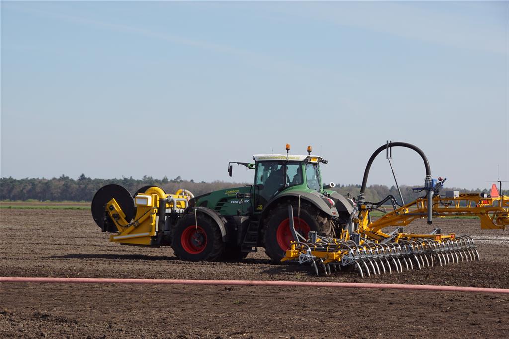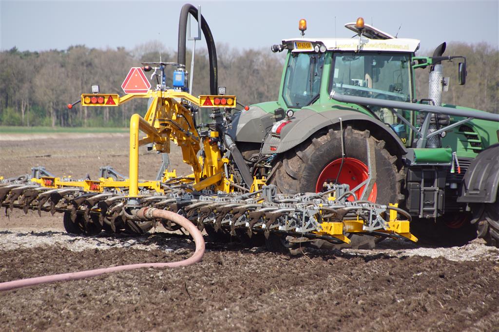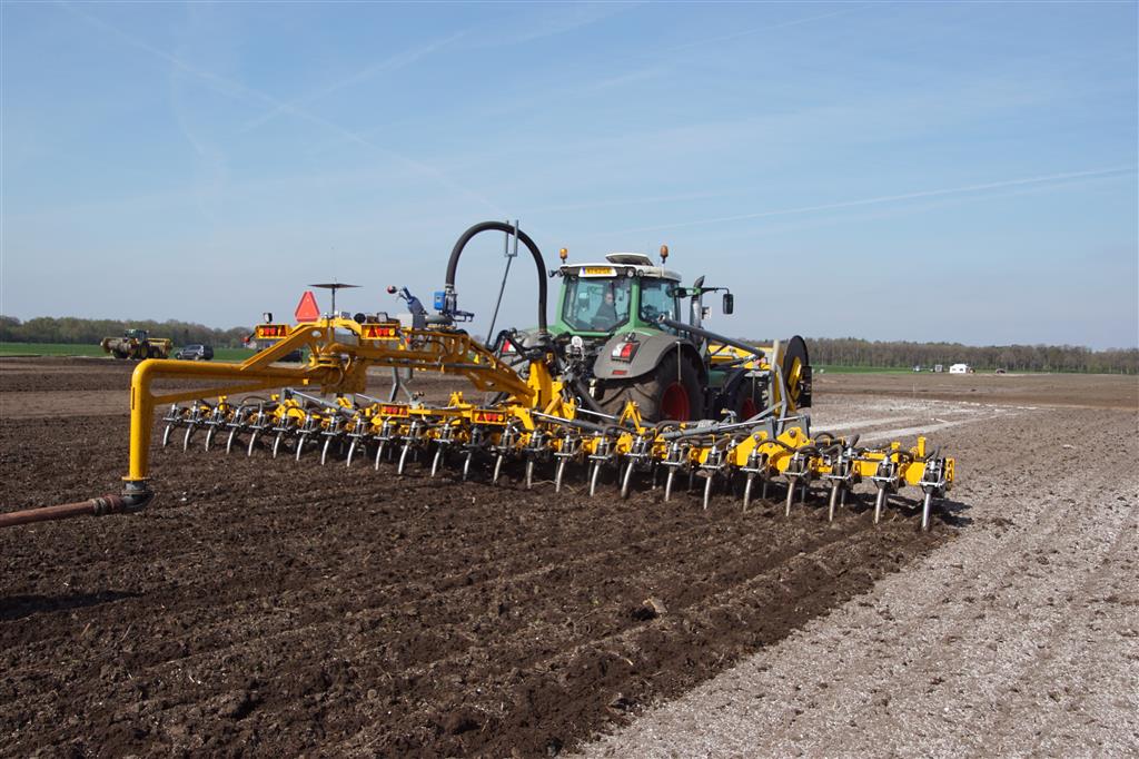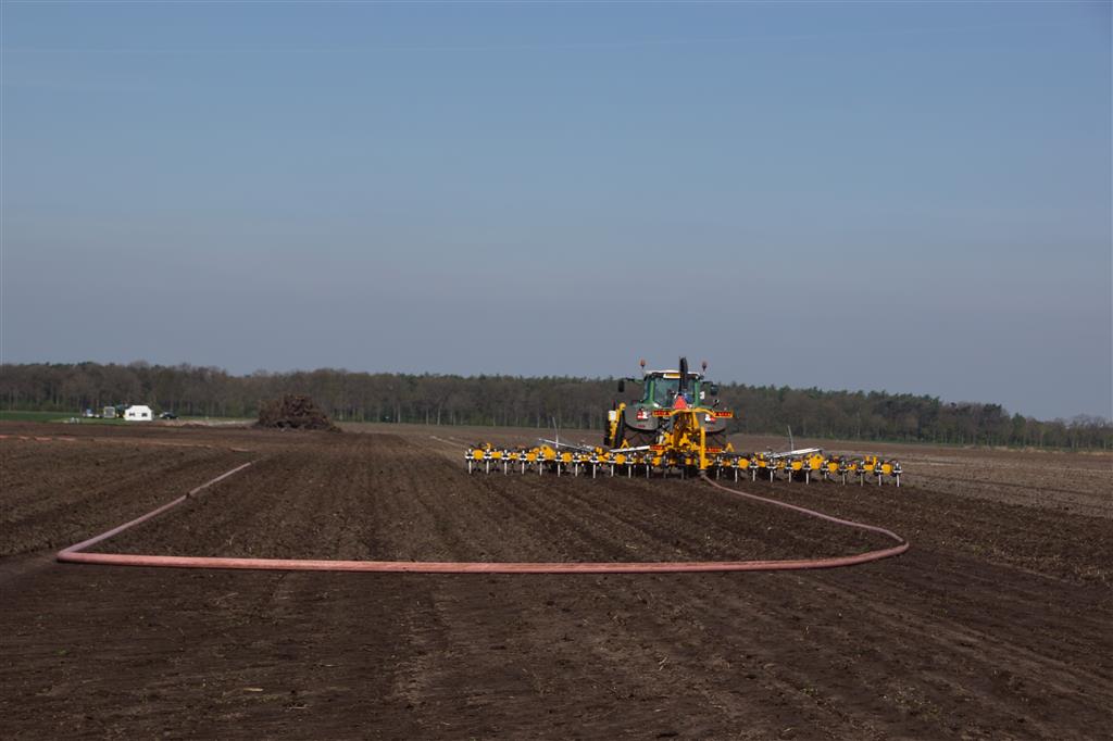 De Tjalma Hydrodisc Sleepslang Bouwlandbemester met maar liefst een breedte van 12,25m. Deze nieuwe machine is compleet ontwikkeld en geproduceerd in Groningen, door de firma S Tjalma BV. Met deze combinatie kan bouwland bemest worden doormiddel van een sleepslangsysteem. Deze bemester is voorzien van GPS met sectie afsluiting, voetafsluiters en diepteregeling. Deze machine draait bij loonbedrijf Jansen in Tiendeveen.