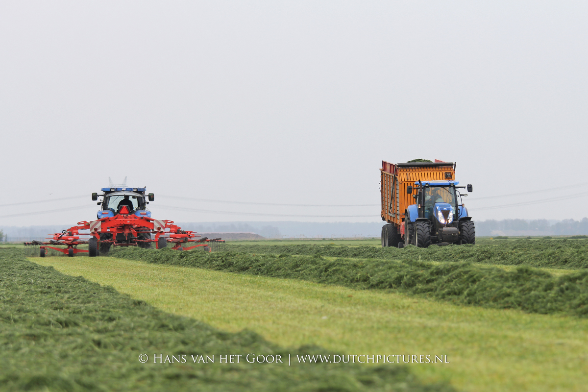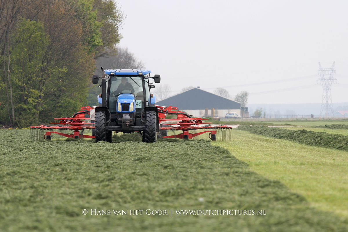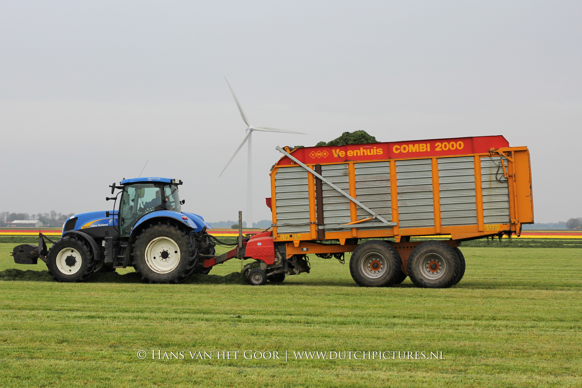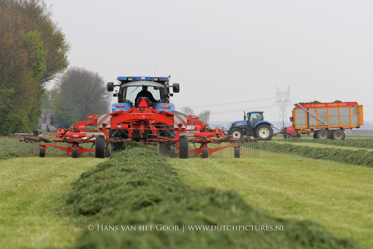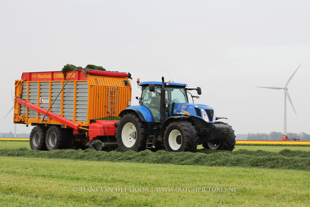 De eerste snede gras harken en oprapen bij Biddinghuizen, door loonbedrijf Bunte uit Heerde en een veehouder uit Dronten. We zien een New Holland T7030 en T6030, beide met een Veenhuis Combi 2000 dubbeldoelwagen. Daarnaast ook een New Holland TS100 met Kuhn hark van de veehouder. De tulpen bloeien mooi op de achtergrond!
