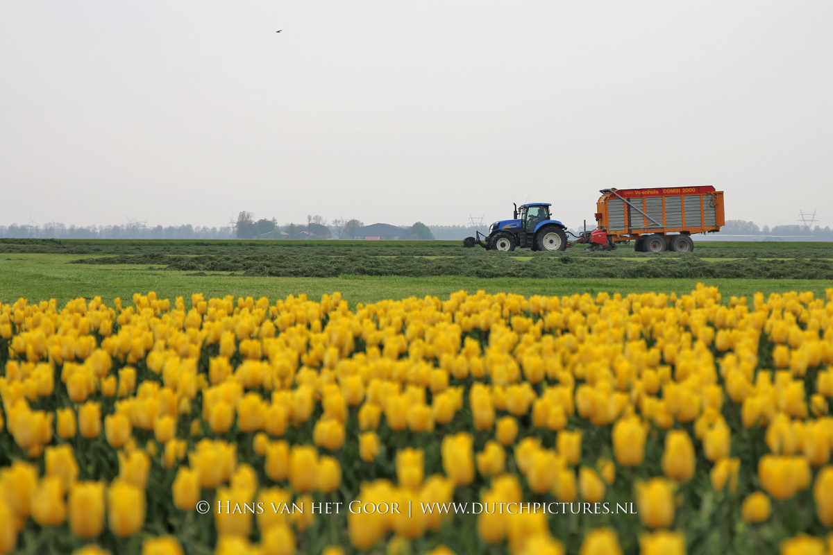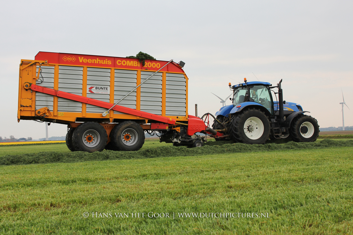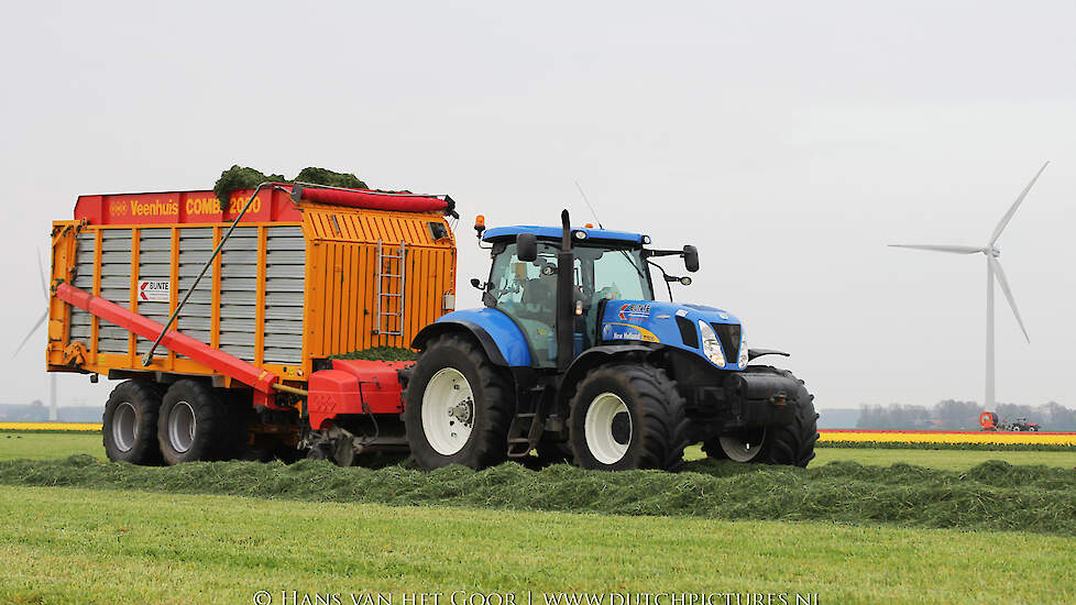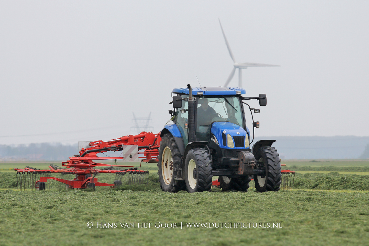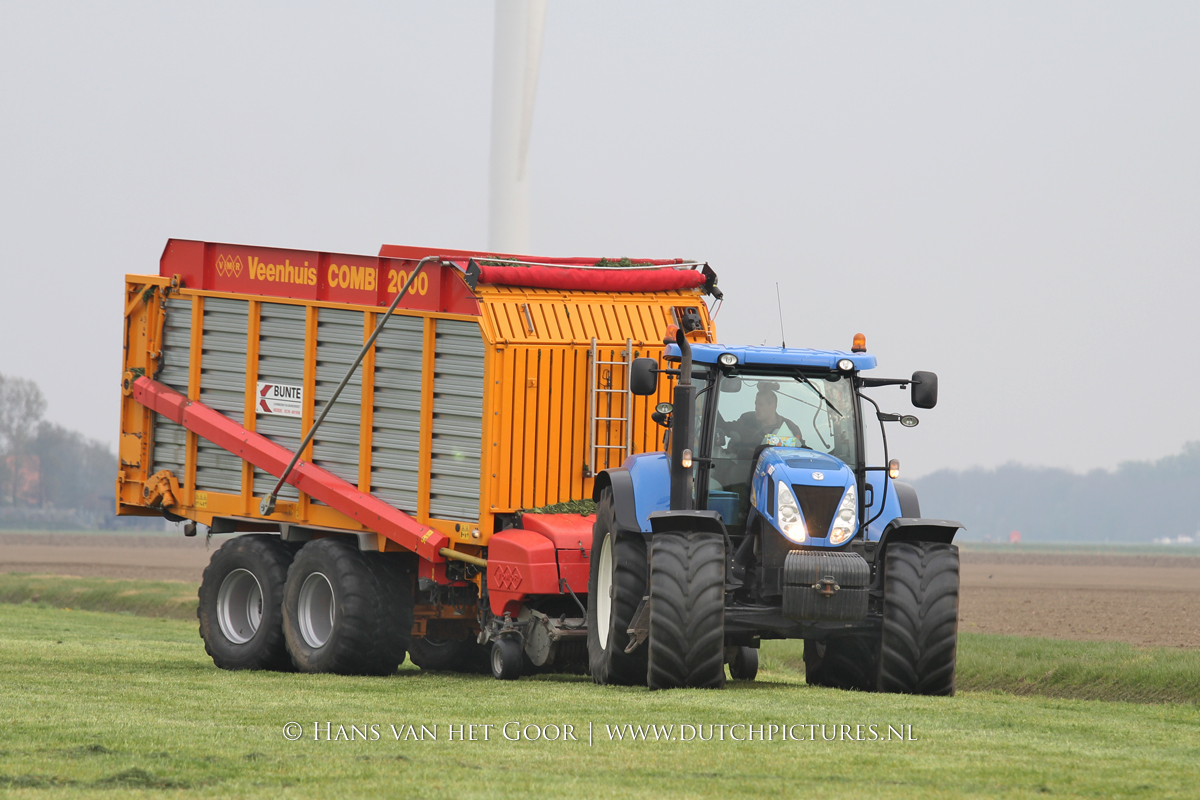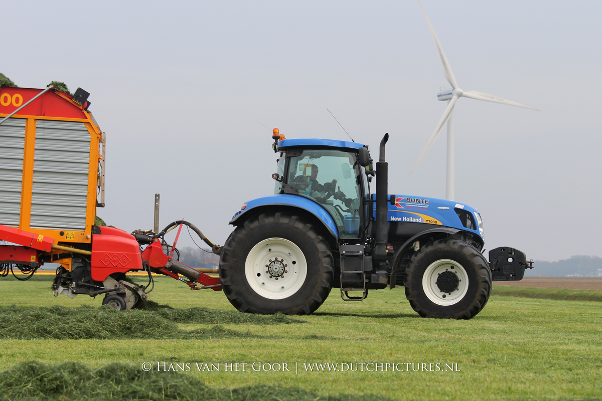 De eerste snede gras harken en oprapen bij Biddinghuizen, door loonbedrijf Bunte uit Heerde en een veehouder uit Dronten. We zien een New Holland T7030 en T6030, beide met een Veenhuis Combi 2000 dubbeldoelwagen. Daarnaast ook een New Holland TS100 met Kuhn hark van de veehouder. De tulpen bloeien mooi op de achtergrond!