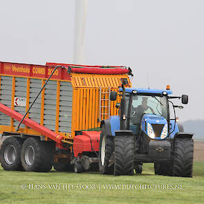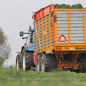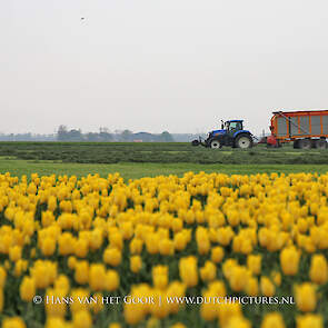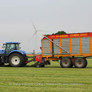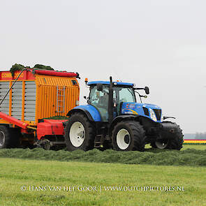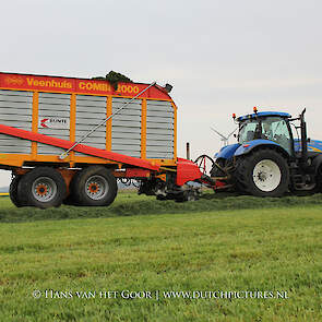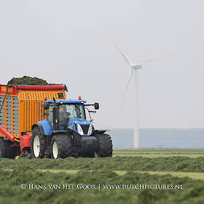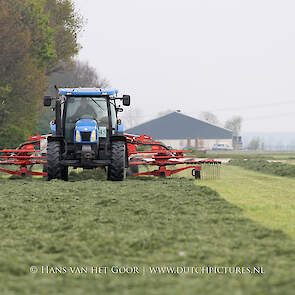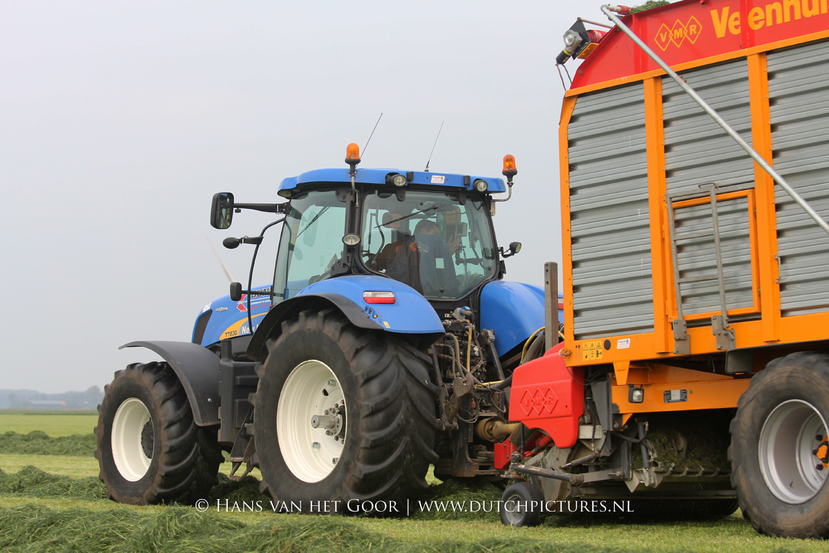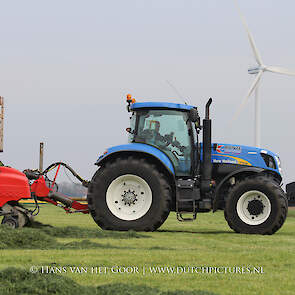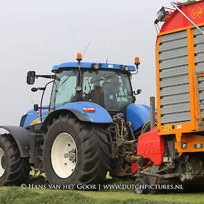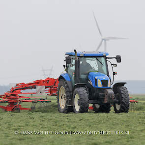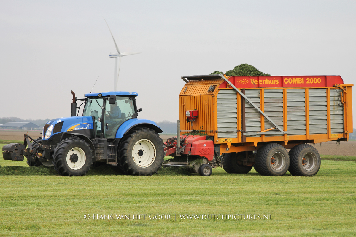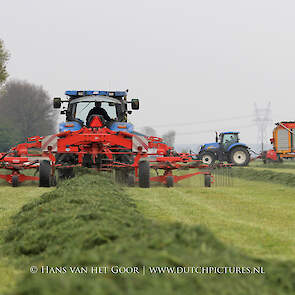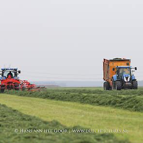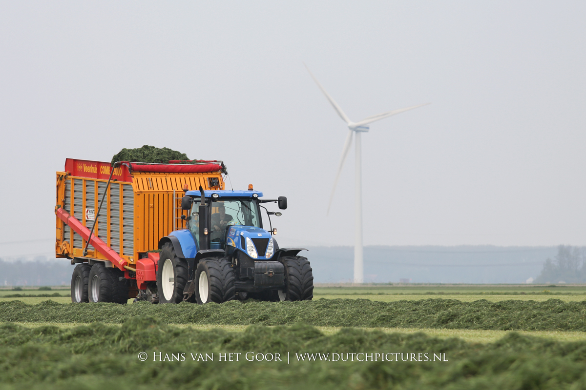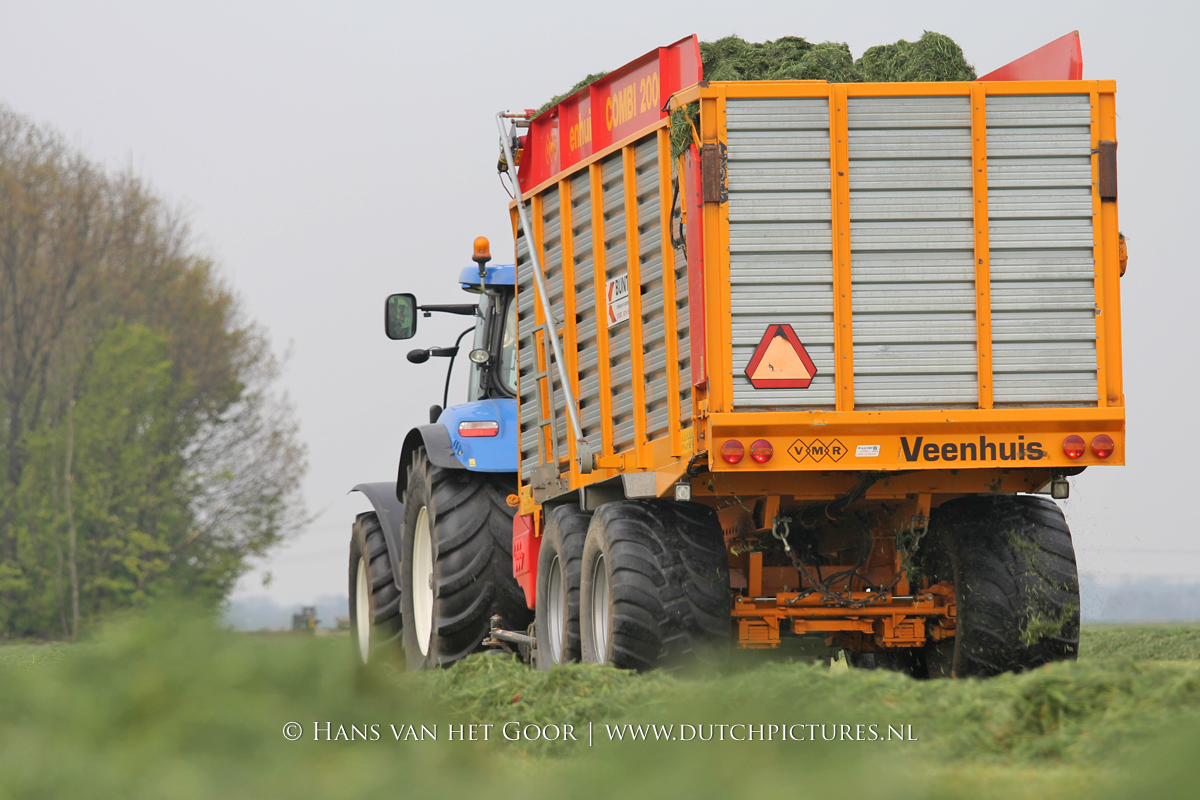 De eerste snede gras harken en oprapen bij Biddinghuizen, door loonbedrijf Bunte uit Heerde en een veehouder uit Dronten. We zien een New Holland T7030 en T6030, beide met een Veenhuis Combi 2000 dubbeldoelwagen. Daarnaast ook een New Holland TS100 met Kuhn hark van de veehouder. De tulpen bloeien mooi op de achtergrond!