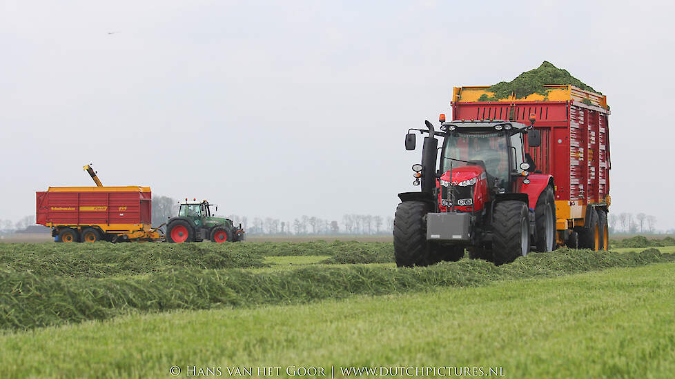 De grasoogst is in volle gang in Flevoland. Loonbedrijf Johan Frens is, met een New Holland FX 50 veldhakselaar, de eerste snede gras aan het hakselen bij Biddinghuizen. De afvoer naar de kuil wordt gedaan met een Fendt 718 en een Massey Ferguson 7616, beide met een Schuitemaker Rapide 155 dubbeldoelwagen.