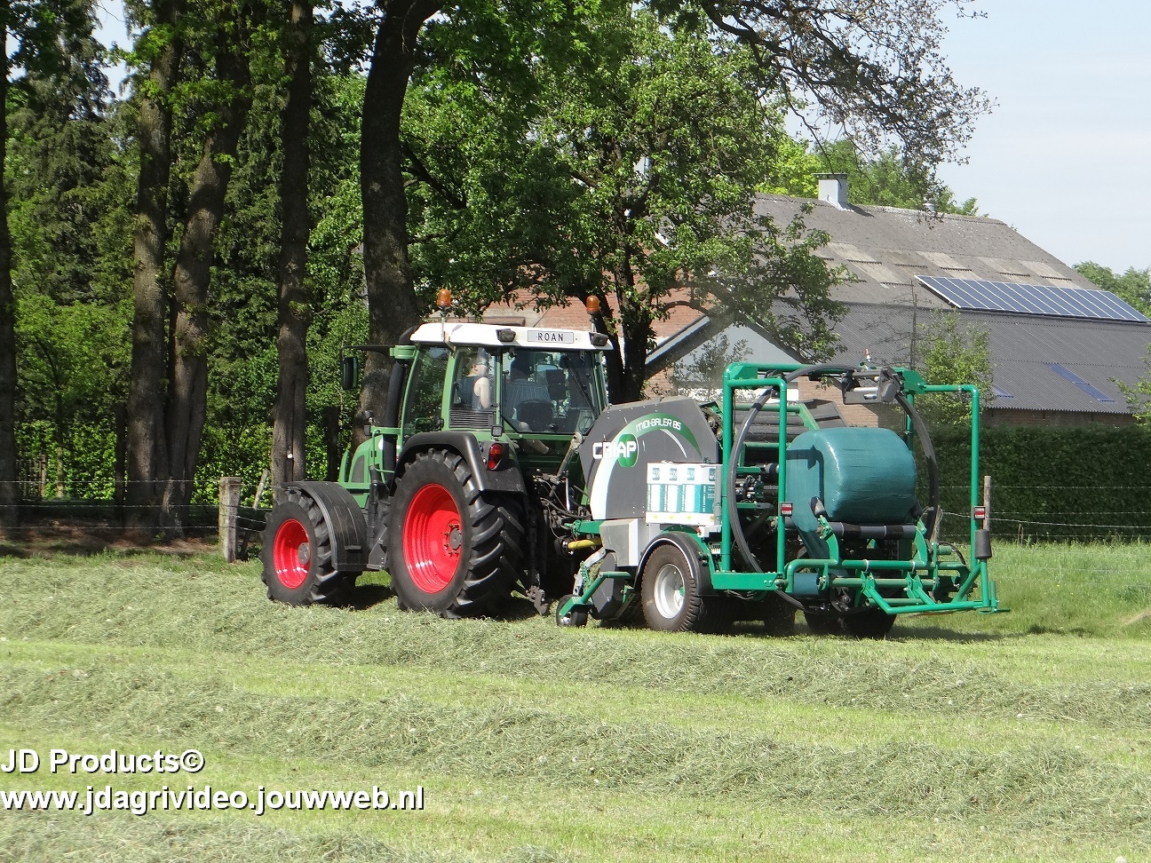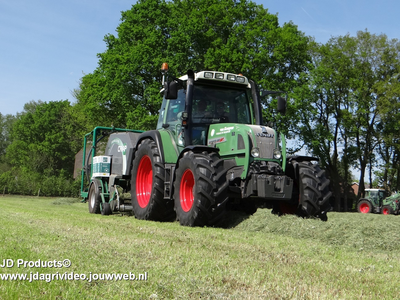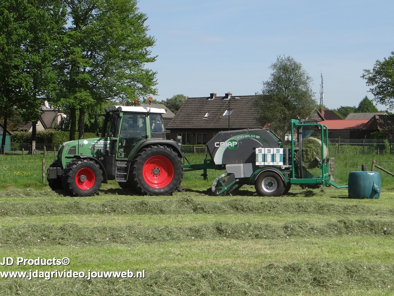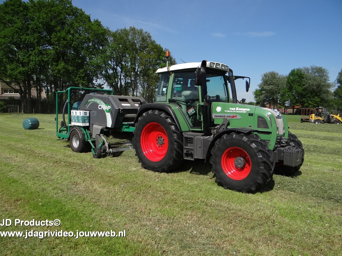 Van Kempen fourage en transport uit Putten aan het midi rondbalen persen en wikkelen in Uddel met een Fendt 410 met een Criap Midi Baler 85
