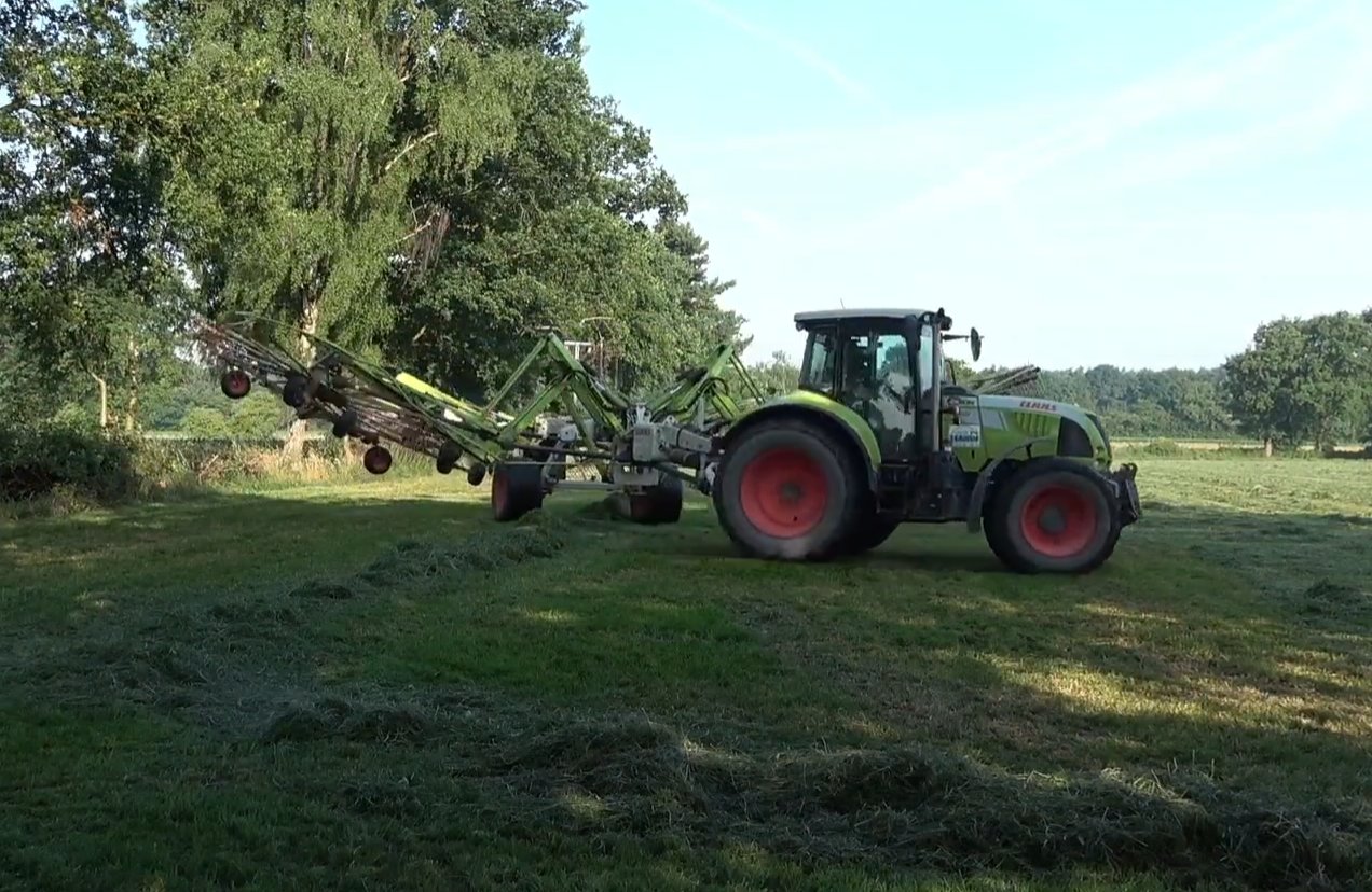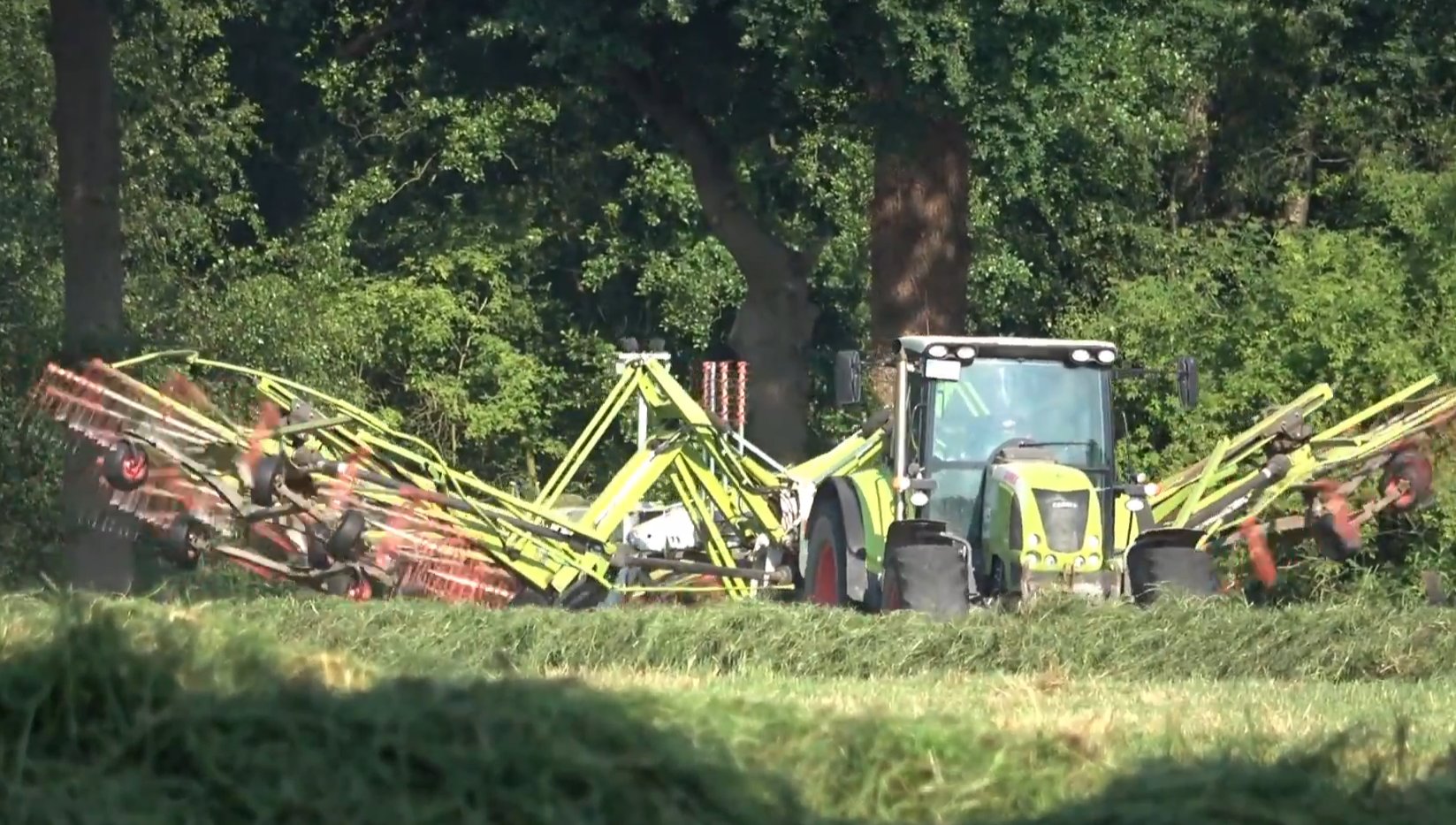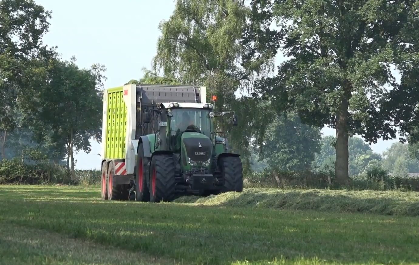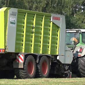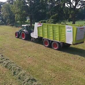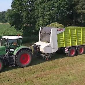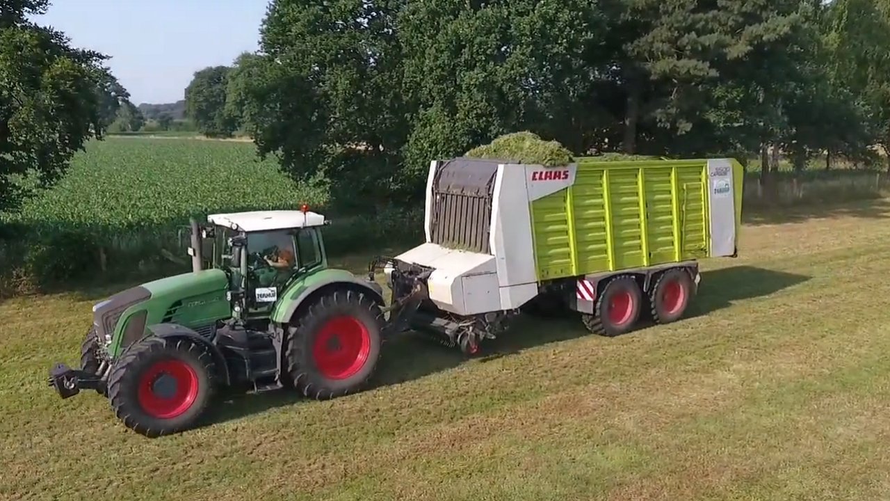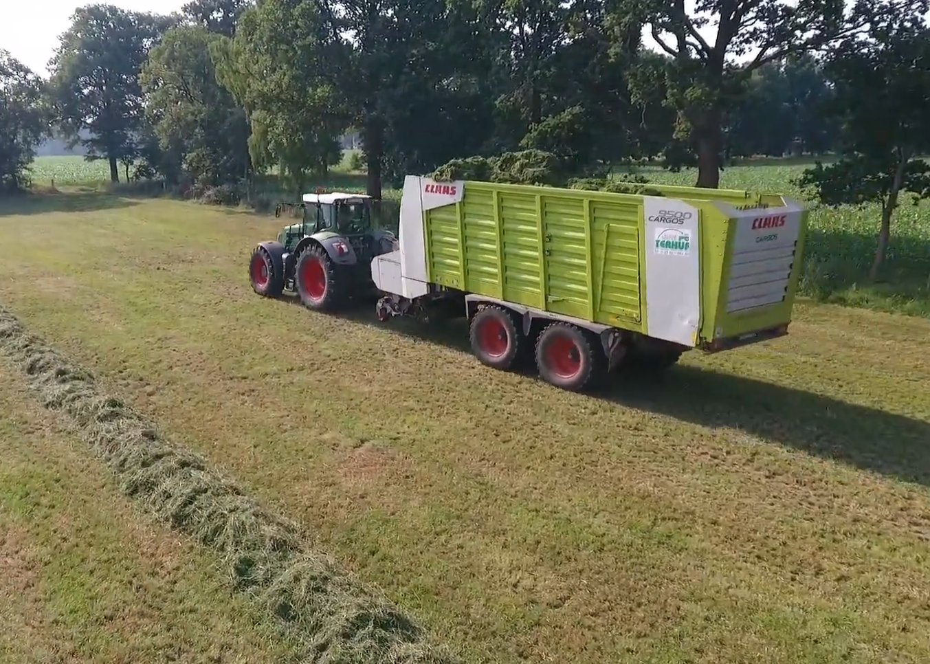 Gras laden met gebruik van een een Fendt 930 met een Claas Cargos 9500. Een Claas Arion met een Claas-hark harken het gras bij elkaar.
