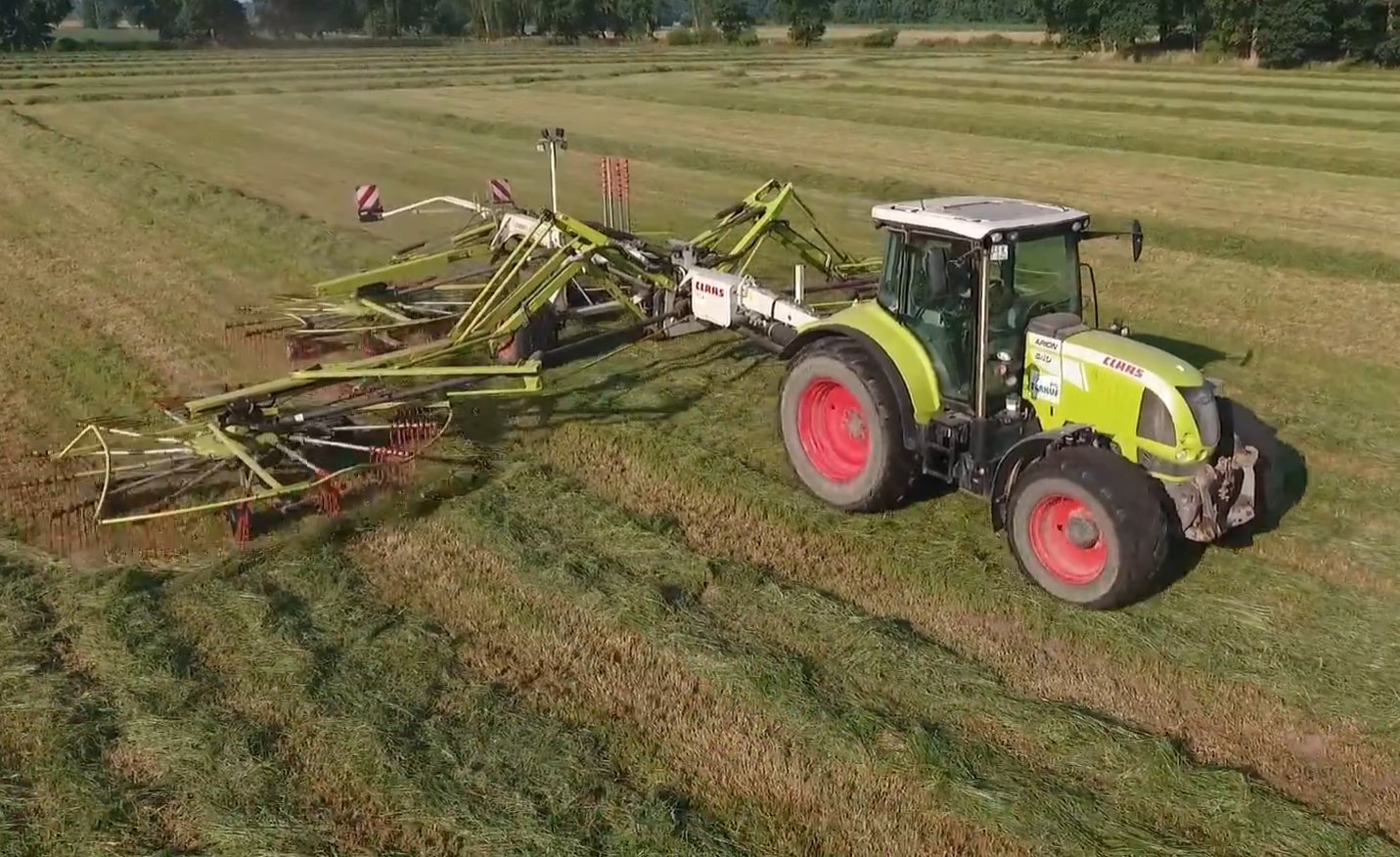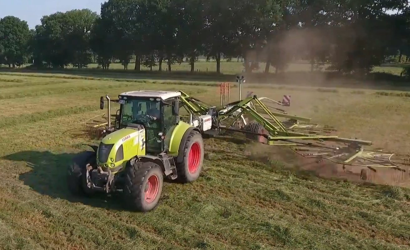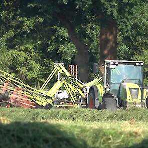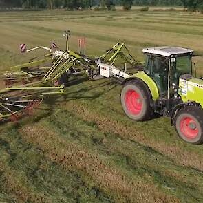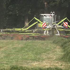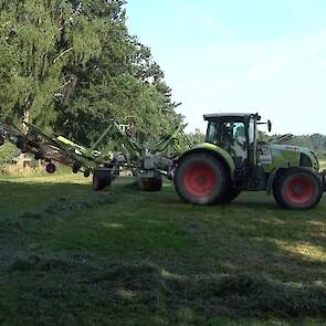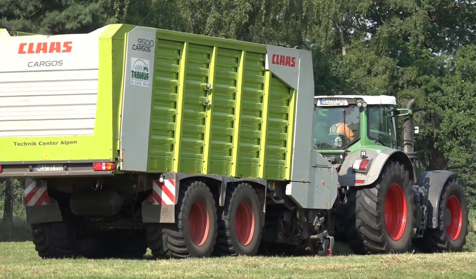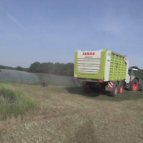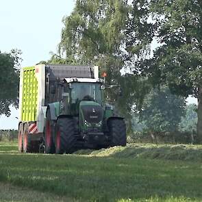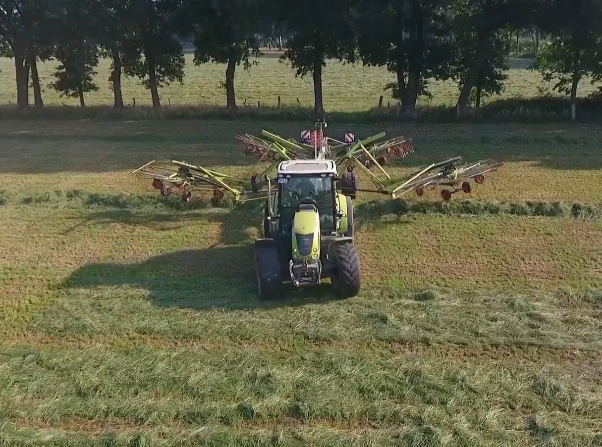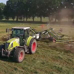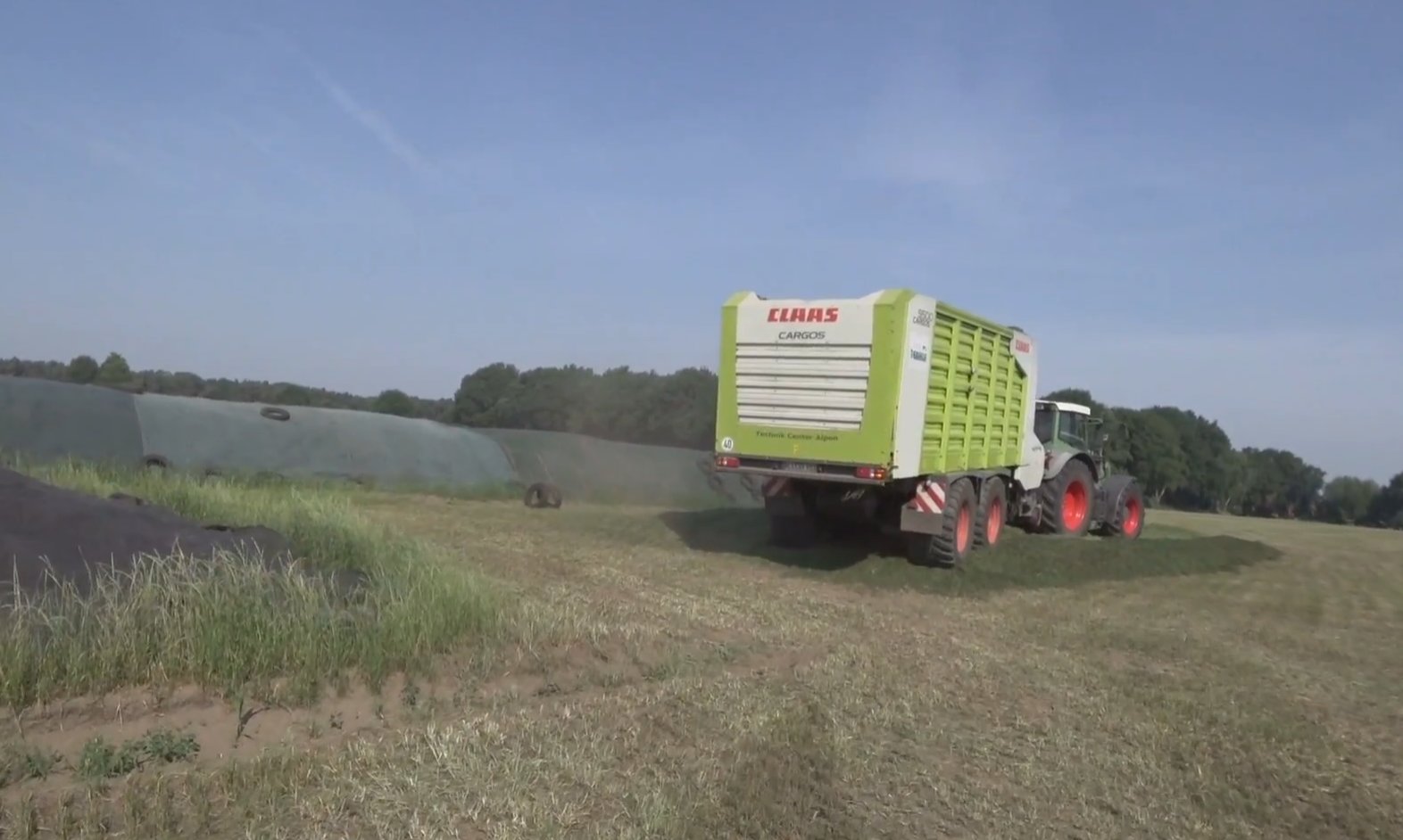 Gras laden met gebruik van een een Fendt 930 met een Claas Cargos 9500. Een Claas Arion met een Claas-hark harken het gras bij elkaar.