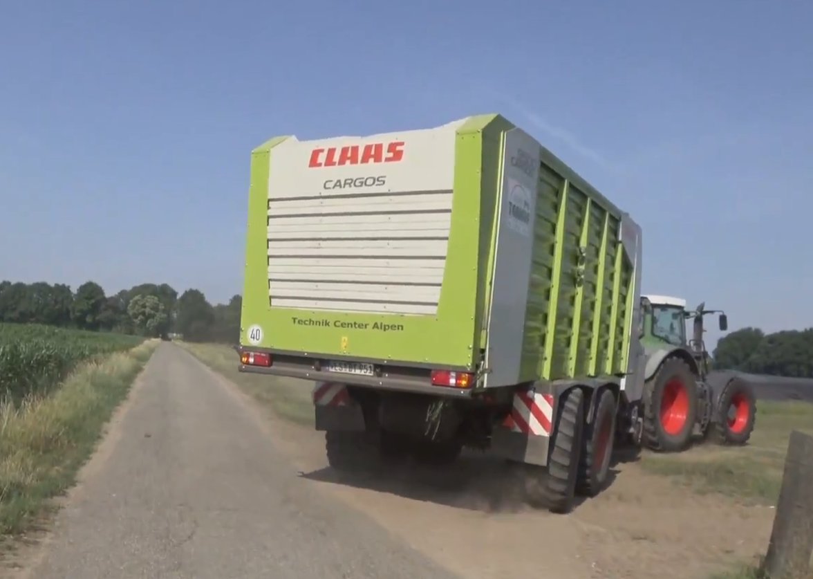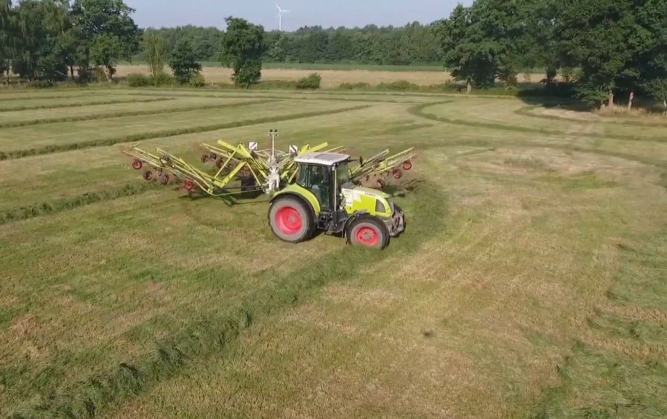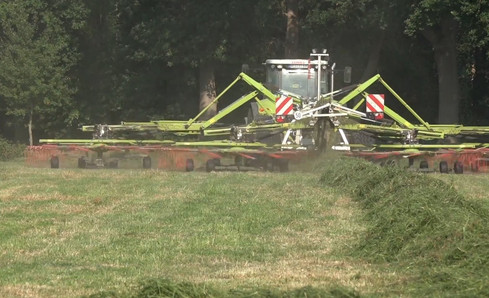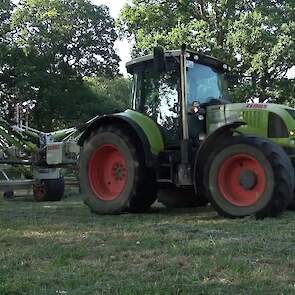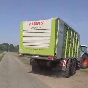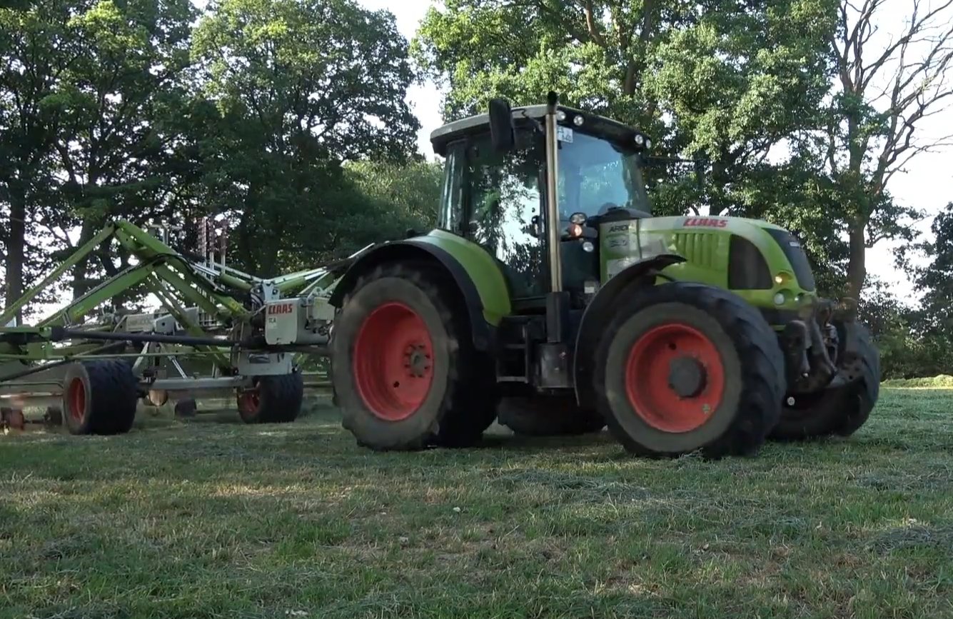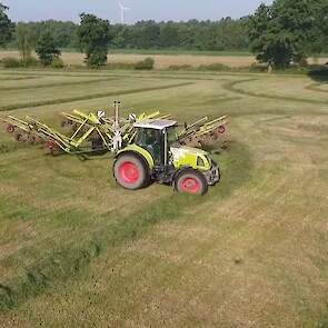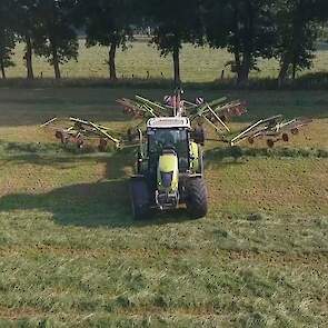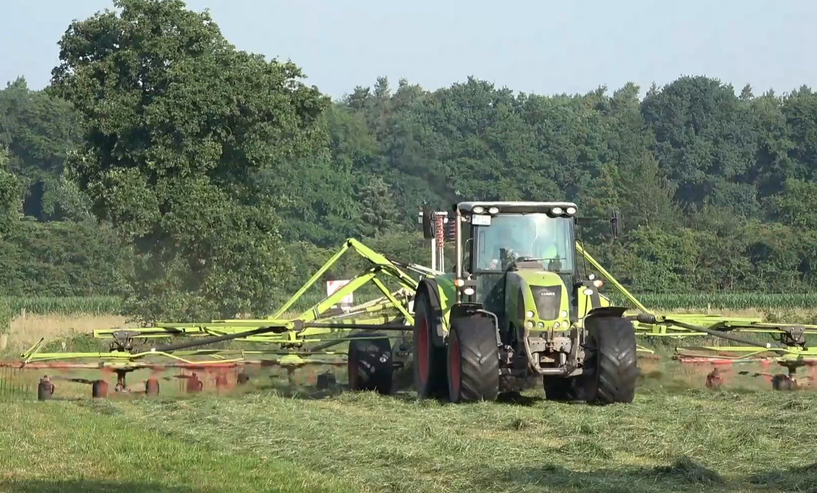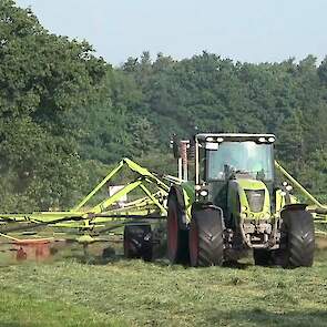 Gras laden met gebruik van een een Fendt 930 met een Claas Cargos 9500. Een Claas Arion met een Claas-hark harken het gras bij elkaar.