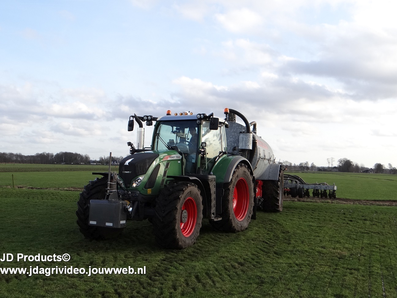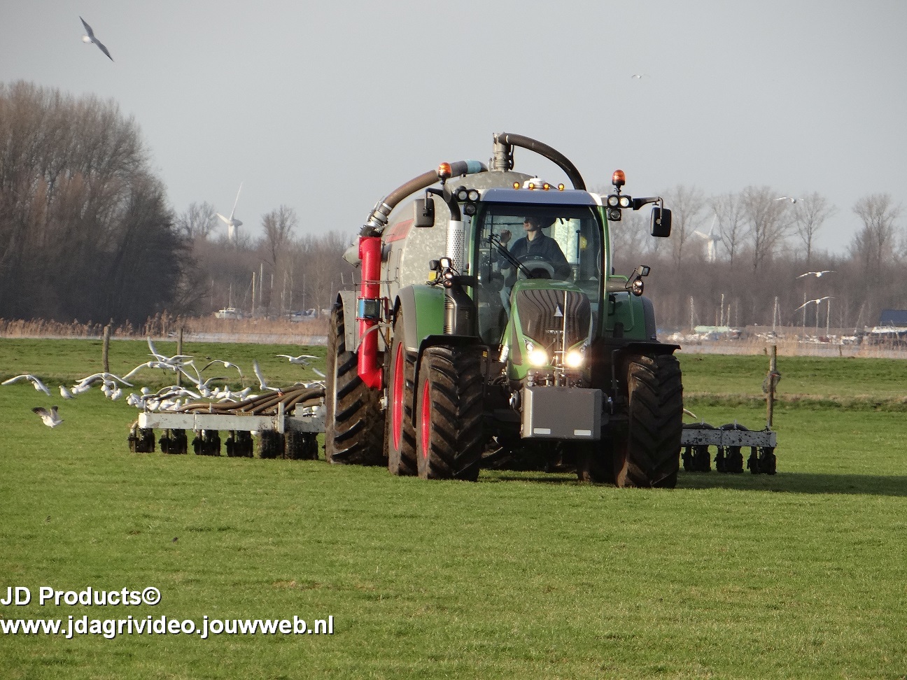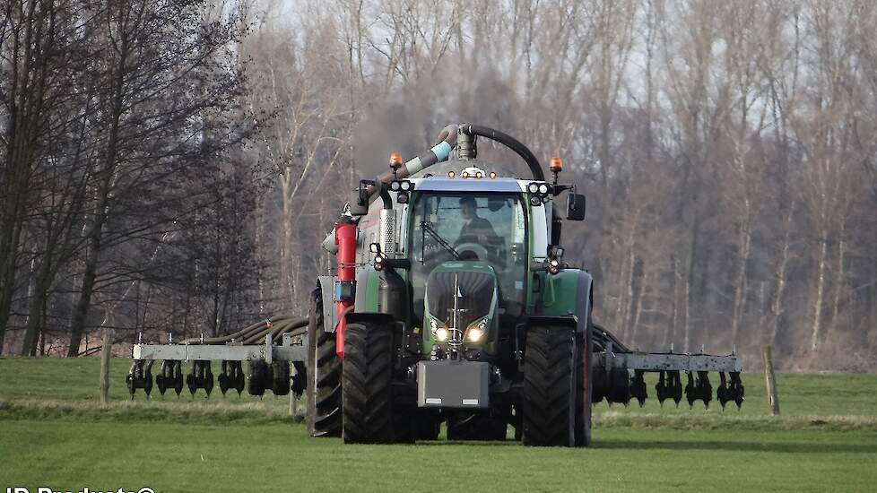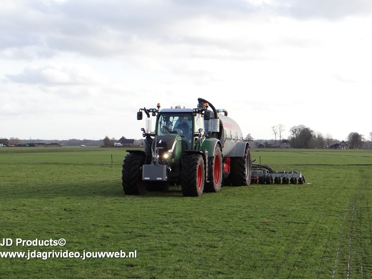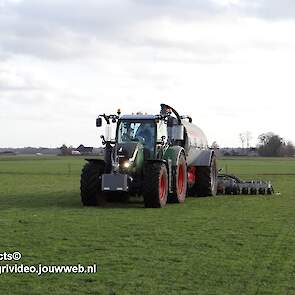 Loonbedrijf Johan Frens uit Hulshorst aan het mest injecteren in Nunspeet met een Fendt 722 met Slootsmid mesttank.