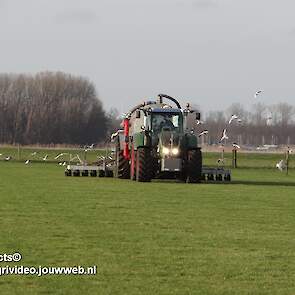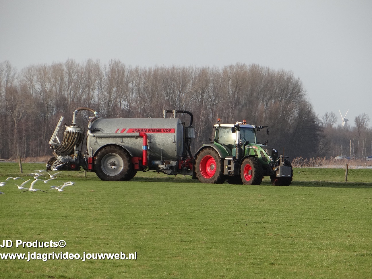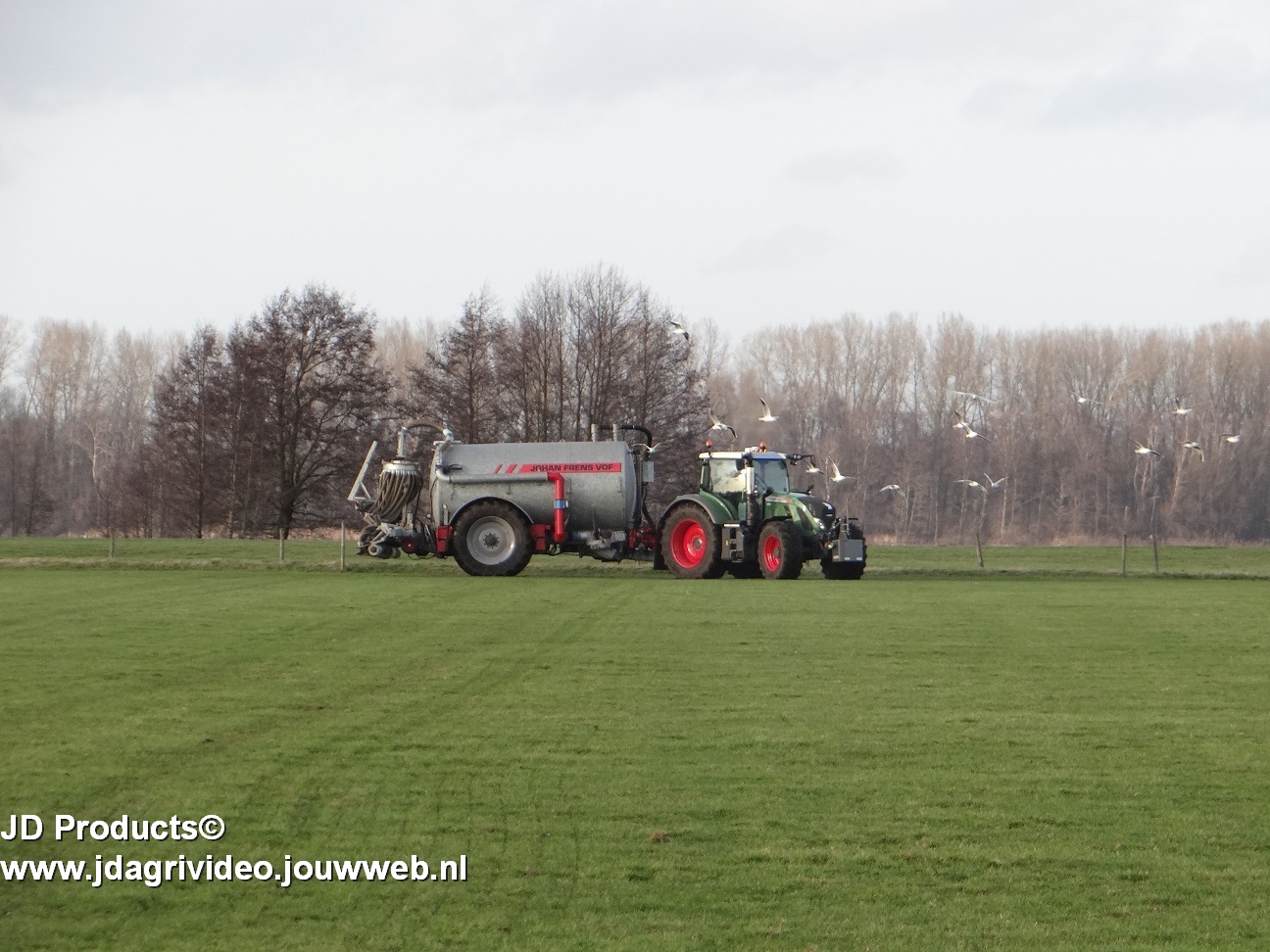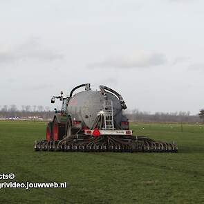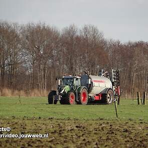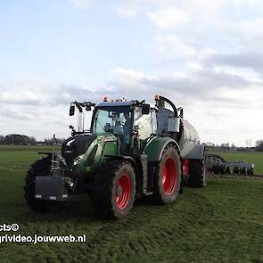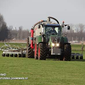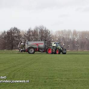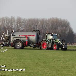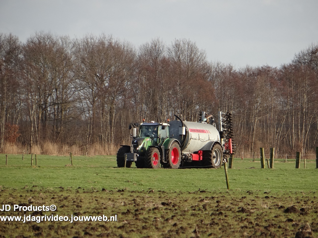 Loonbedrijf Johan Frens uit Hulshorst aan het mest injecteren in Nunspeet met een Fendt 722 met Slootsmid mesttank.