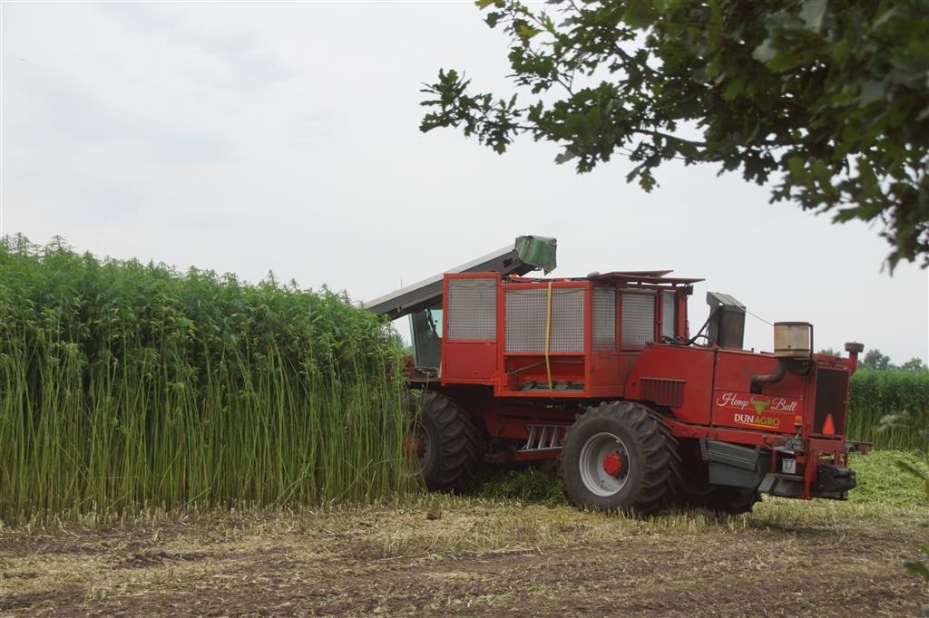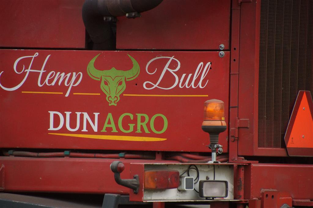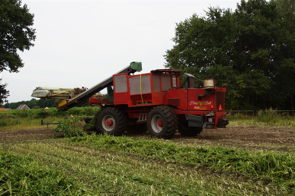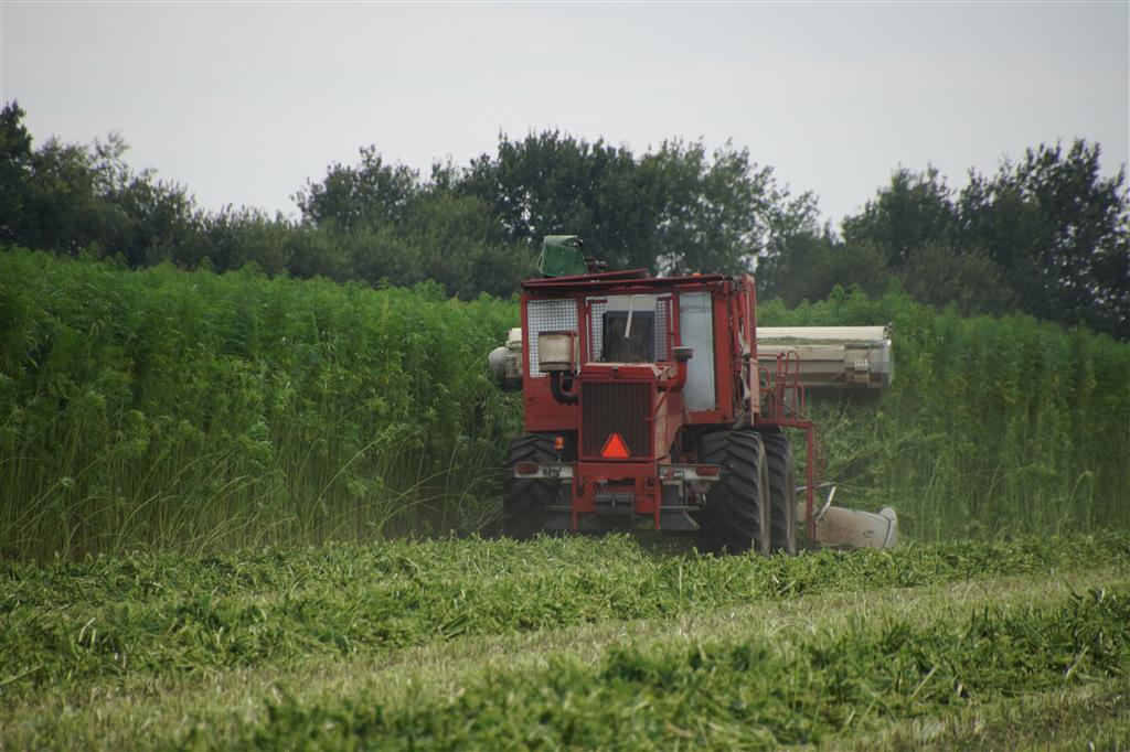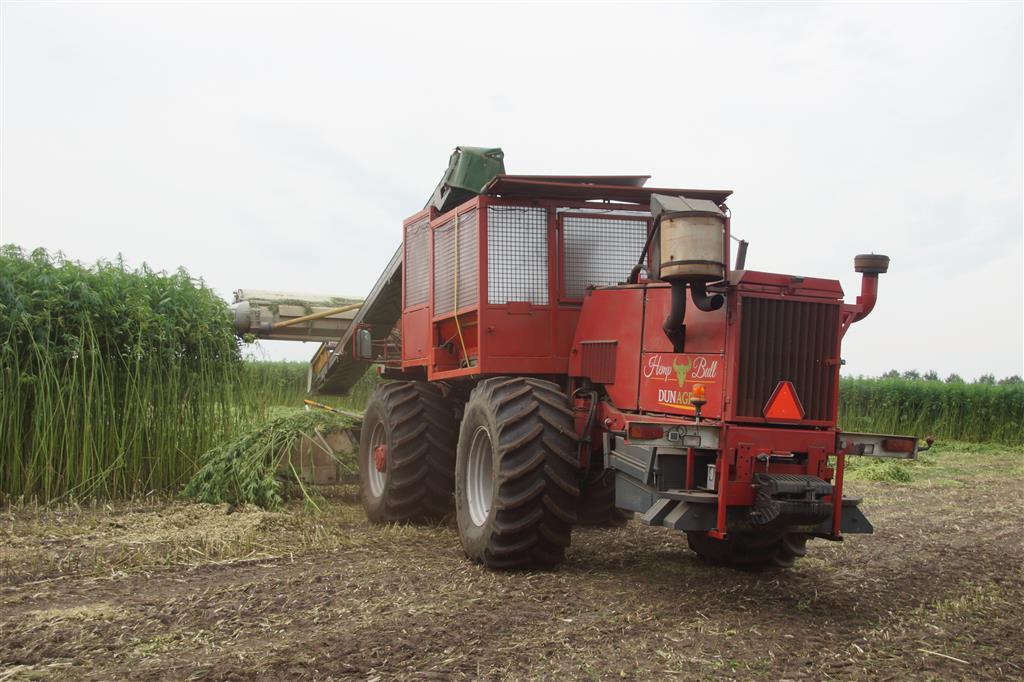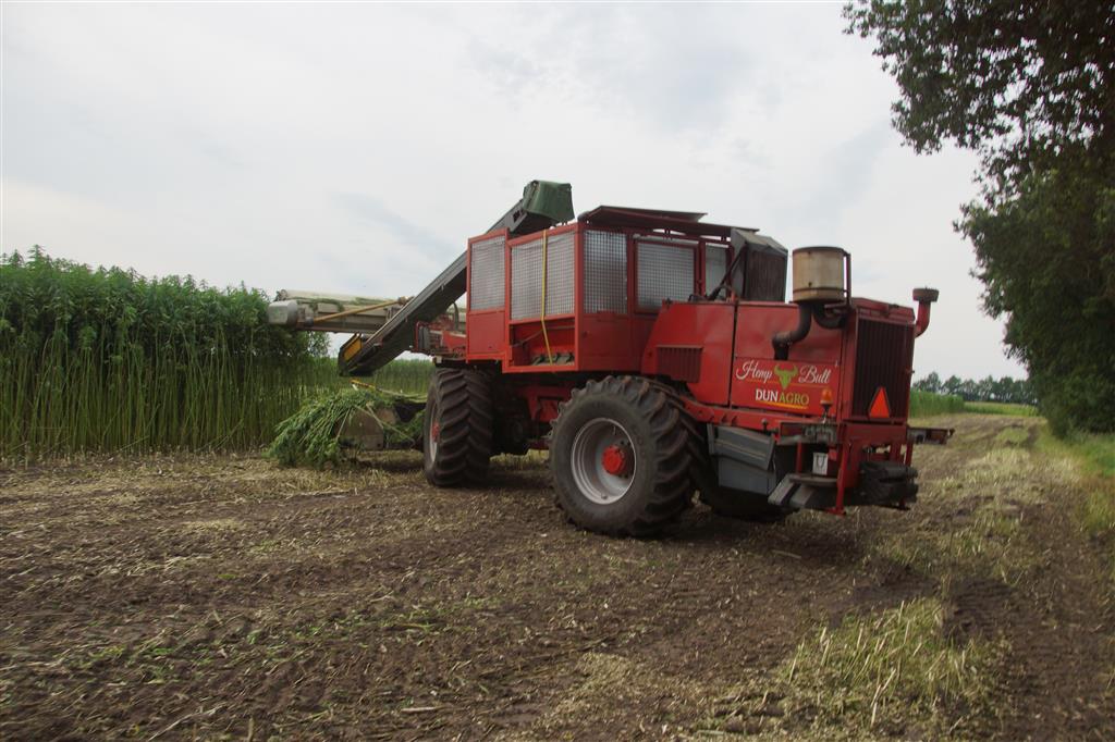 Hier zie we een van de eerst Hemp Bull machine van DunAgro bezig met het maaien van de vezelhennep deze vezel hennep wordt later in allerlei producten verwerkt