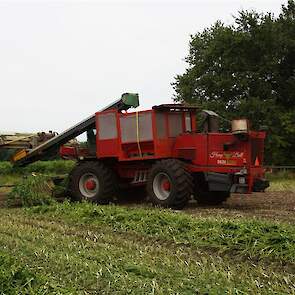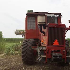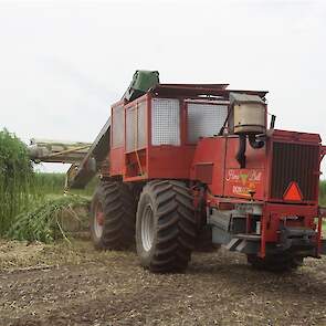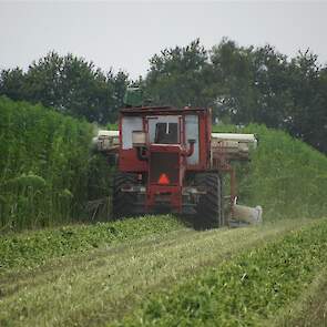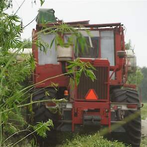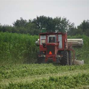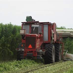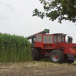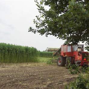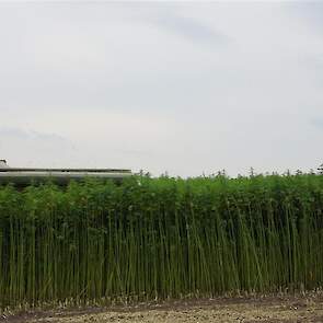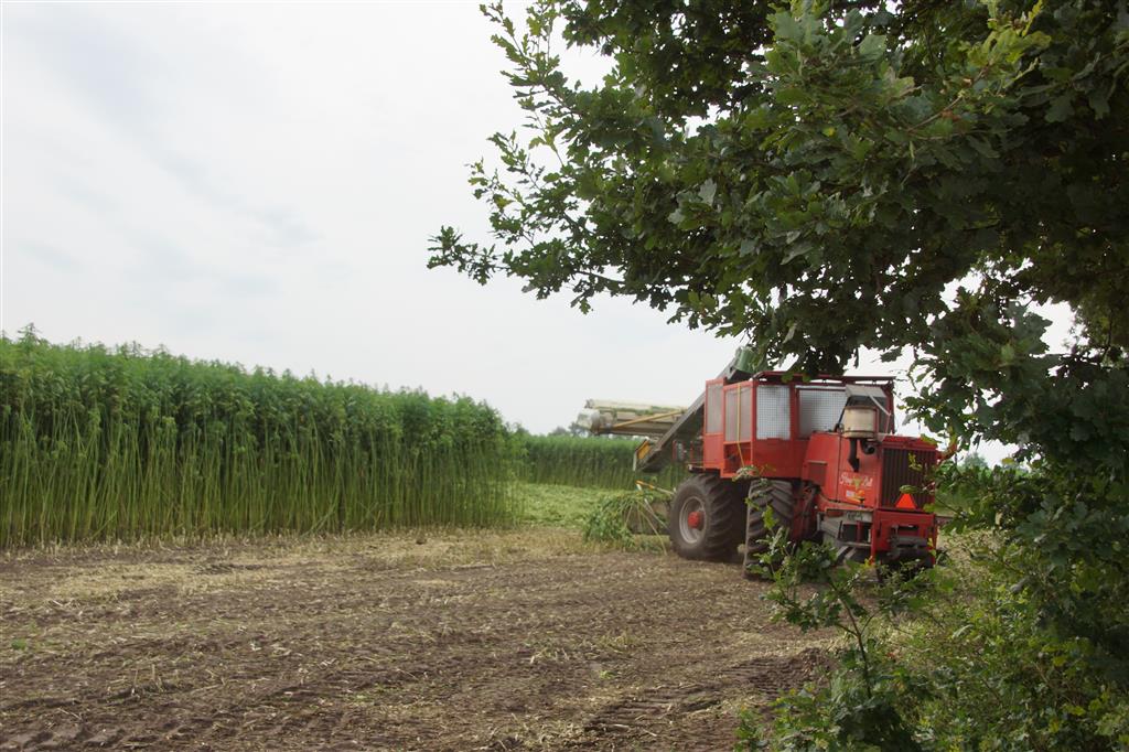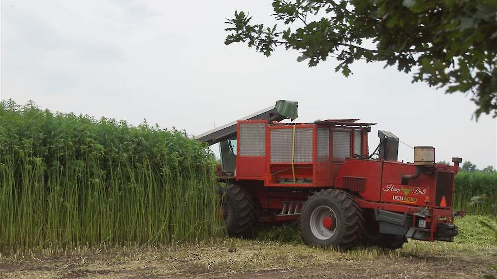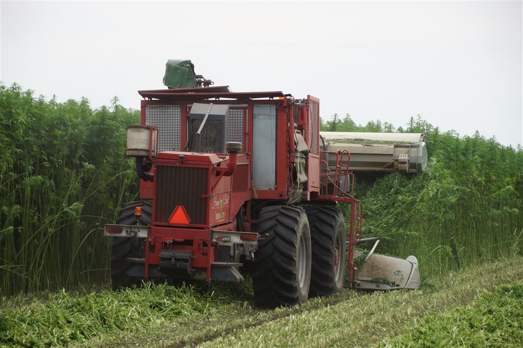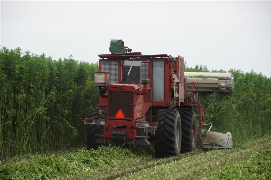 Hier zie we een van de eerst Hemp Bull machine van DunAgro bezig met het maaien van de vezelhennep deze vezel hennep wordt later in allerlei producten verwerkt