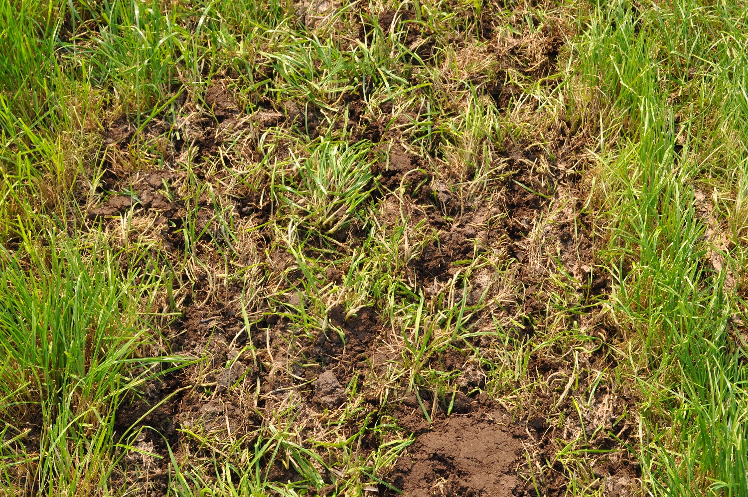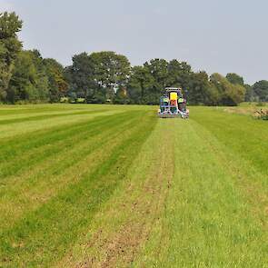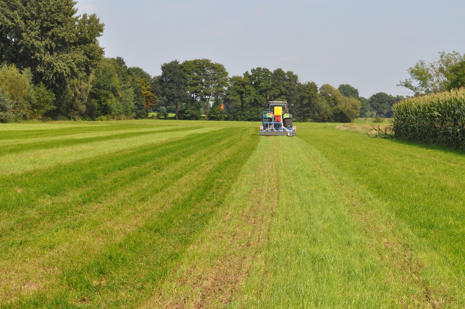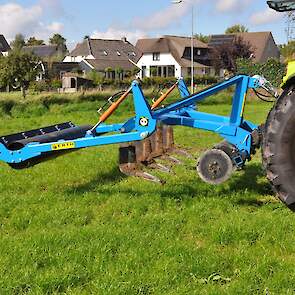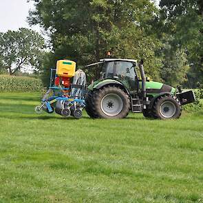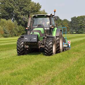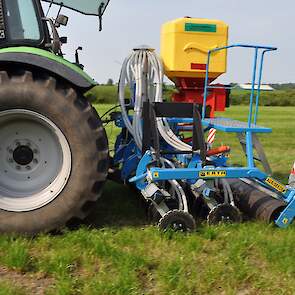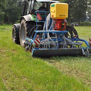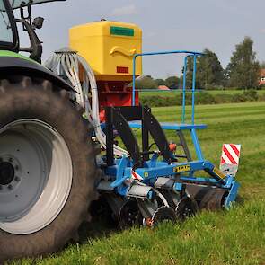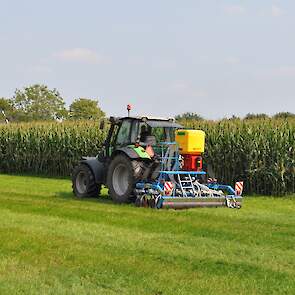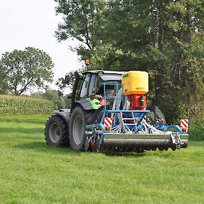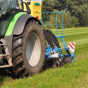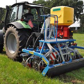 Op de fotos wordt een mengsel van gras/klaver gezaaid in de graszode.