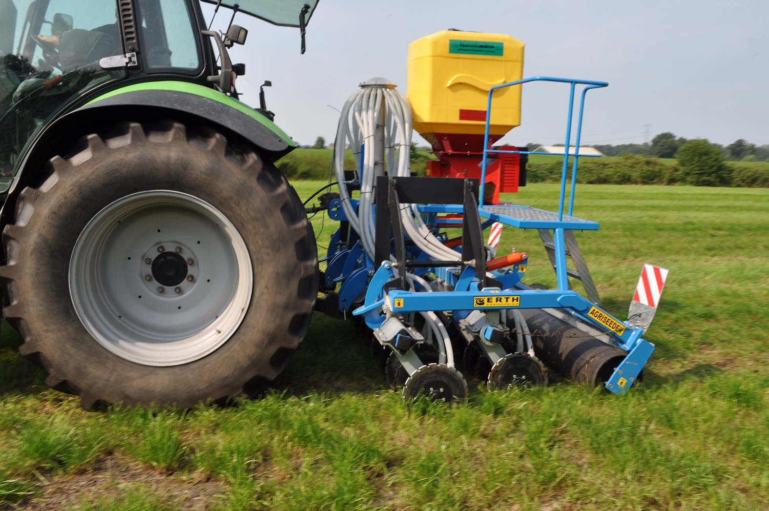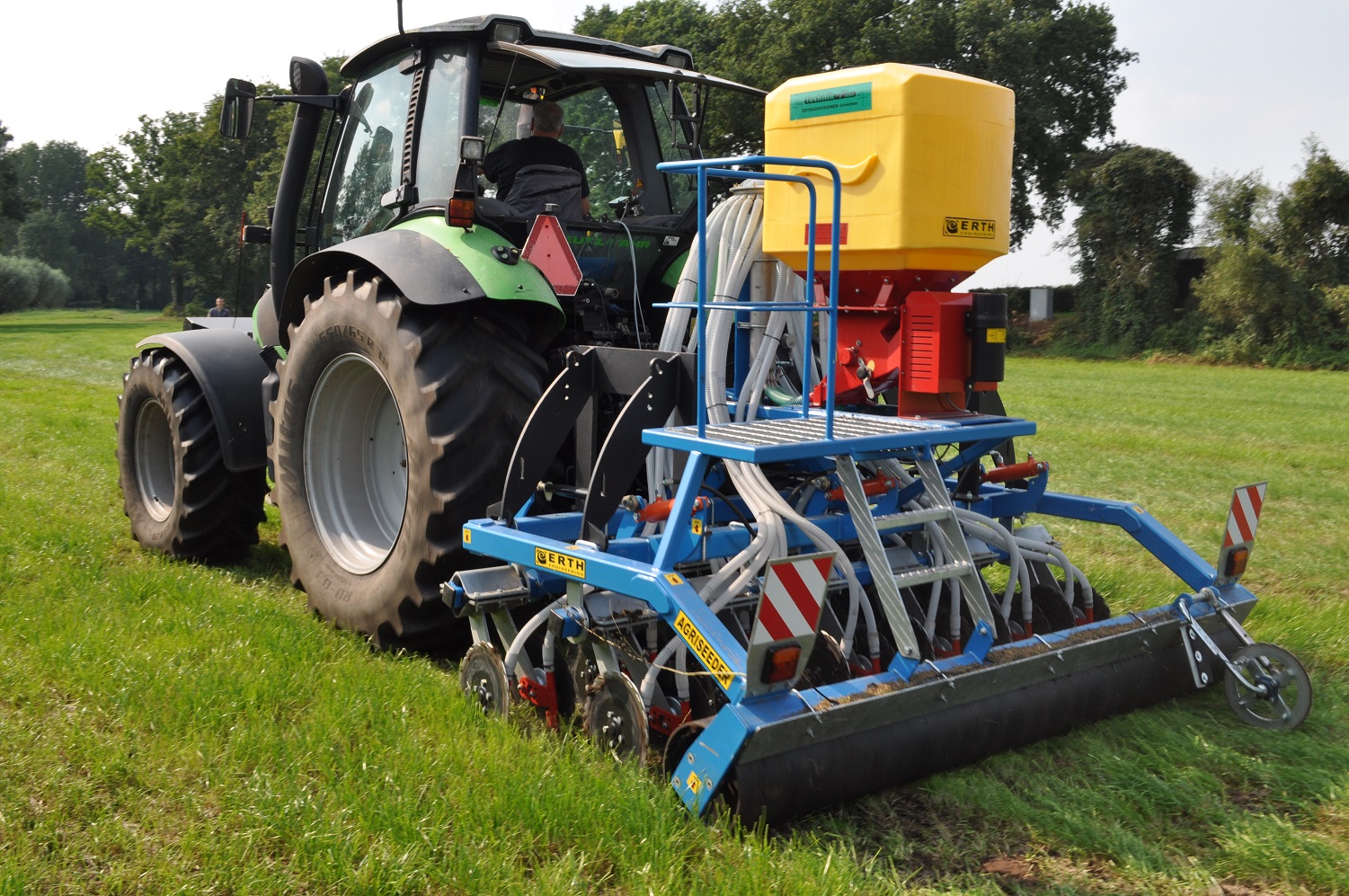 De uit Ierland afkomstige ERTH Agriseeder is een doorzaaimachine ontwikkelt vanuit de praktijk. Op dit moment heeft het bedrijf een 3 meter en een 4 meter hydraulisch opklapbare machine in het programma. Voor de toekomst staat ook een 6 meter brede uitvoering op de planning, met nog een aantal andere interessante opties. De 3 meter machine heeft 24 rijen en is prima geschikt voor het doorzaaien in een bestaande zode. De enkele schijfkouters staan onder een hoek en maken hierdoor een perfect kruimelig zaaibed zodat het graszaad ideaal kan ontkiemen. De schijven zijn gemonteerd in twee rijen waardoor er veel ruimte in de machine zit zodat deze niet snel verstopt. Hierdoor is de machine ook geschikt voor het zaaien van graan of een groenbemesters direct in de stoppel. Op diverse plekken ter wereld is er al veel ervaring met de machines en worden deze succesvol ingezet.