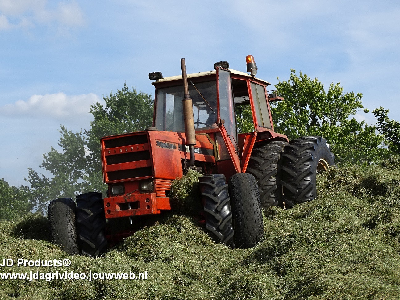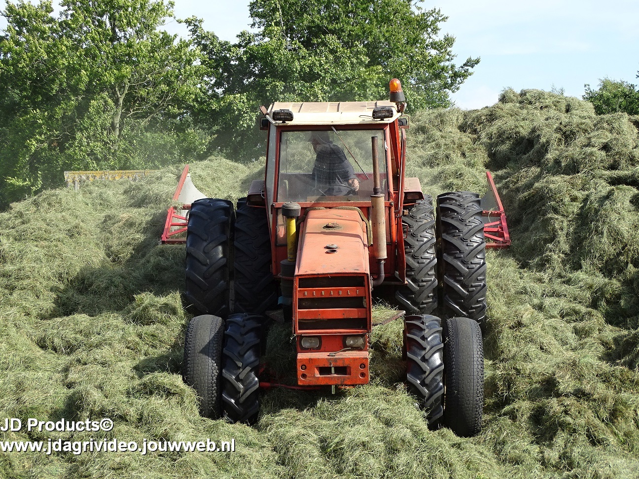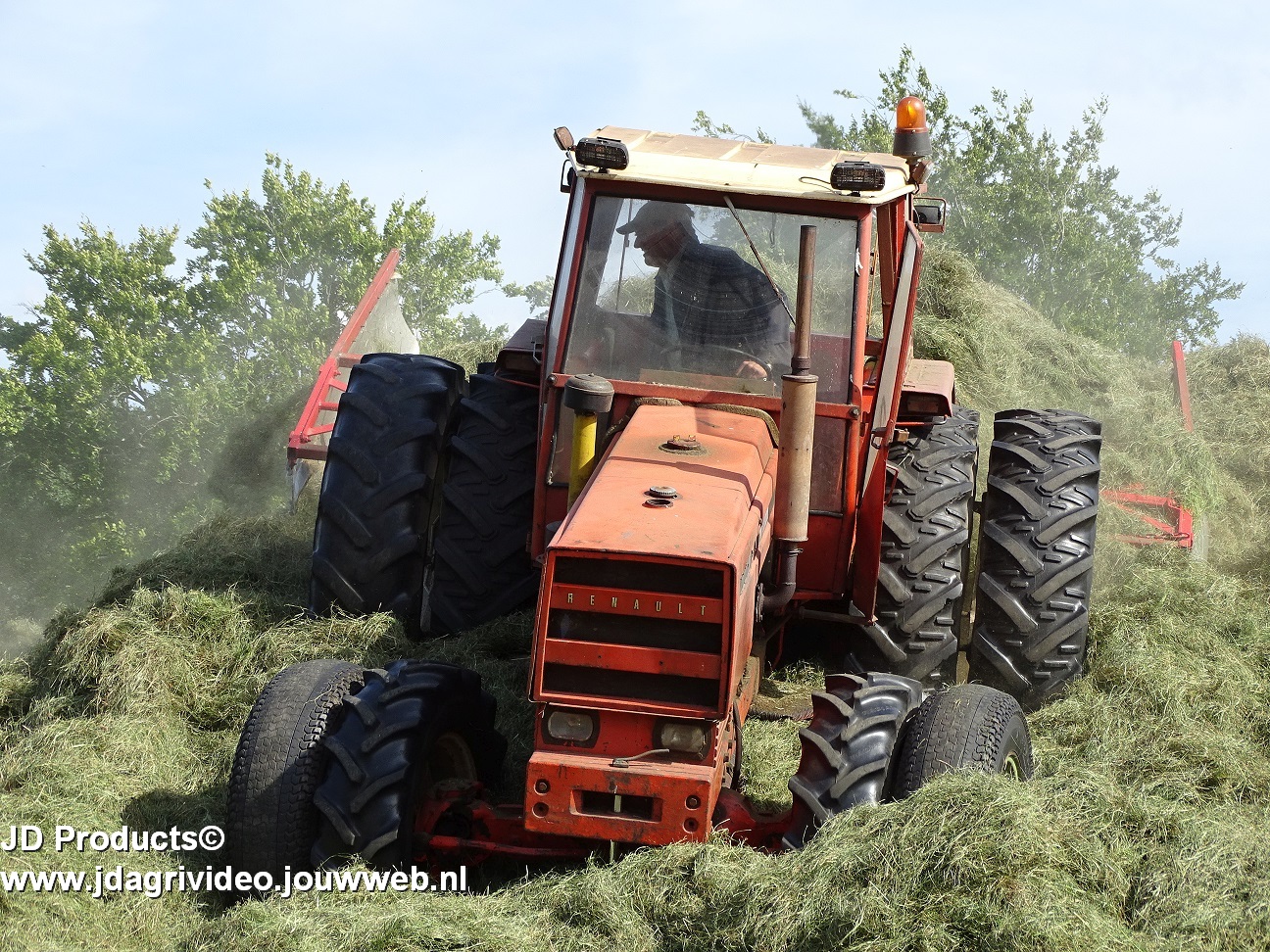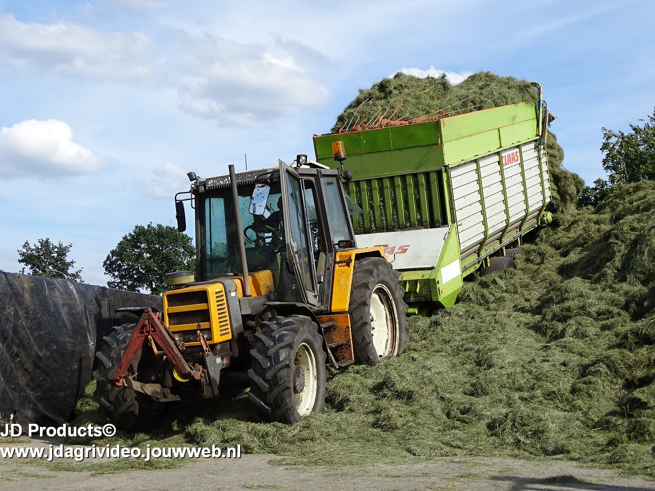 Melkveehouder Karzijn uit Doornspijk aan het gras inkuilen met een Renault 103.14 met een Claas Sprint 445 P. Op de kuil een Renault 498