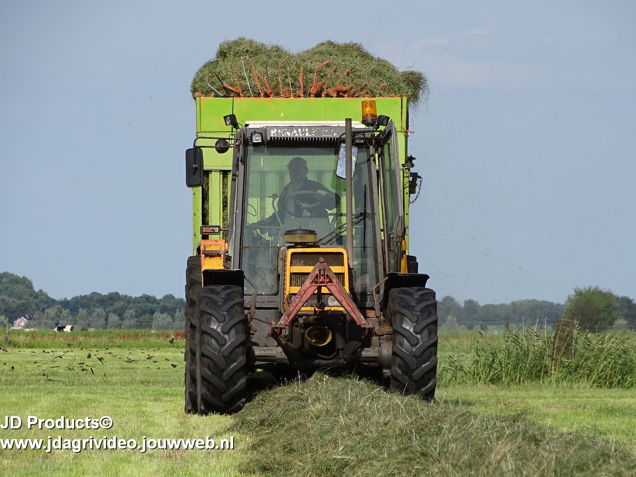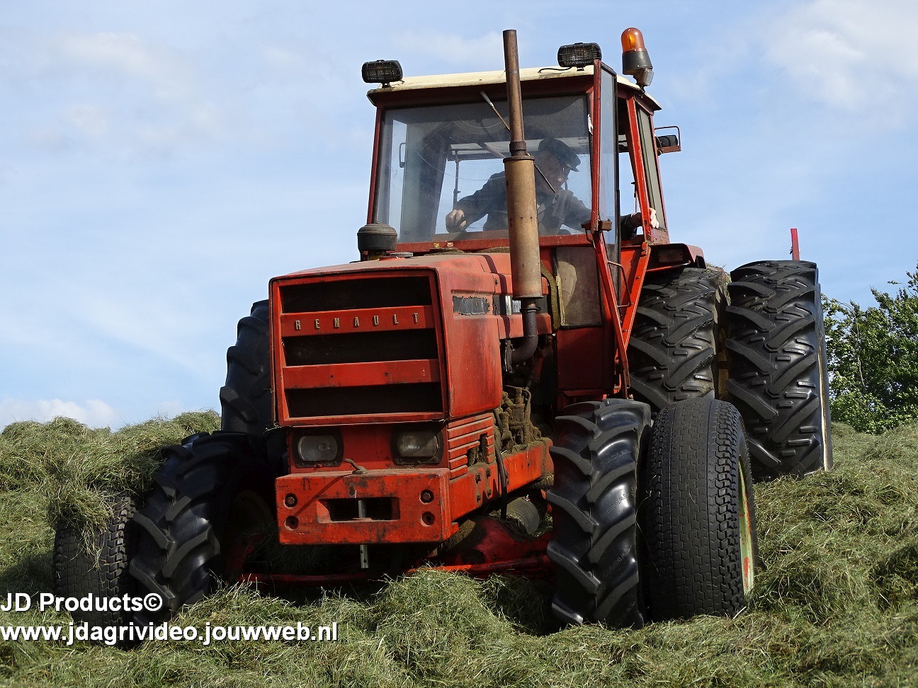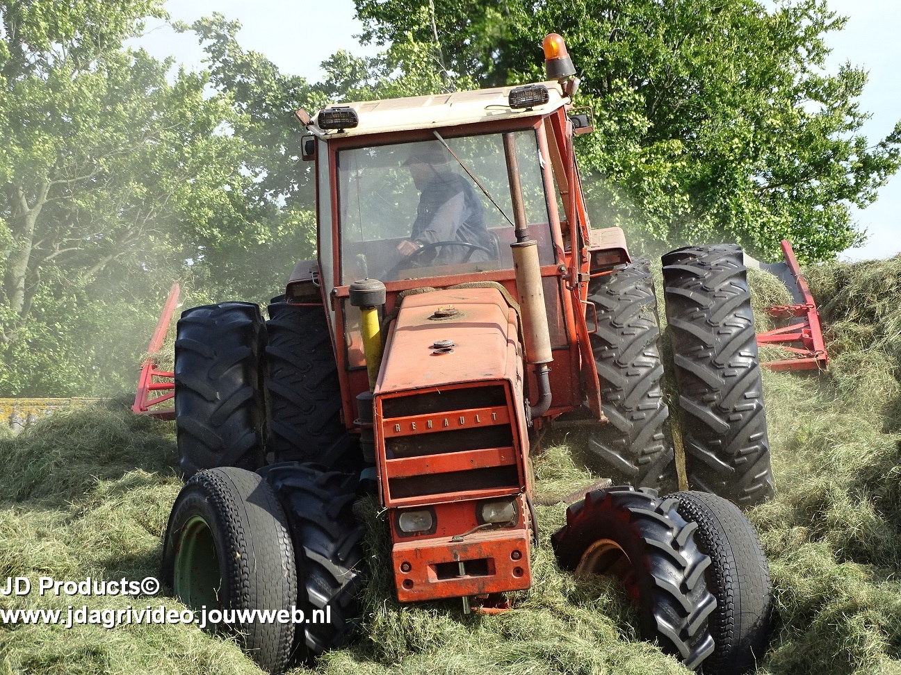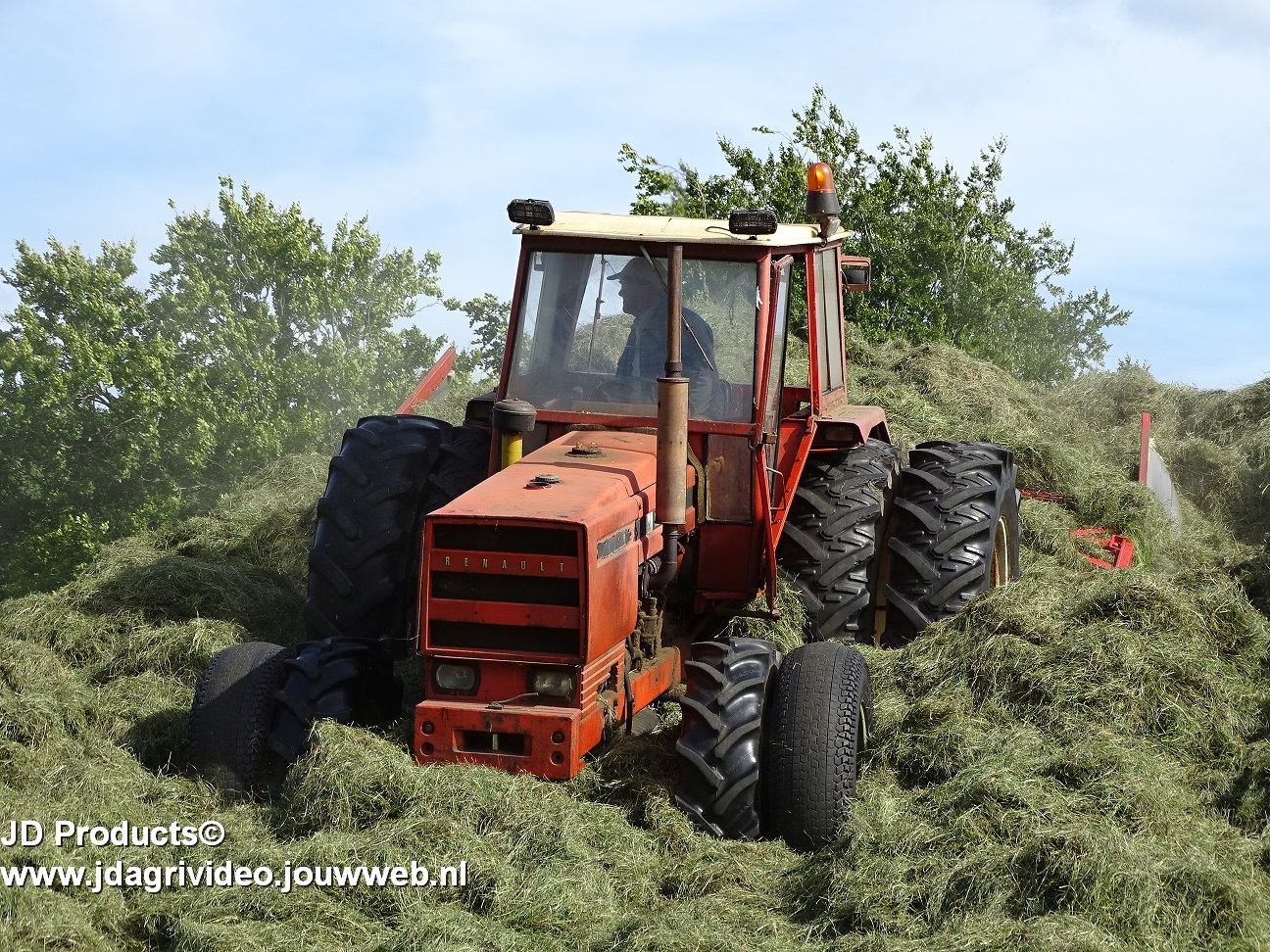 Melkveehouder Karzijn uit Doornspijk aan het gras inkuilen met een Renault 103.14 met een Claas Sprint 445 P. Op de kuil een Renault 498