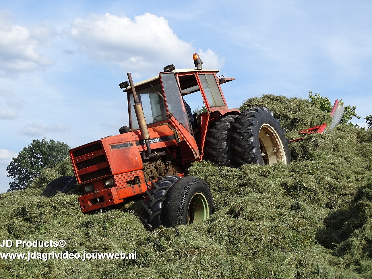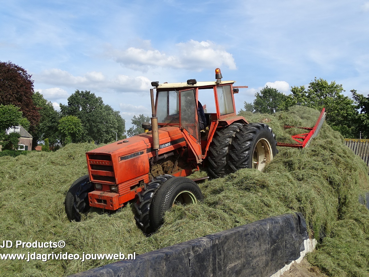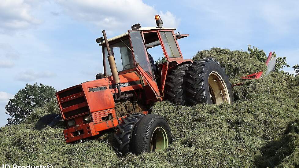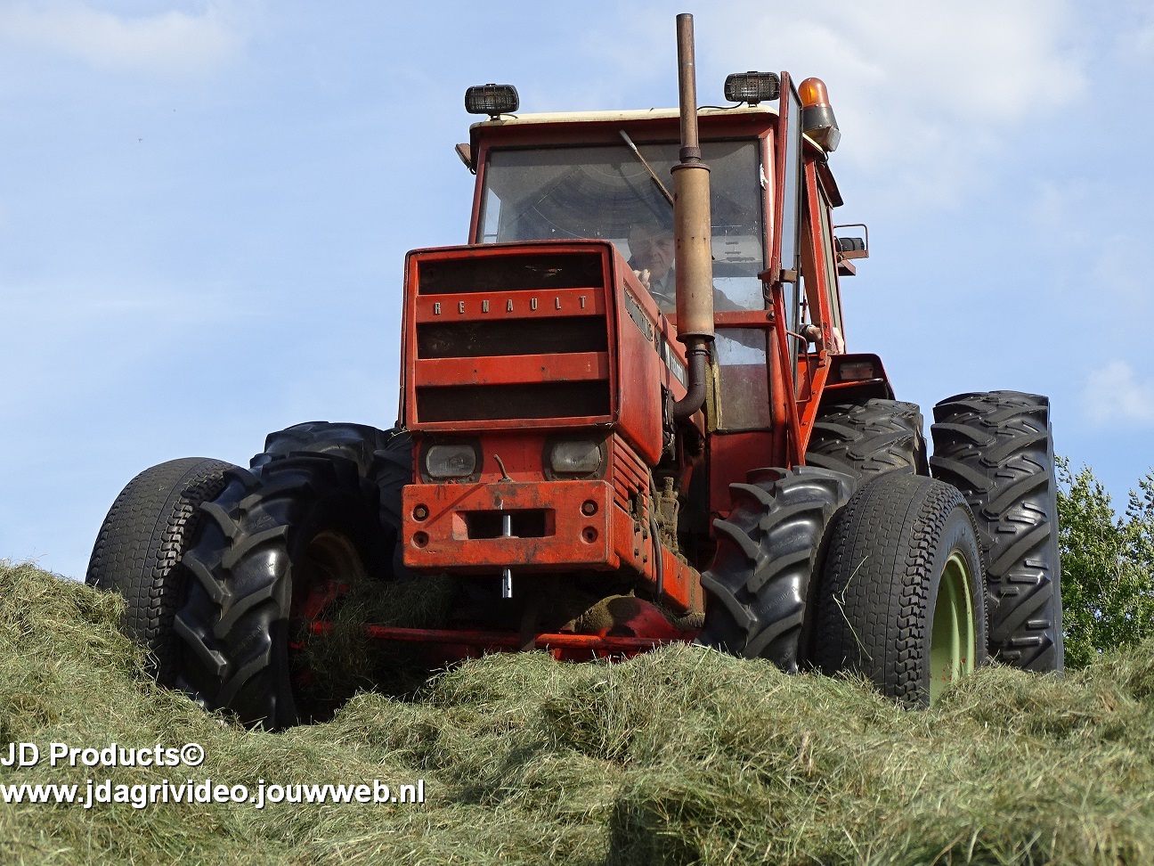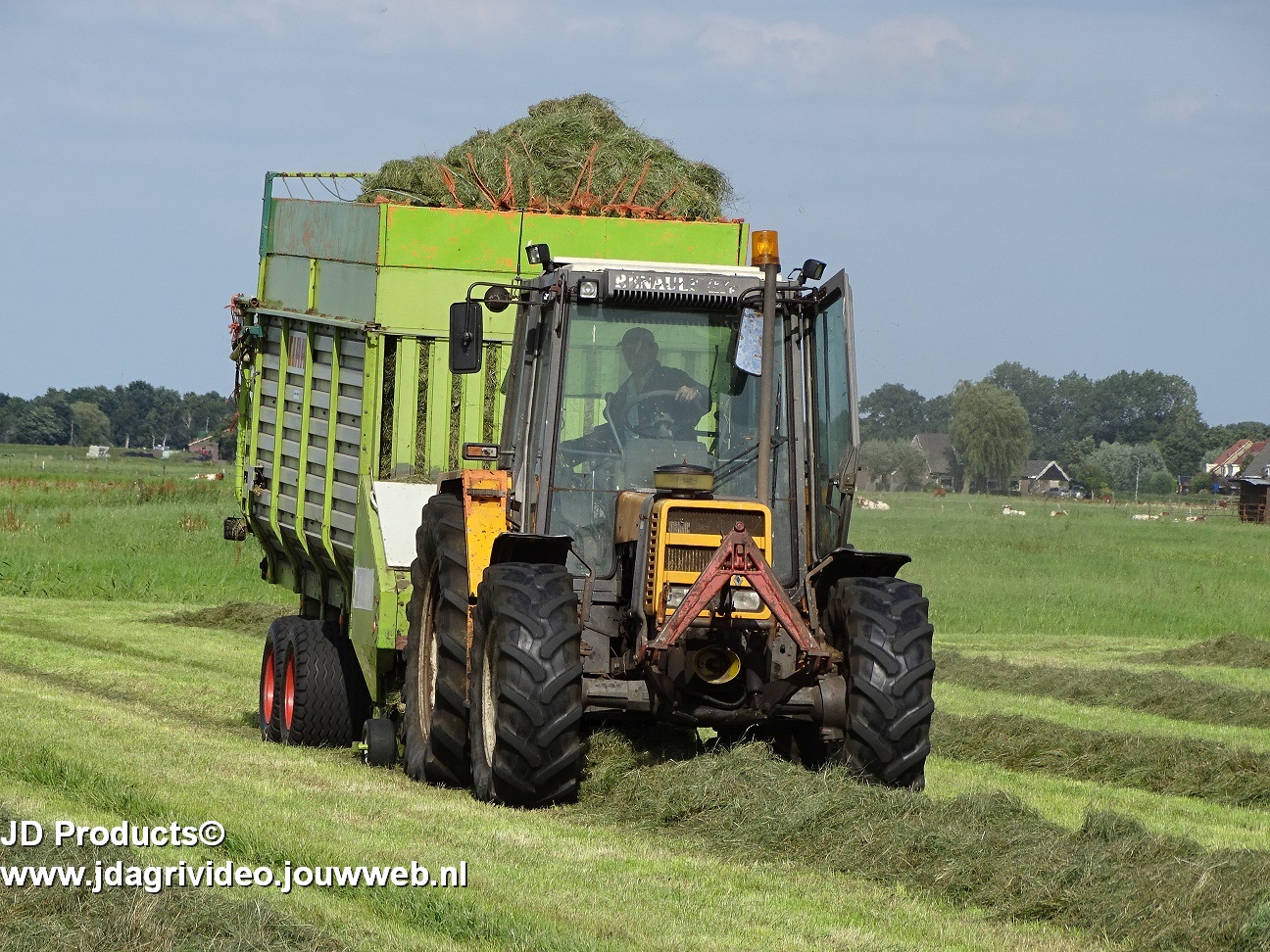 Melkveehouder Karzijn uit Doornspijk aan het gras inkuilen met een Renault 103.14 met een Claas Sprint 445 P. Op de kuil een Renault 498