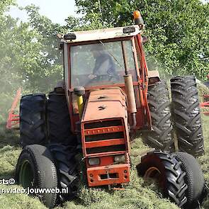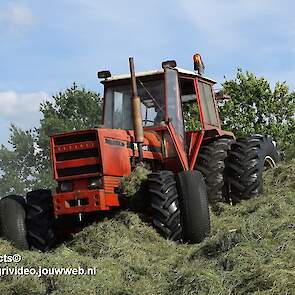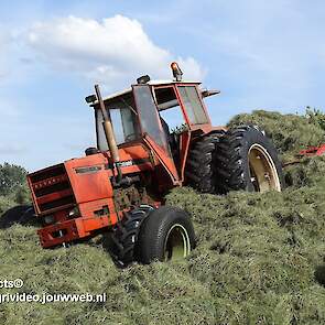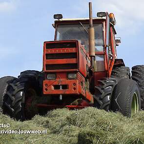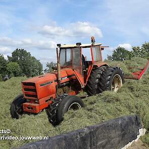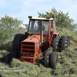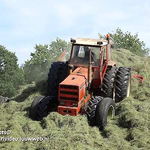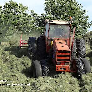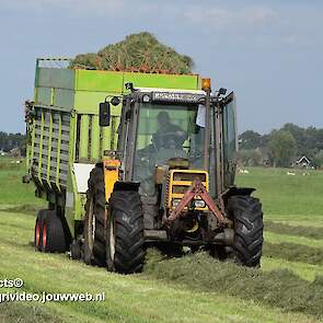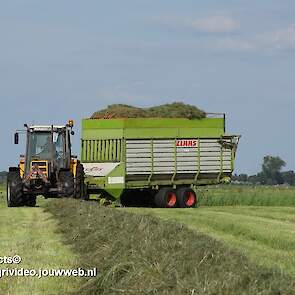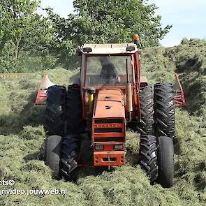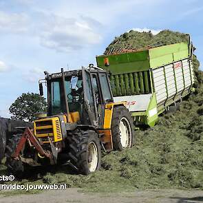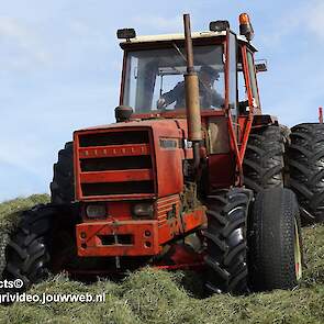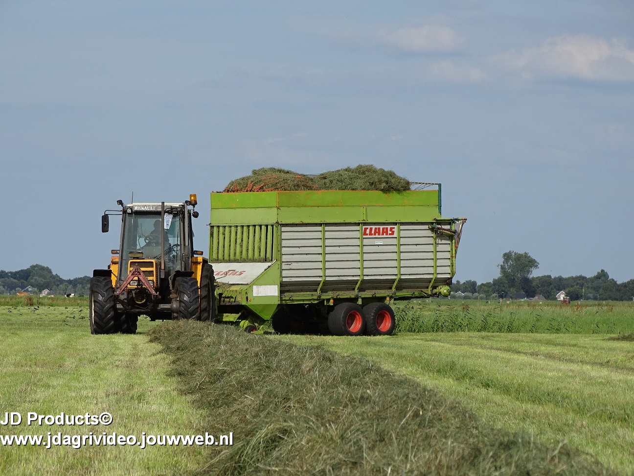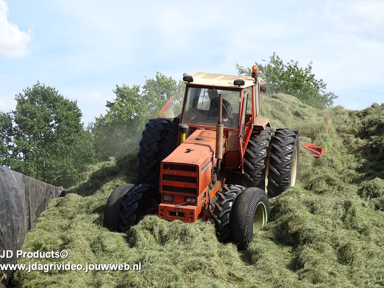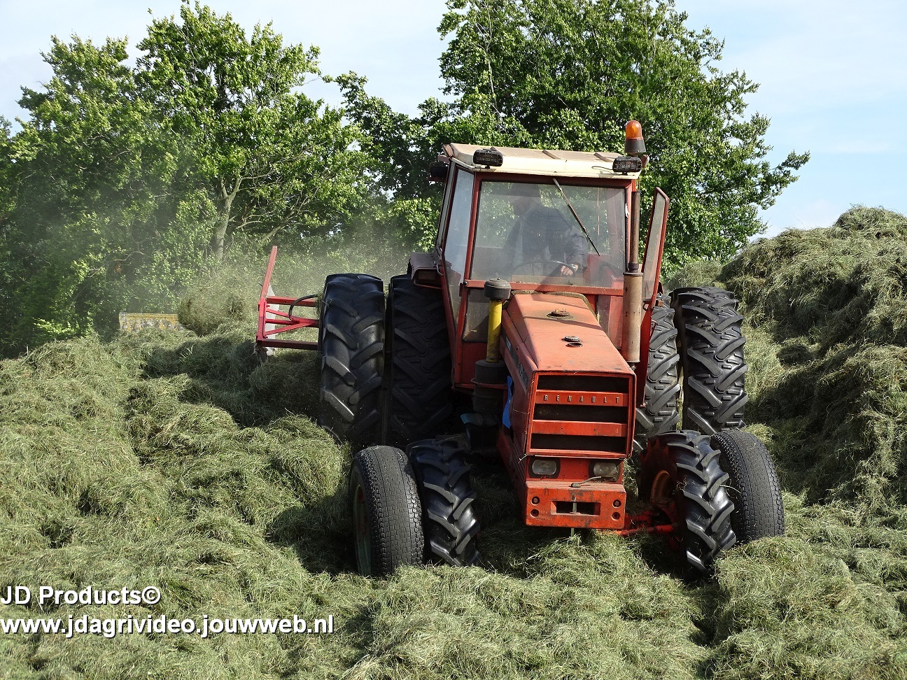 Melkveehouder Karzijn uit Doornspijk aan het gras inkuilen met een Renault 103.14 met een Claas Sprint 445 P. Op de kuil een Renault 498