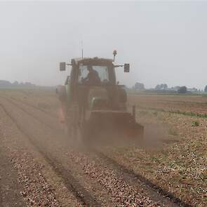 Stof happen bij roze uien rooien in het zwad door Siebring Akkerbouw Trekkerweb