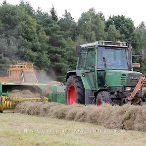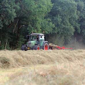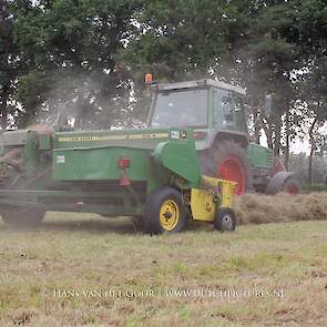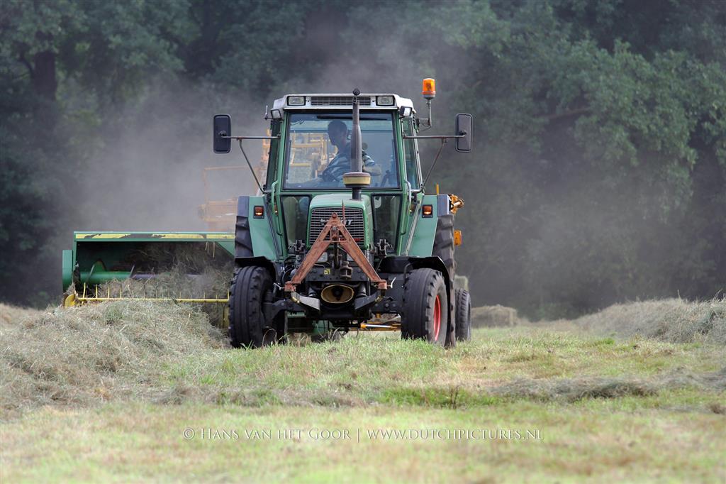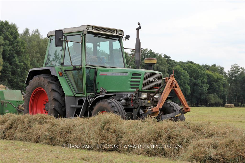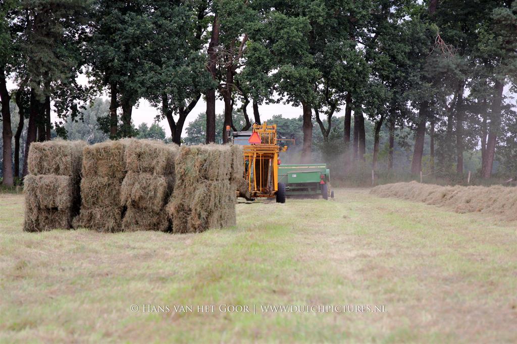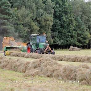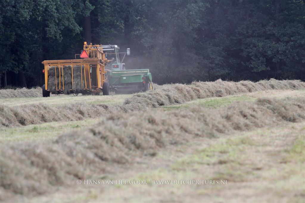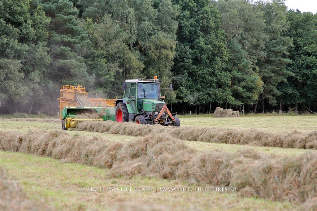 Kleine hooibalen persen op landgoed Staverden. We zien veehouder Jan Overeem van boerderij Meerhoeve uit Uddel met een Fendt Farmer 308 LS met John Deere 456 A balenpers en een Hack SK 24 P balenverzamelaar. Het hooi wordt bij elkaar geharkt met door een Fendt 412 met Lely hark.