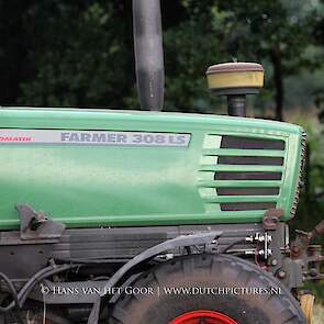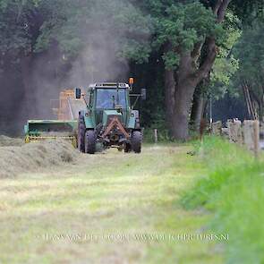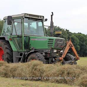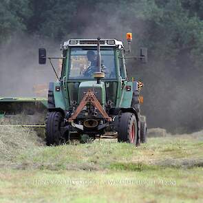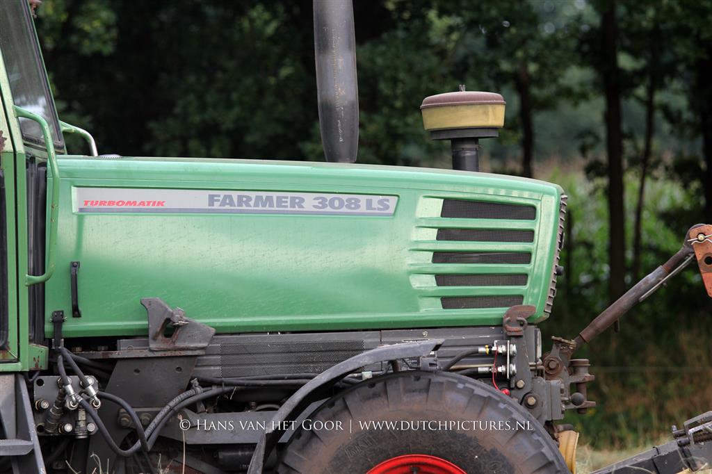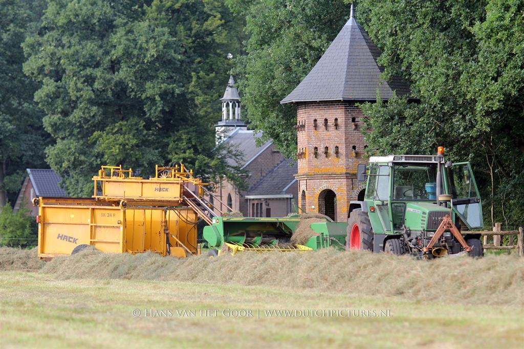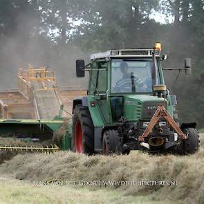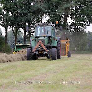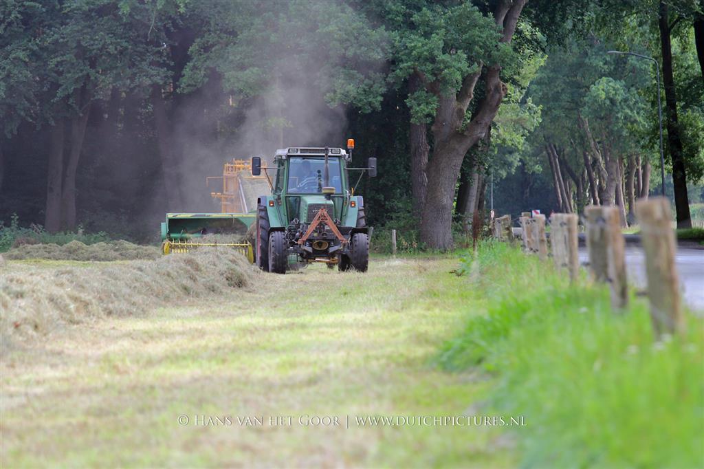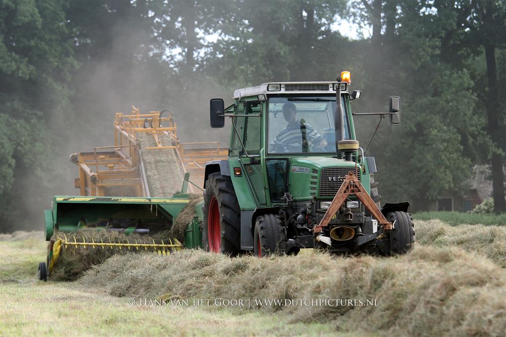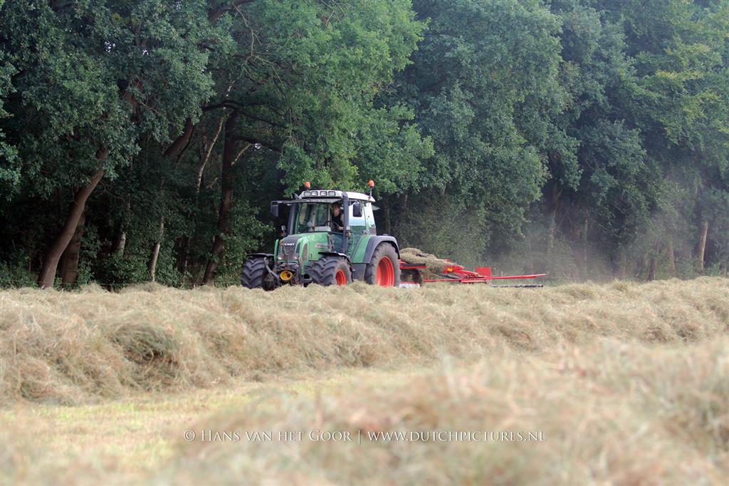 Kleine hooibalen persen op landgoed Staverden. We zien veehouder Jan Overeem van boerderij Meerhoeve uit Uddel met een Fendt Farmer 308 LS met John Deere 456 A balenpers en een Hack SK 24 P balenverzamelaar. Het hooi wordt bij elkaar geharkt met door een Fendt 412 met Lely hark.