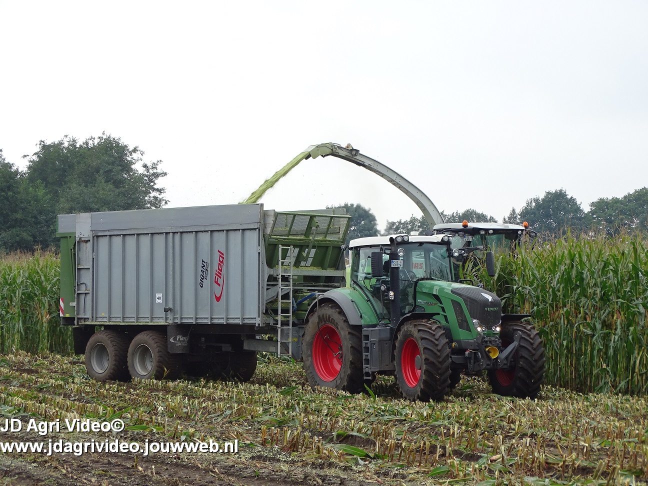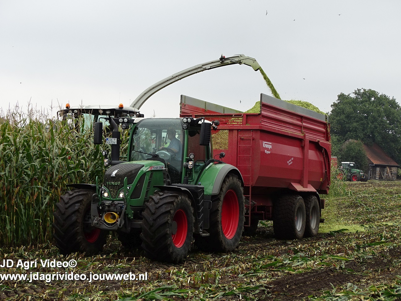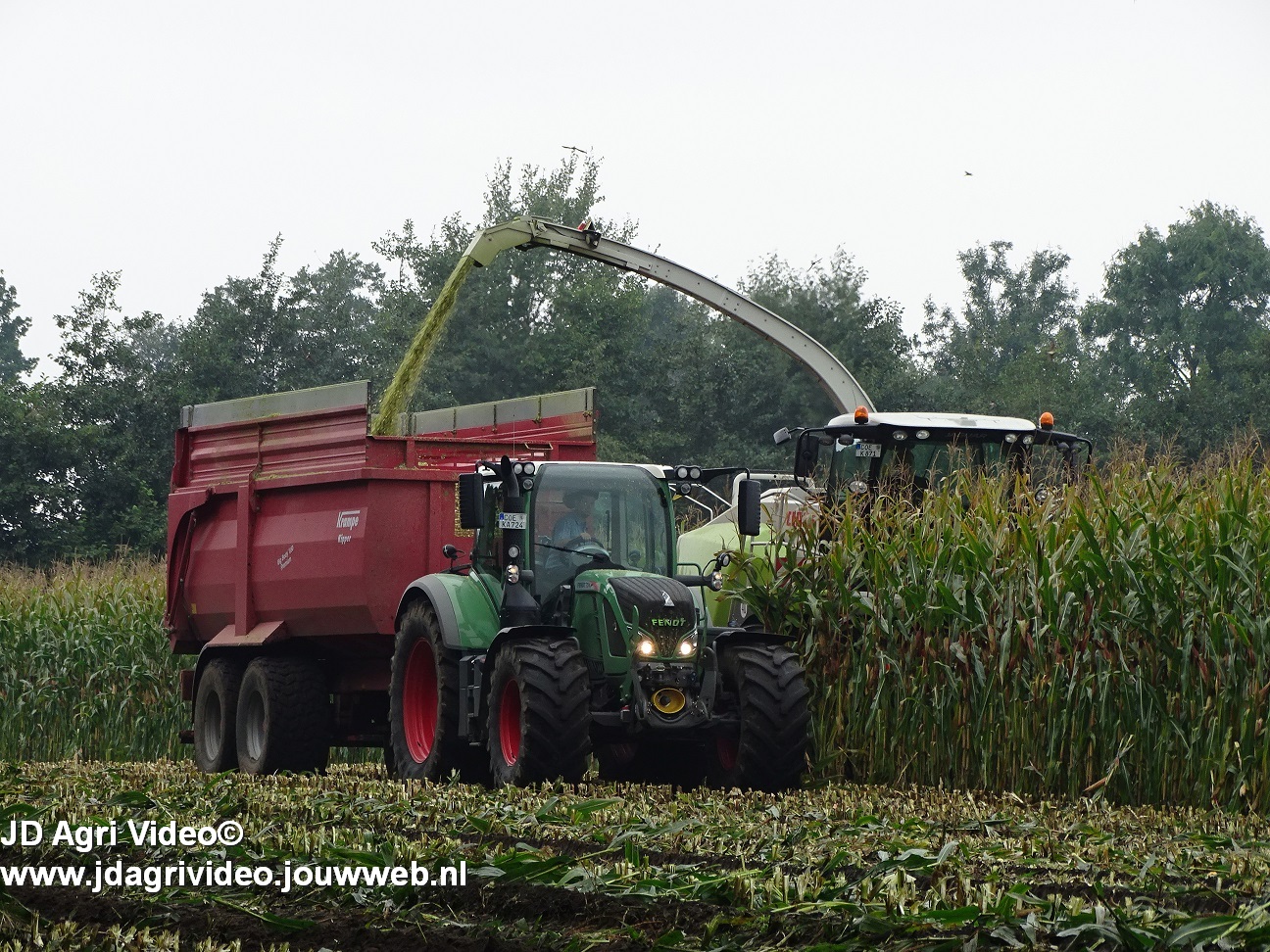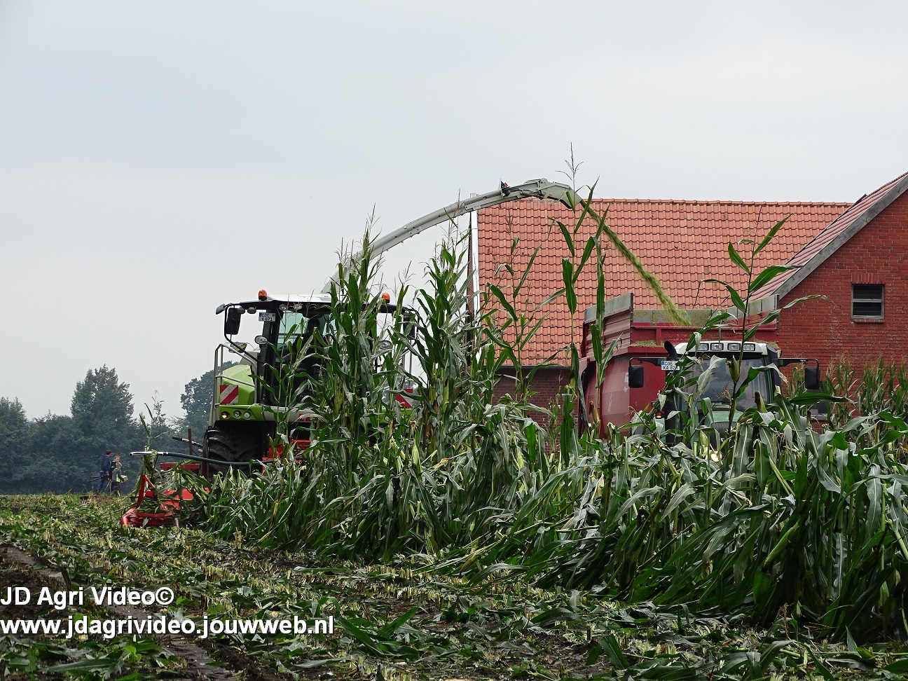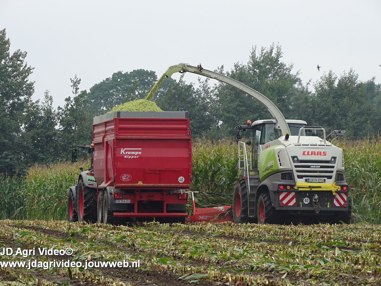 Agrarservice Kerkering uit Rosendahl-Holtwick uit Duitsland aan het maishakselen met stormschade met een Claas Jaguar 870, Fendt 822 met een Fliegl Gigant ASW 268, Fendt 724 en Fendt 818 met Krampe kieper.