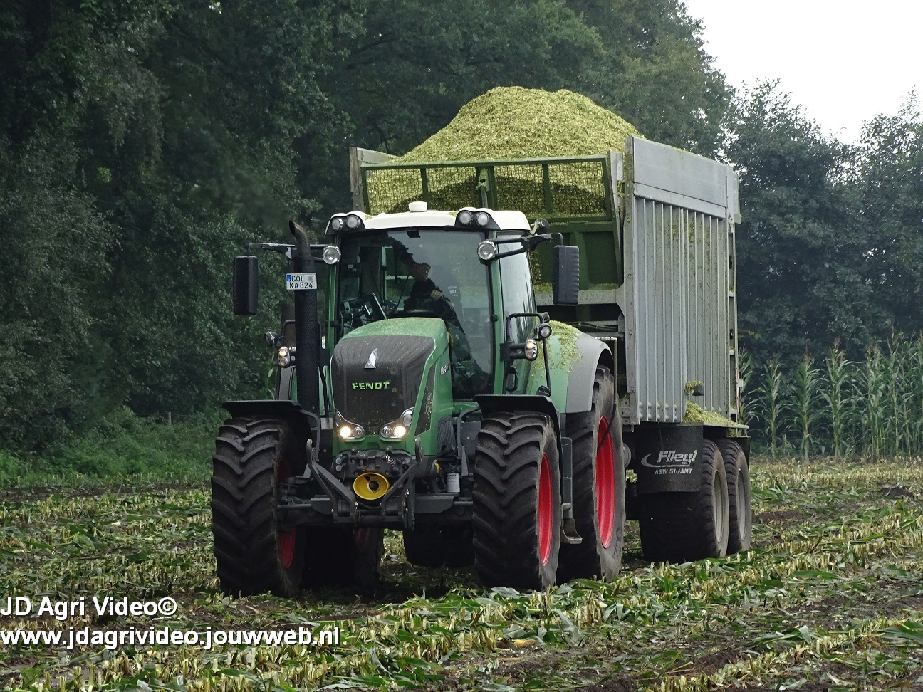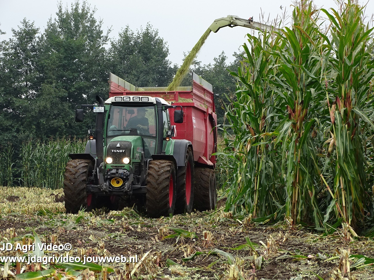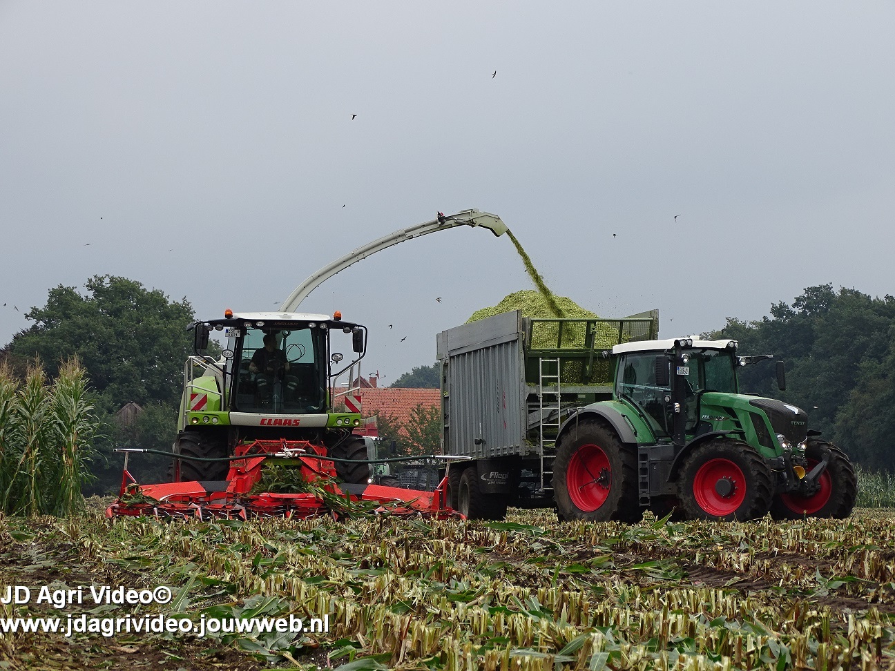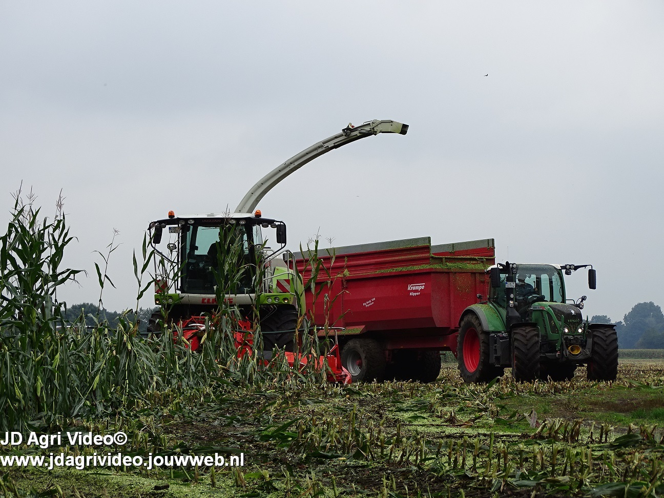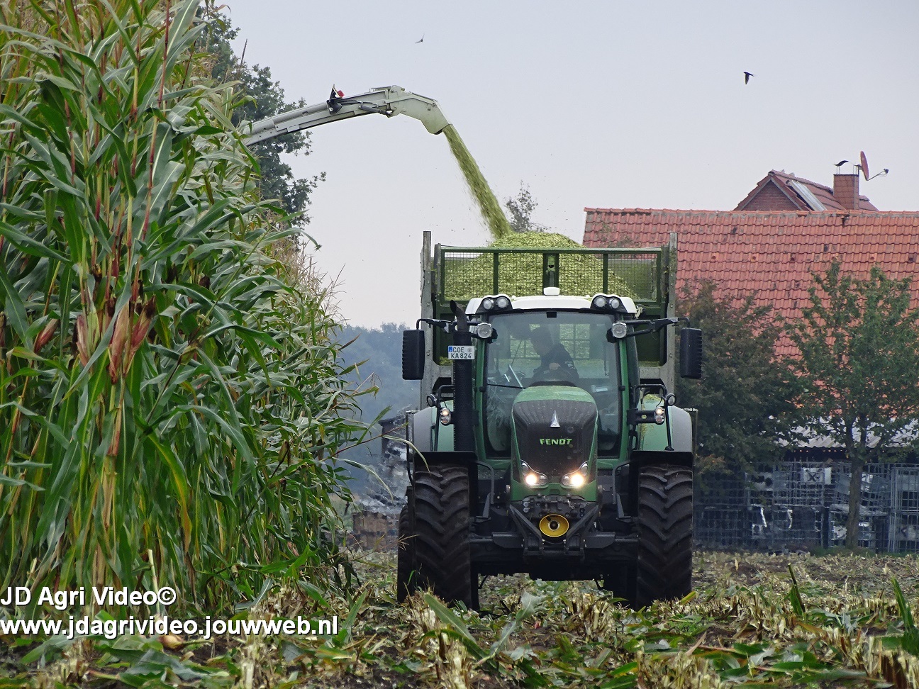 Agrarservice Kerkering uit Rosendahl-Holtwick uit Duitsland aan het maishakselen met stormschade met een Claas Jaguar 870, Fendt 822 met een Fliegl Gigant ASW 268, Fendt 724 en Fendt 818 met Krampe kieper.