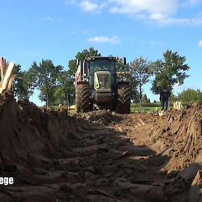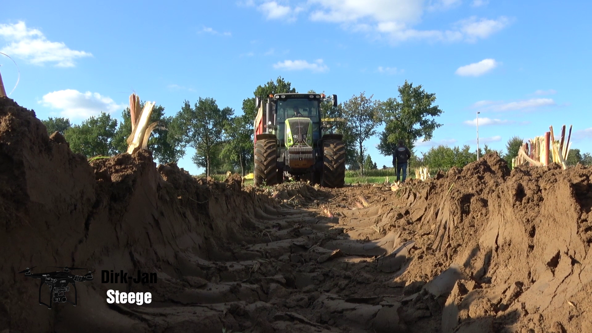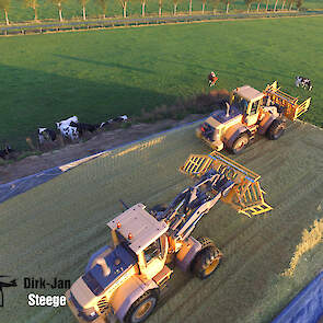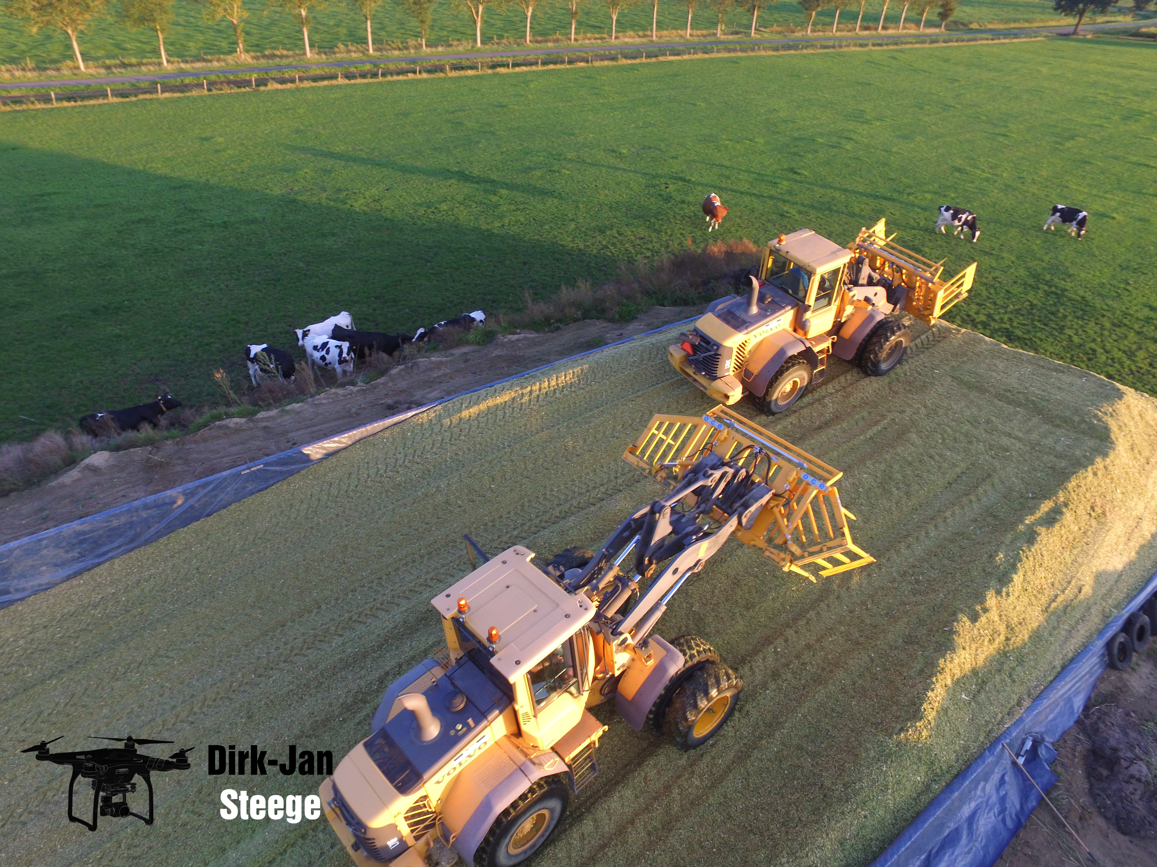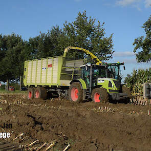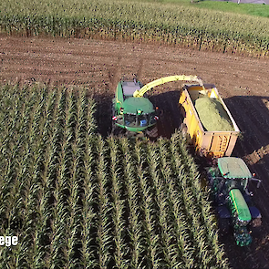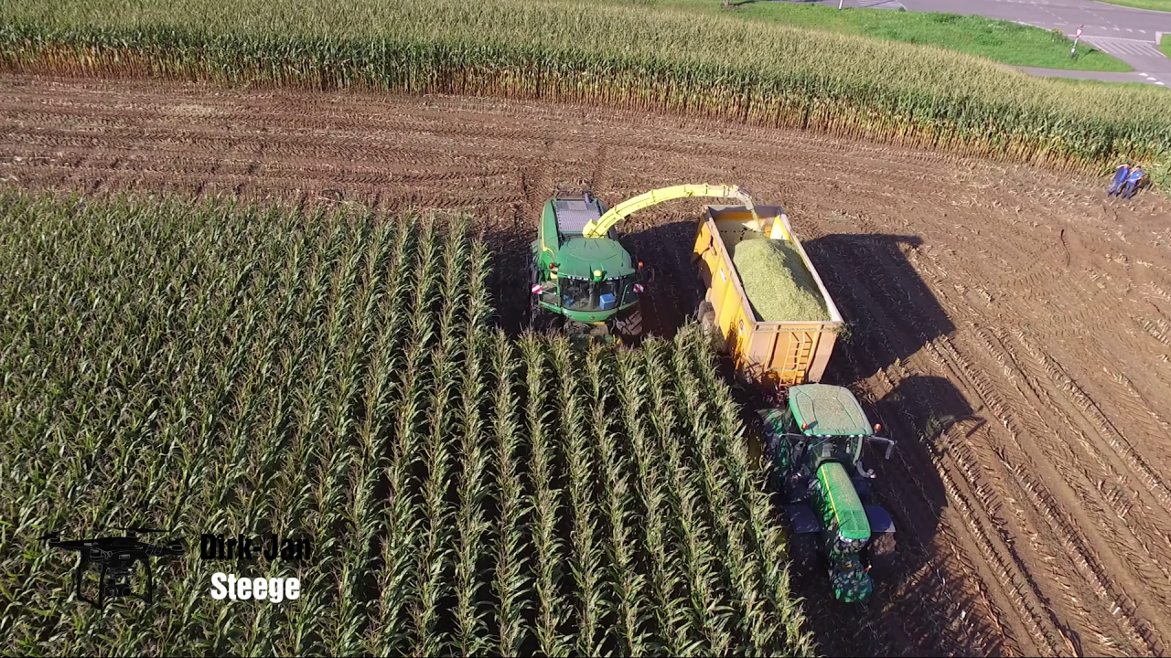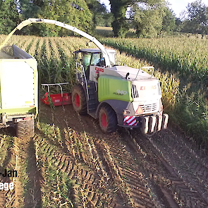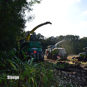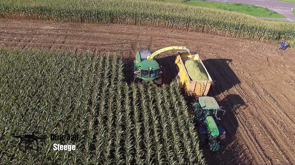 Om de maïs van het 5 hectare grote, natte perceel te kunnen oogsten, moesten verschillende trucs uit de kast worden gehaald; diagonaal hakselen, achteruit rijden met de wagens, tot zelfs de mais ophalen met de John Deere. De grote diameter van de banden zorgt ervoor dat John Deere tot in het natste hoekje van het veld kan komen.Op de kuil zorgen twee Volvo shovels voor een strakke goed aangereden kuil.