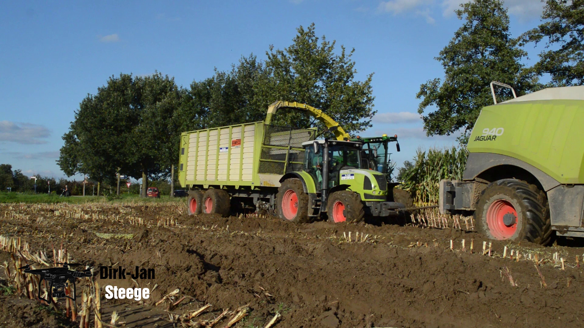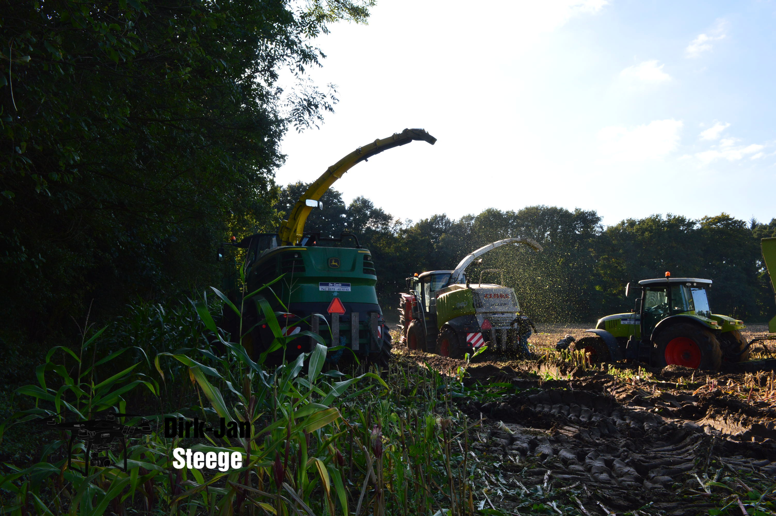 Na een week mooi weer, nog steeds natte omstandigheden in het Achterhoekse Zelhem voor de hakselaars van Loonbedrijf De Covik uit Steenderen. Met vereende krachten wordt de maïs van het veld gehaald. Kan de wagen niet bij de maïs komen, dan halen de jongens van de Covik de mais wel naar de wagen. Voor beide hakselaars zit een 8 Rijer van Kemper. Een 460plus met 4 grote trommels aan de John Deere 8400 en een 360 met 8 kleine invoertrommels aan de Claas Jaguar 940.