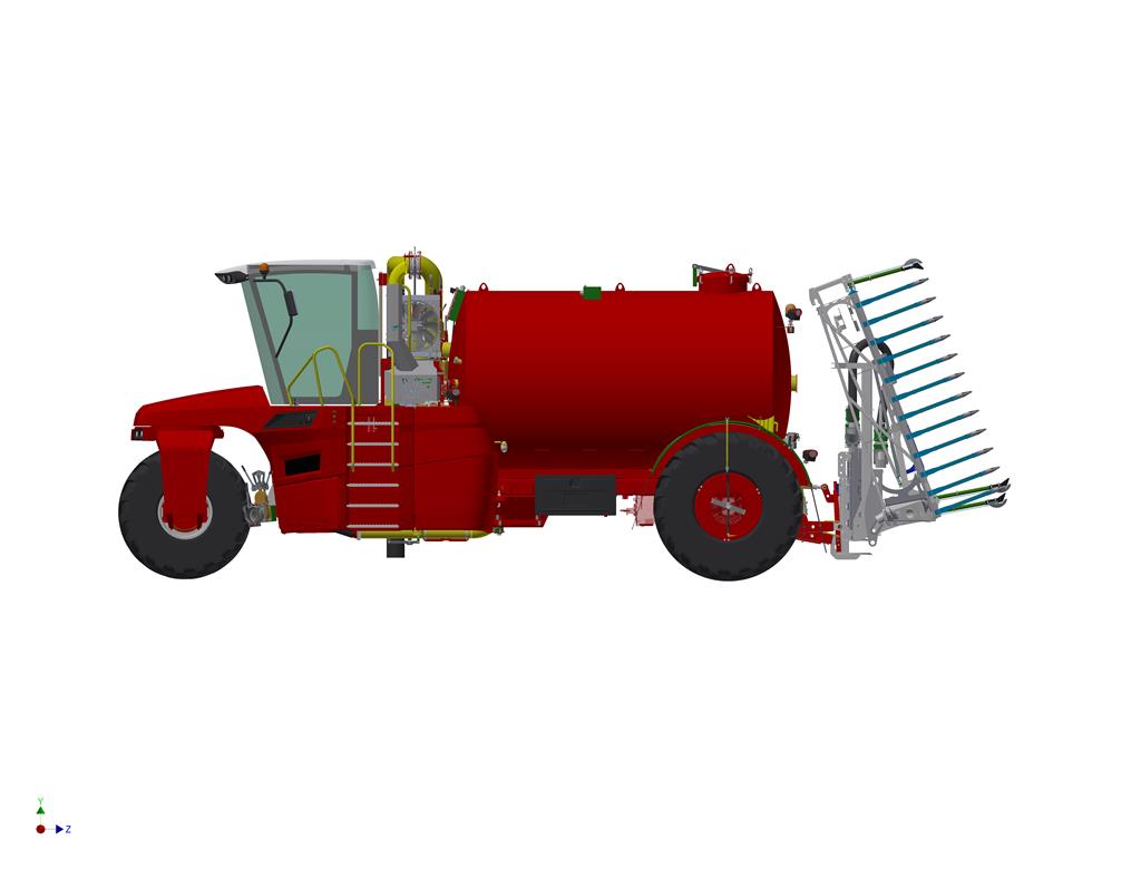 De zelfrijder moet wendbaar zijn en met een zo laag mogelijke bodemdruk, zo veel mogelijk mest mee kunnen nemen. Dit resulteert vaak in veel gestuurde wielen, brede banden en een relatief korte en brede opbouwtank.