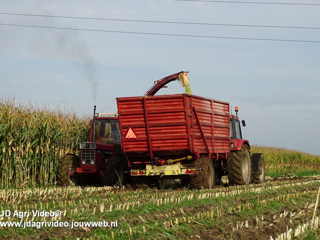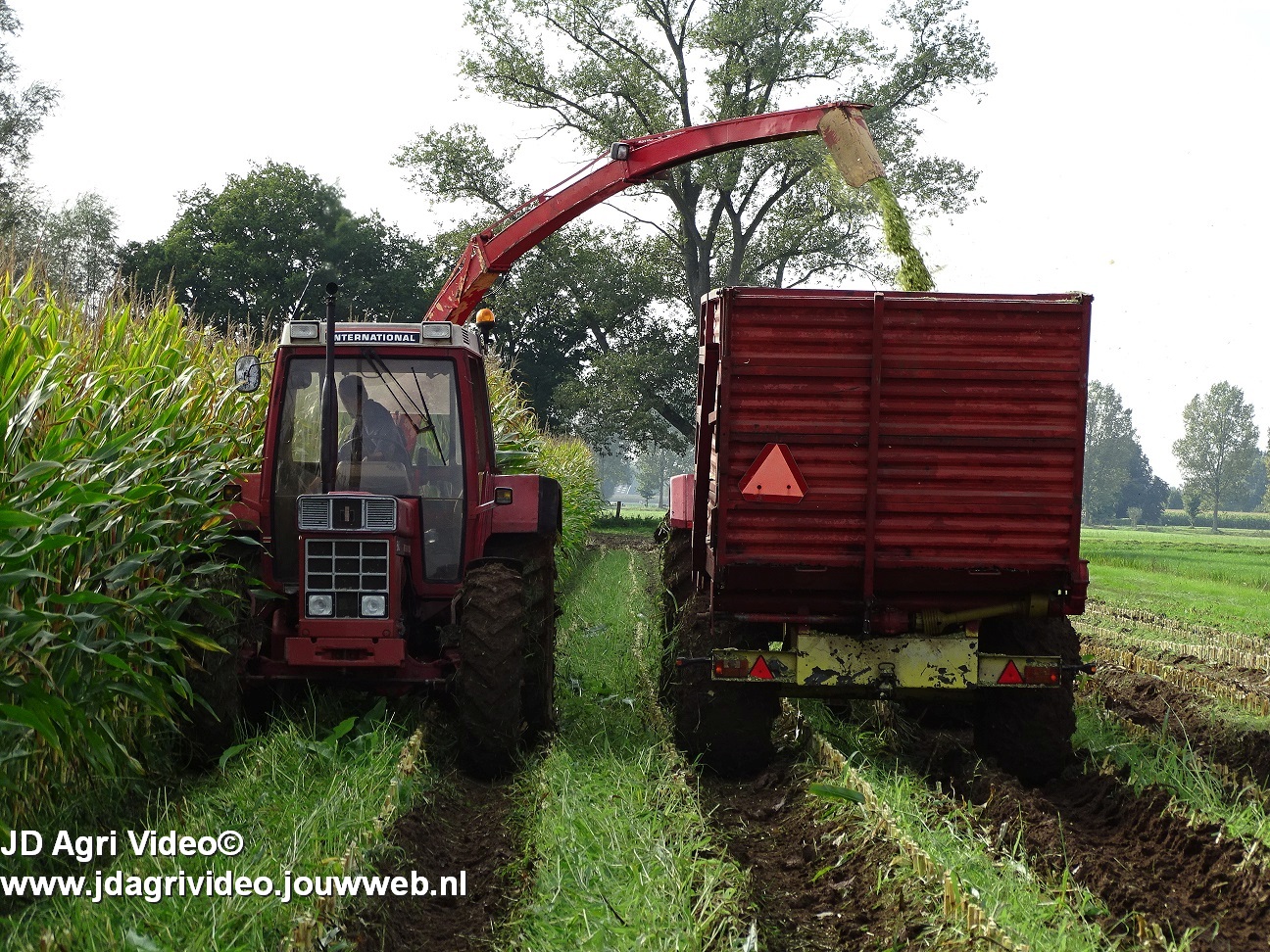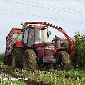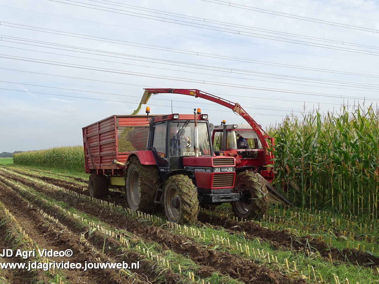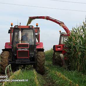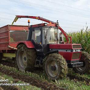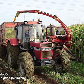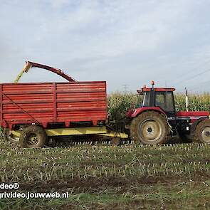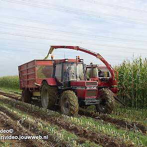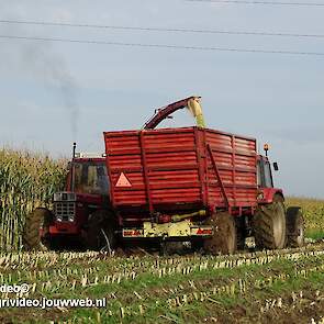 Maïs hakselen met een International 956XL met PZ MH 160S in Oene. Voor de afvoer een Case International 956XL met Schuitemaker silagewagen.