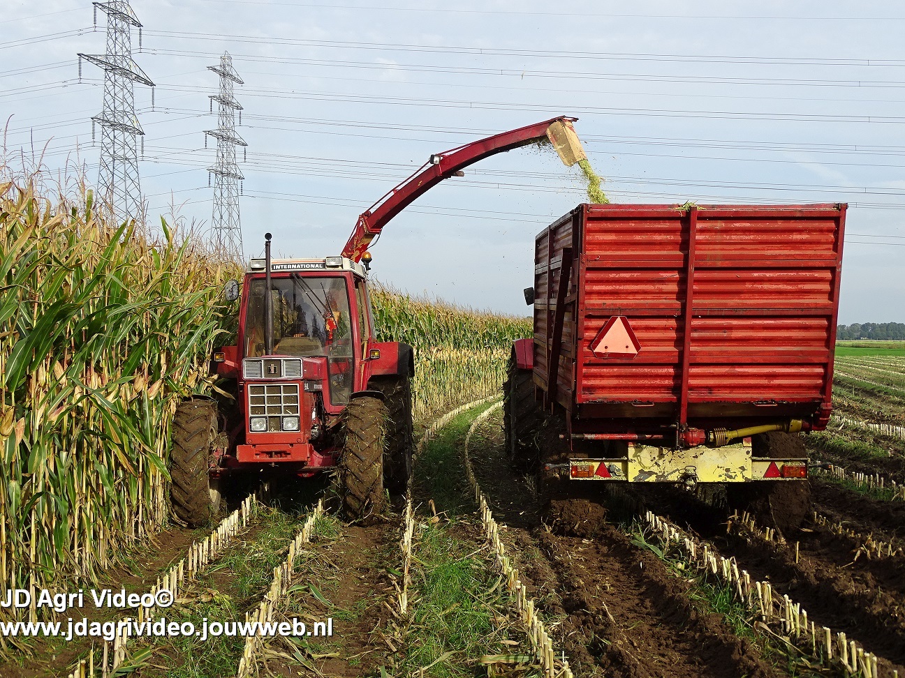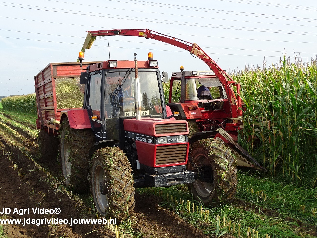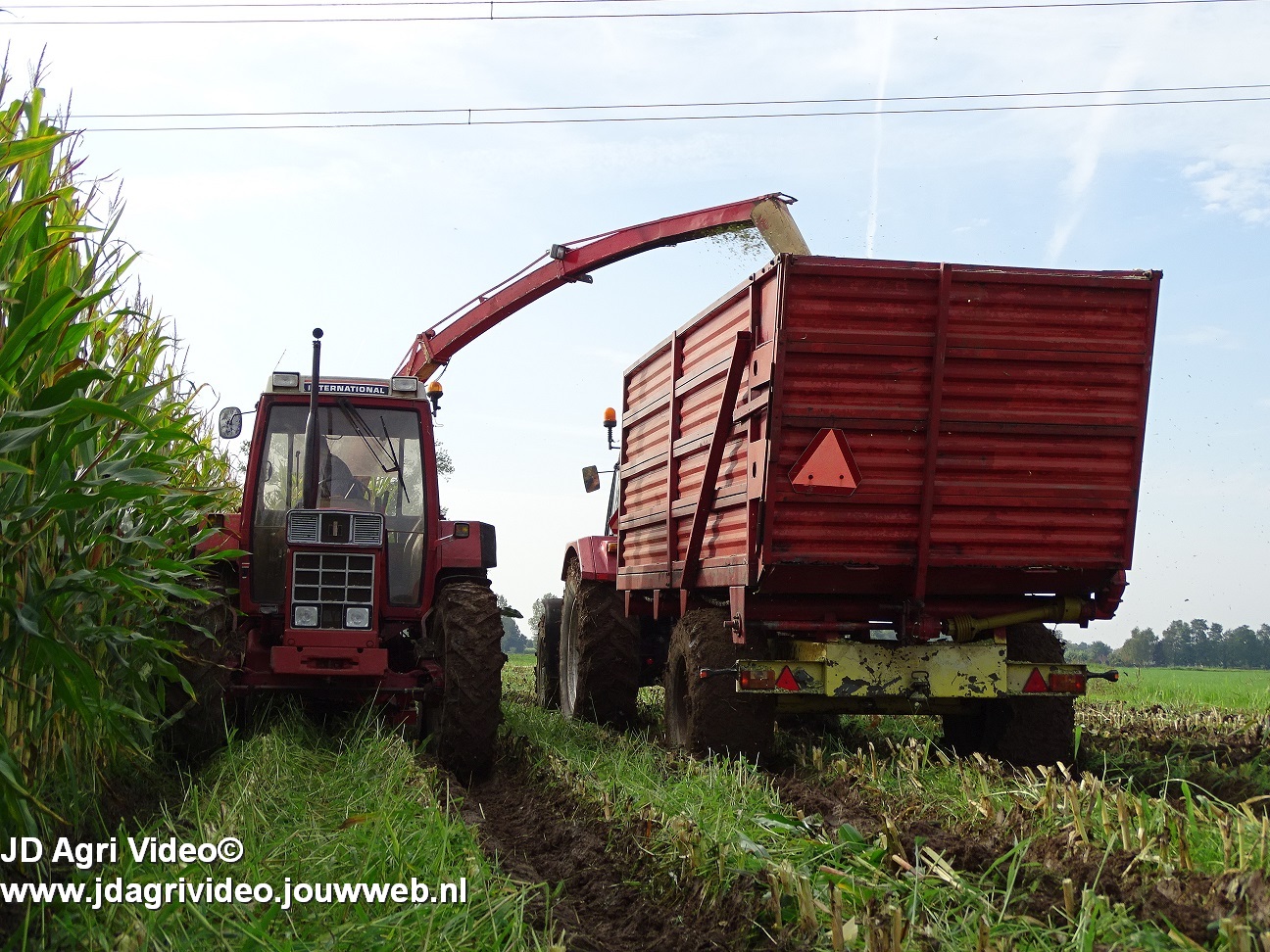 Maïs hakselen met een International 956XL met PZ MH 160S in Oene. Voor de afvoer een Case International 956XL met Schuitemaker silagewagen.