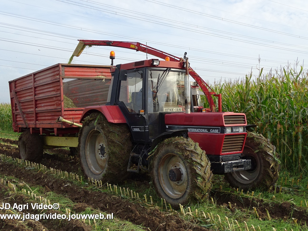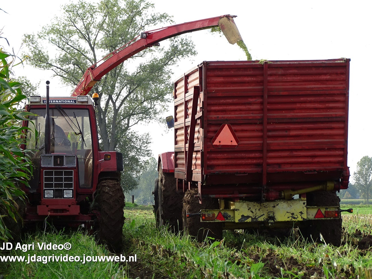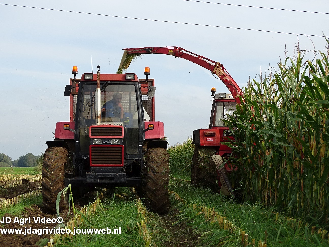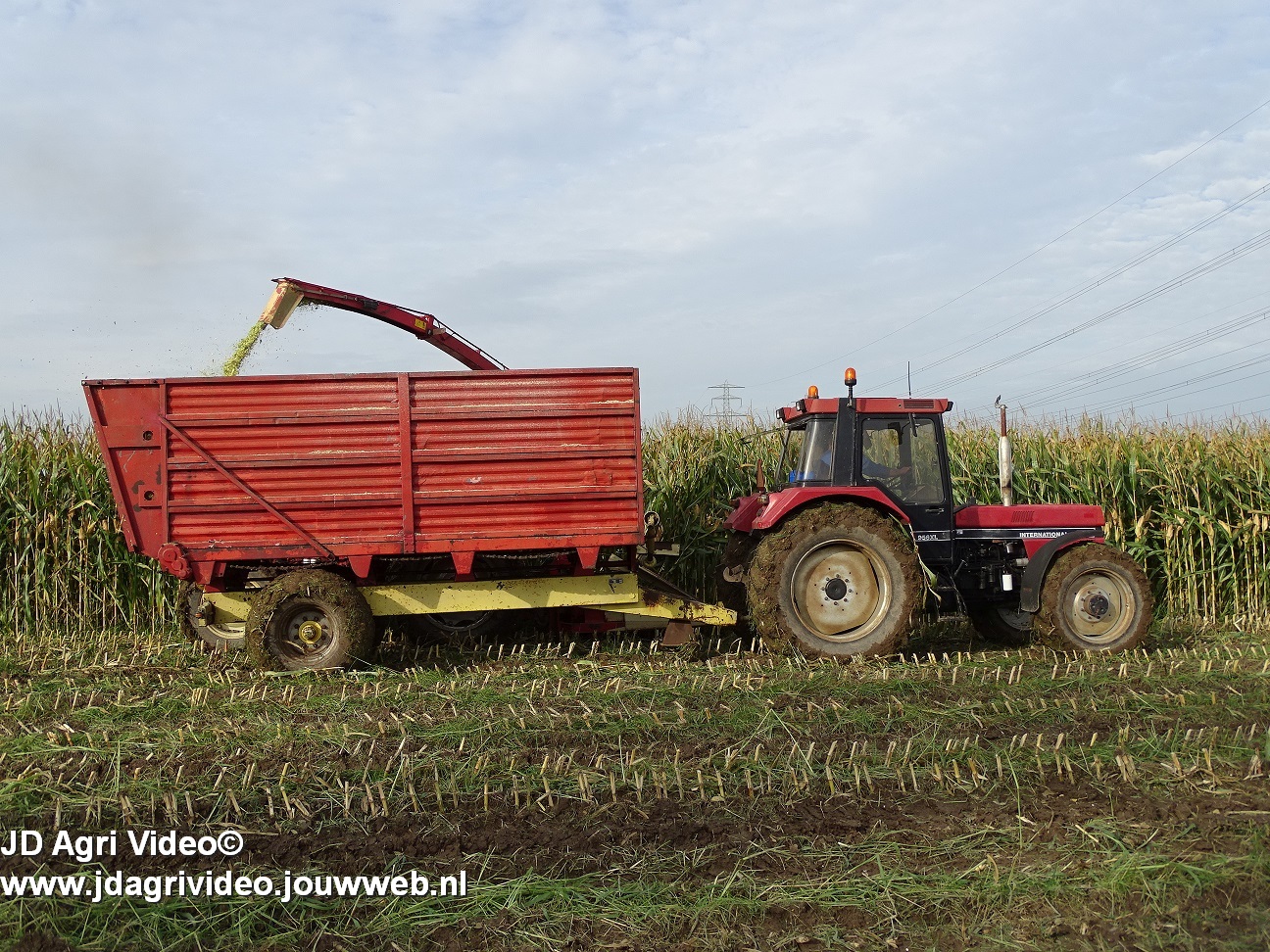 Maïs hakselen met een International 956XL met PZ MH 160S in Oene. Voor de afvoer een Case International 956XL met Schuitemaker silagewagen.
