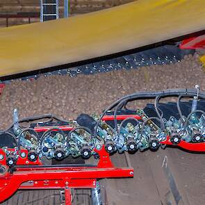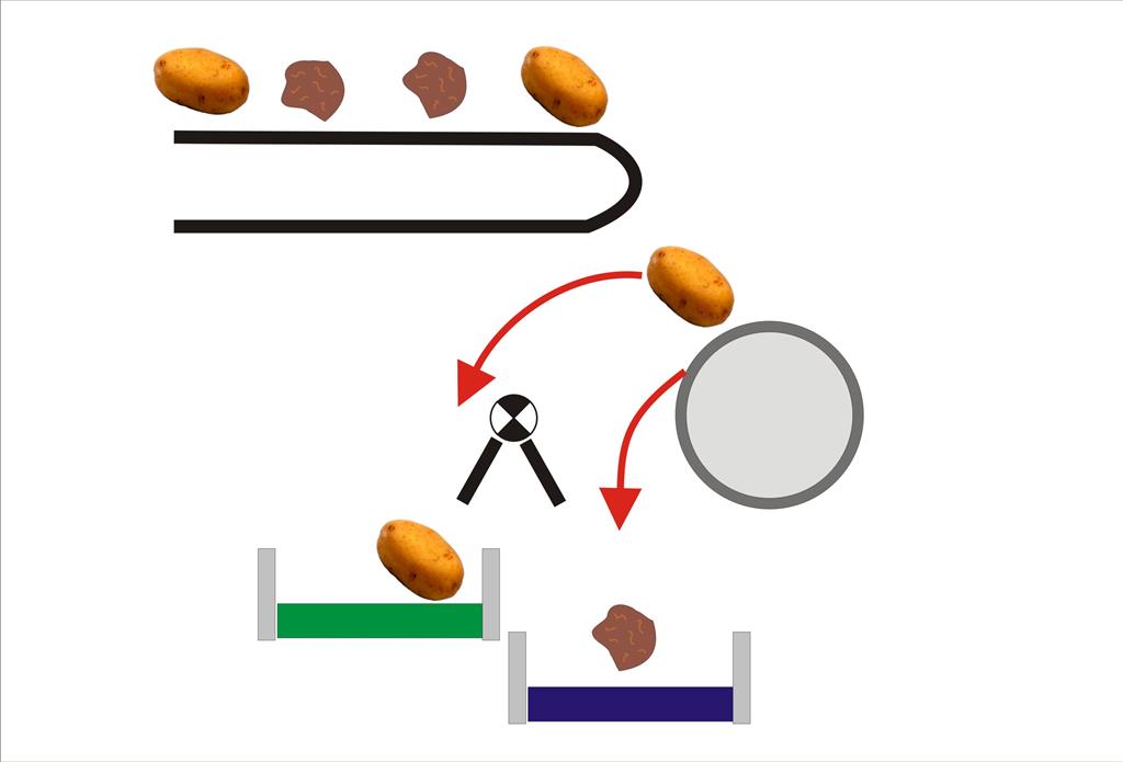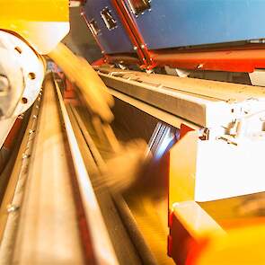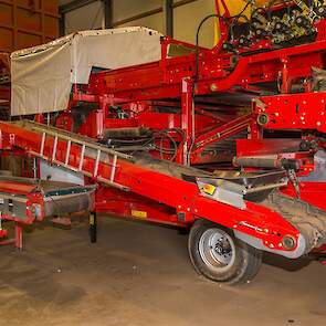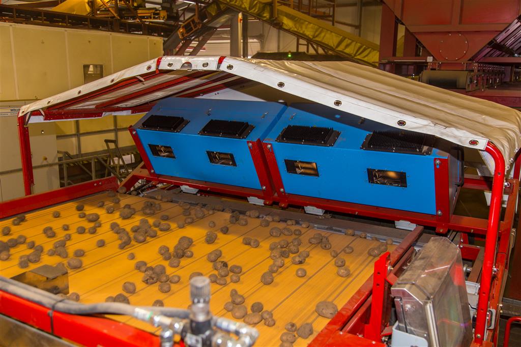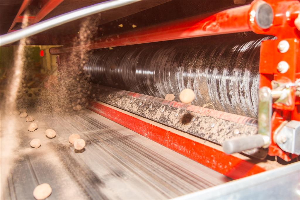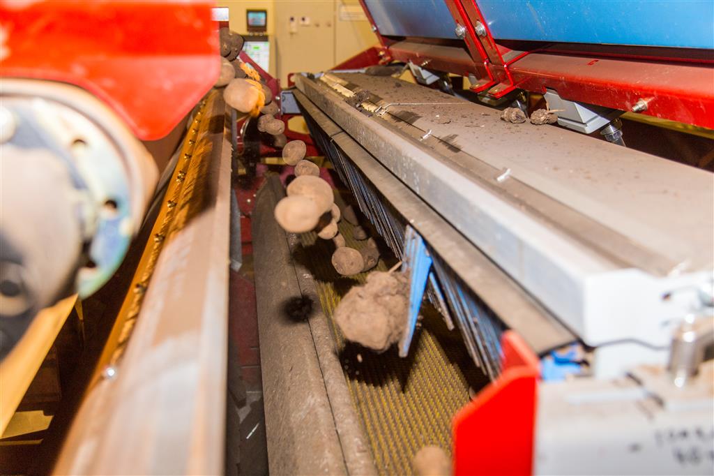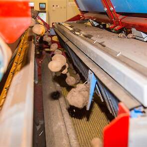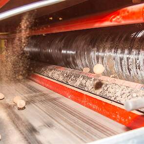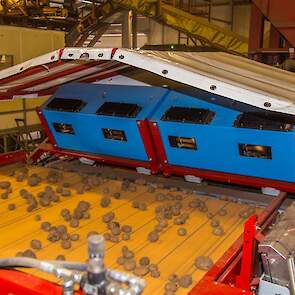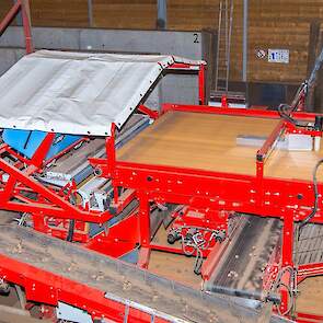 De aardappelen lopen ongehinderd door en worden voorzichtig op de afvoerband gelegd.