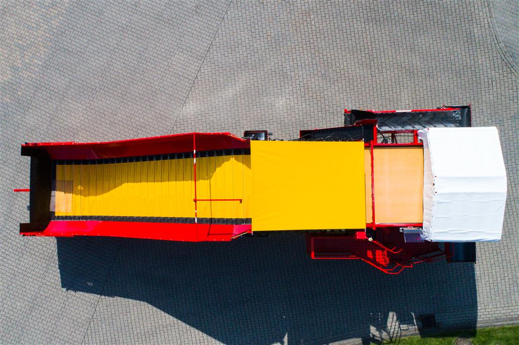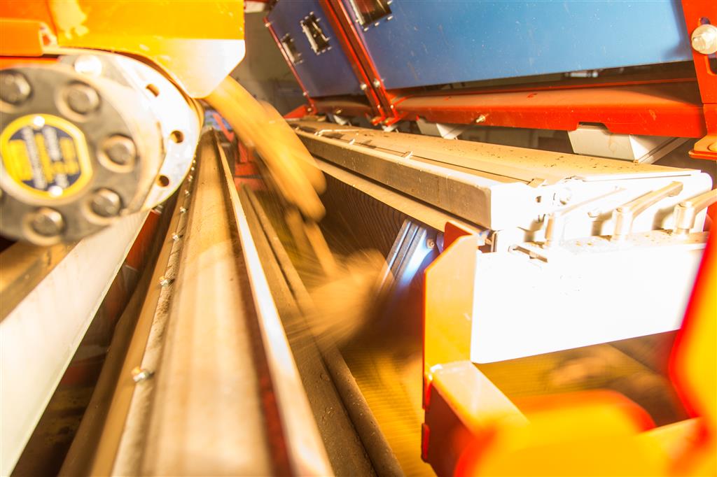 Om de hoge capaciteit te kunnen bereiken is de werkbreedte door de gehele machine 2,4 meter, op deze manier worden ook de storende en beschadigende effecten van versmalling verme-den. Een veiligheidssysteem op de hoofdproductband voorkomt dat de FPS-unit wordt beschadigd door grote en/of scherpe voorwerpen. Foto: Optimale productstroom over de totale breedte voor hoge ca-paciteit en productvriendelijkheid.