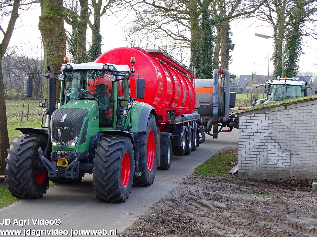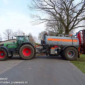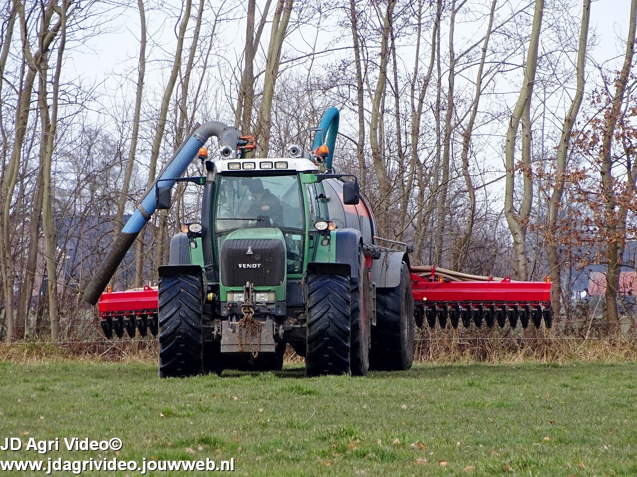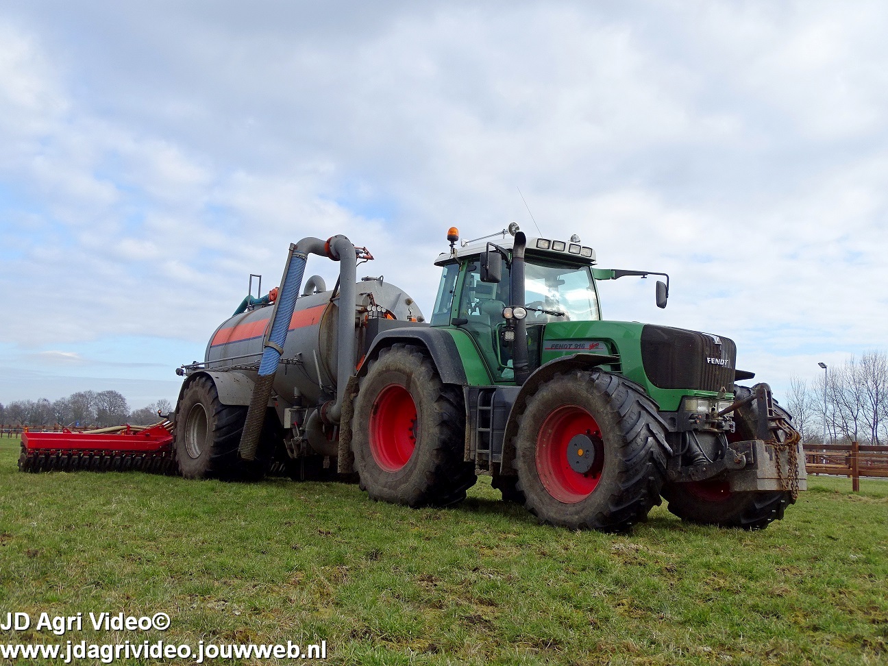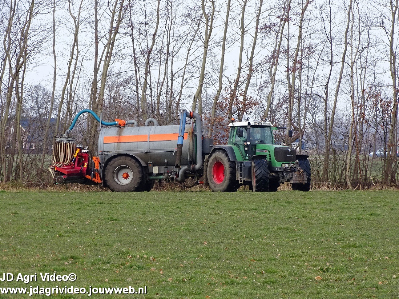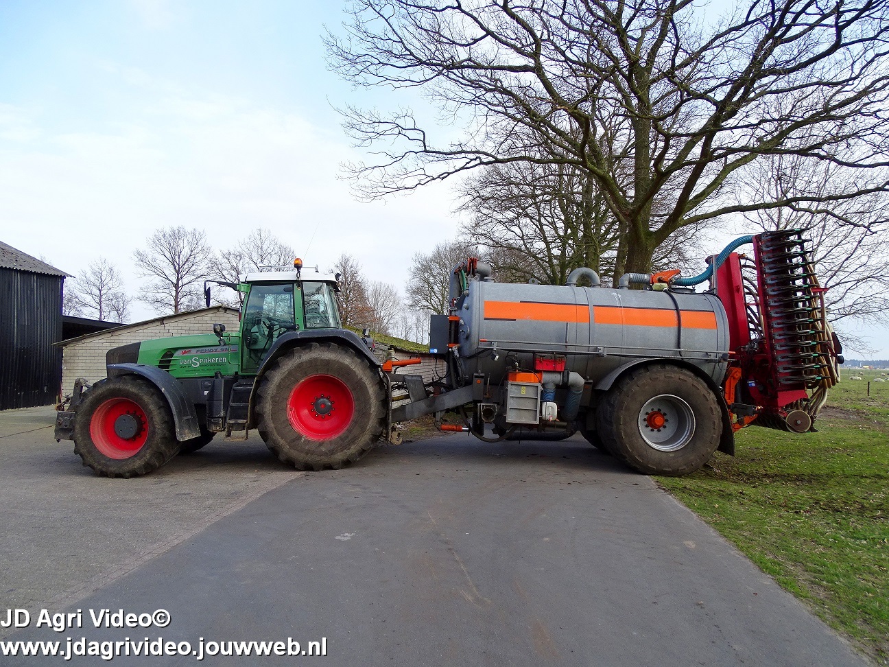 Loonbedrijf van Spijkeren uit Doornspijk aan het mest injecteren in Nunspeet met een Fendt 916 met een Kaweco mesttank en Vredo bemester. Voor het transport een Fendt 826.