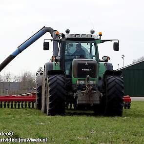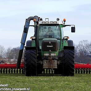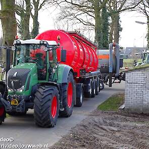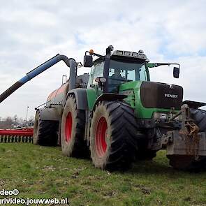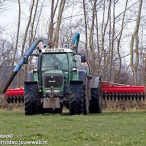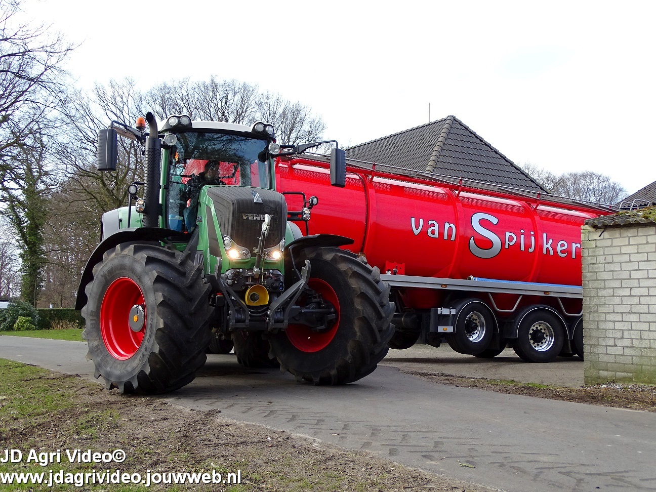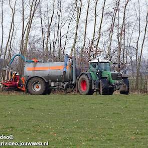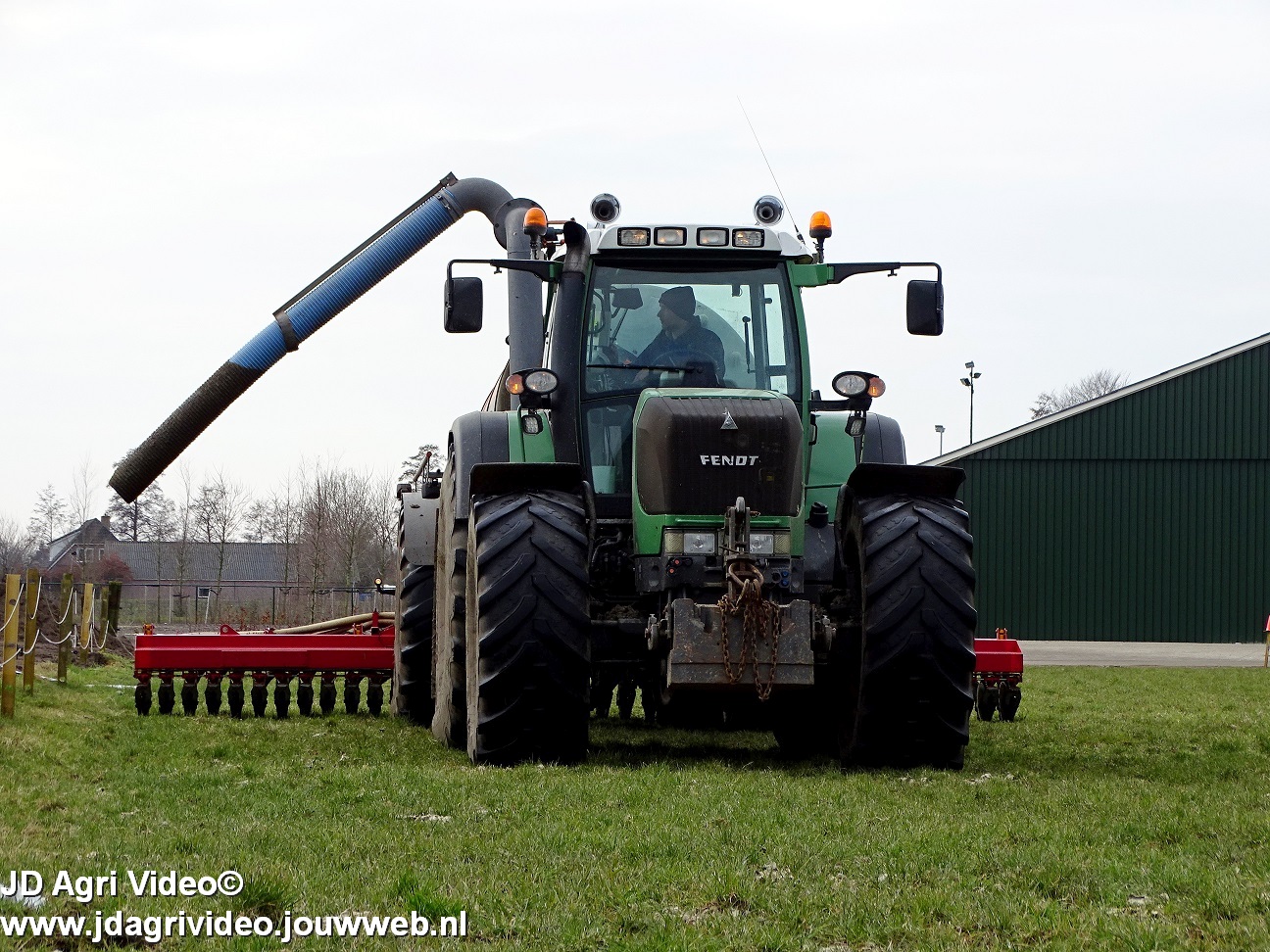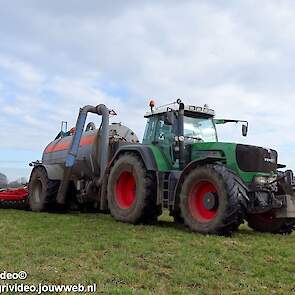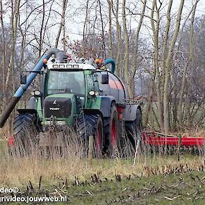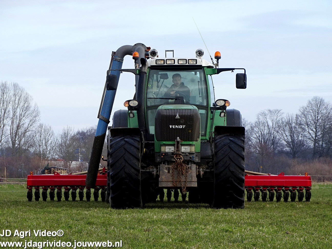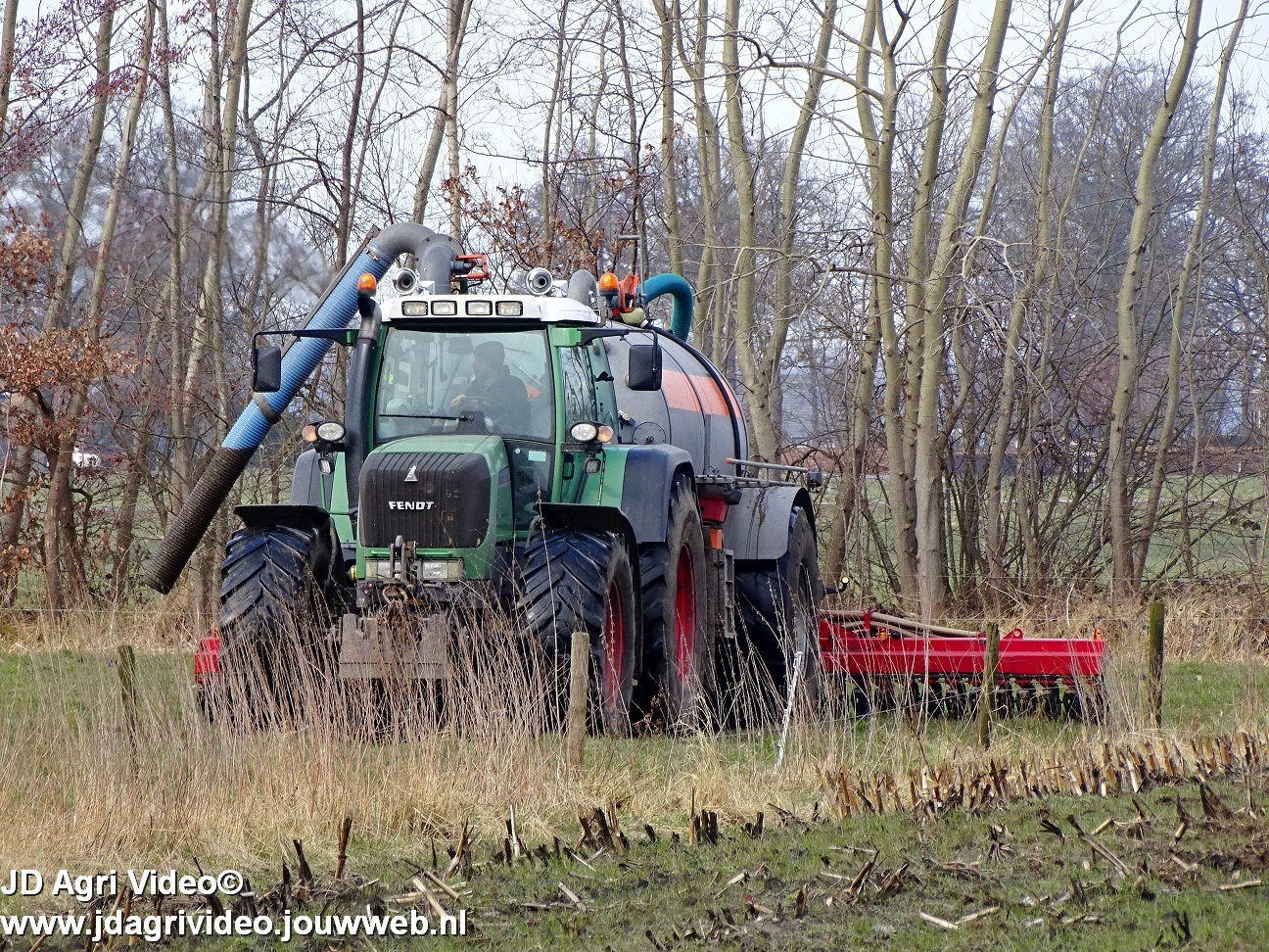 Loonbedrijf van Spijkeren uit Doornspijk aan het mest injecteren in Nunspeet met een Fendt 916 met een Kaweco mesttank en Vredo bemester. Voor het transport een Fendt 826.