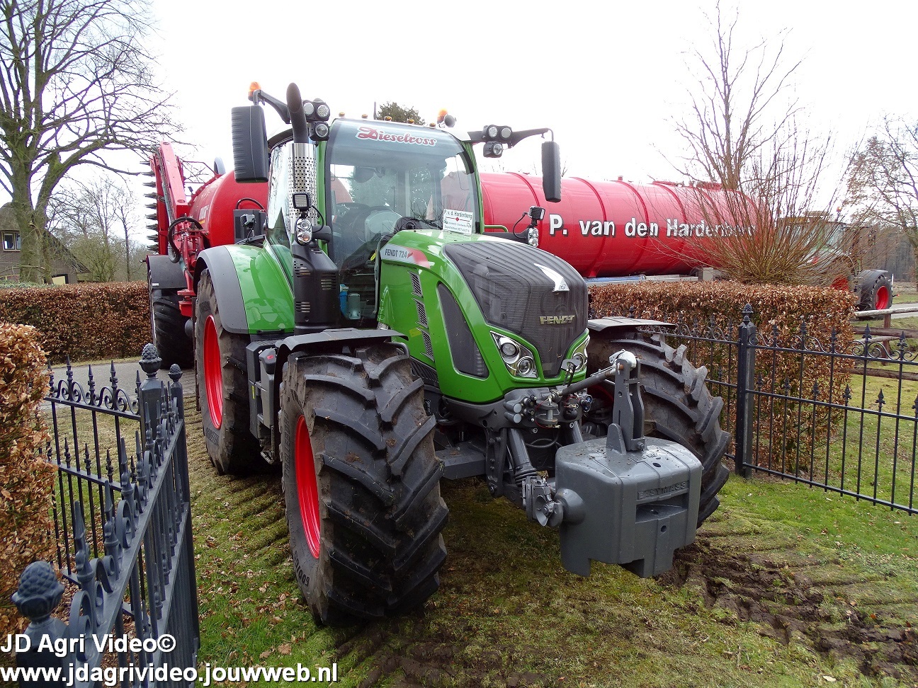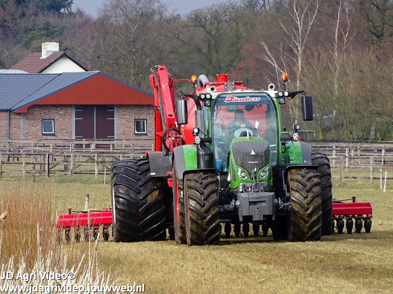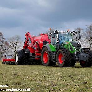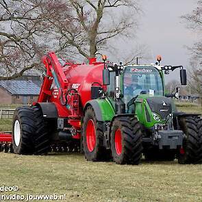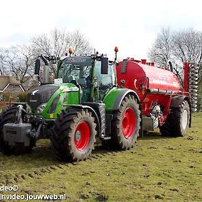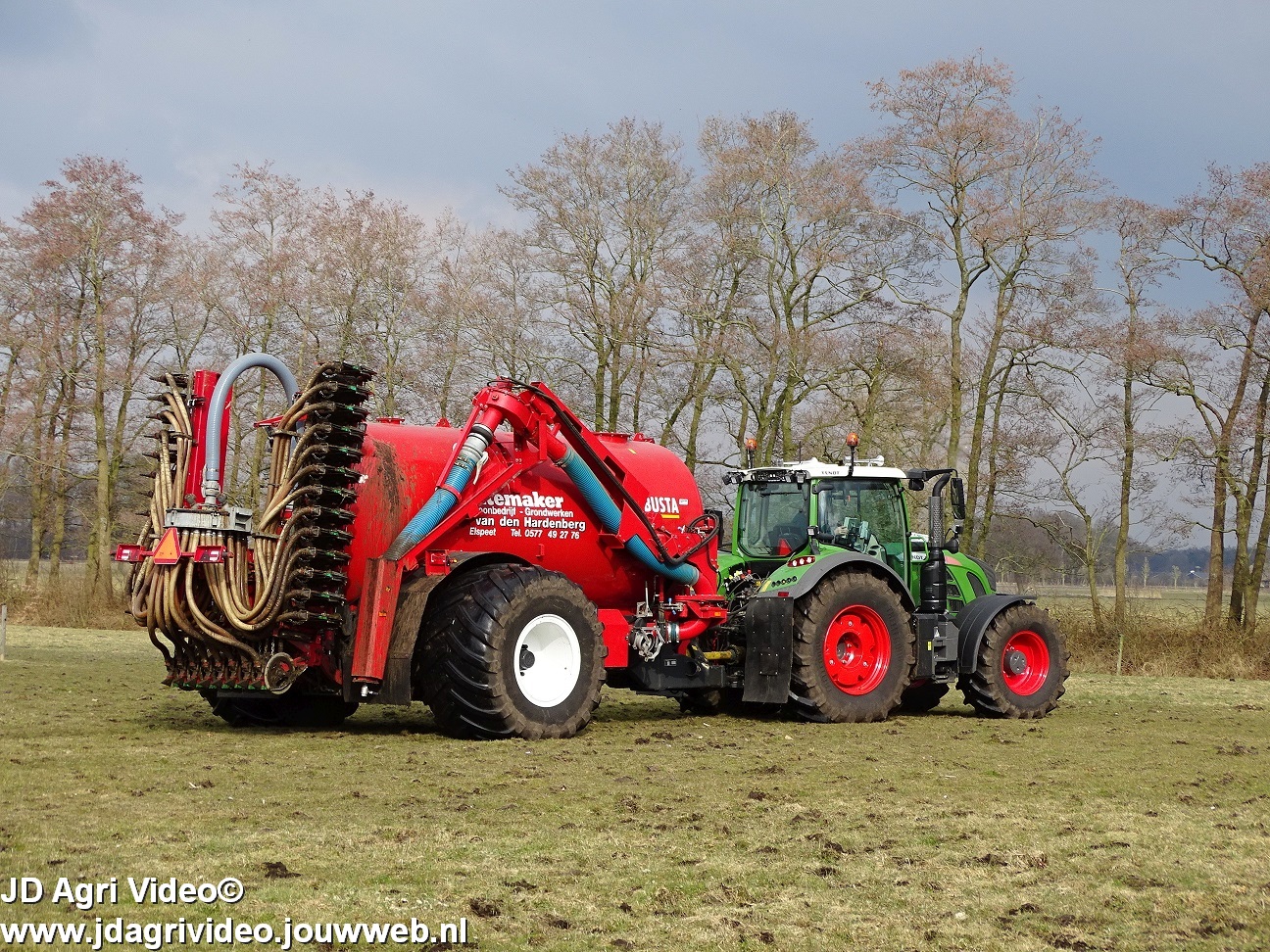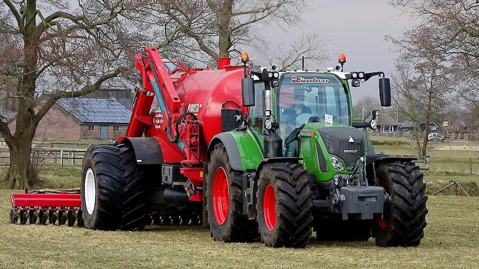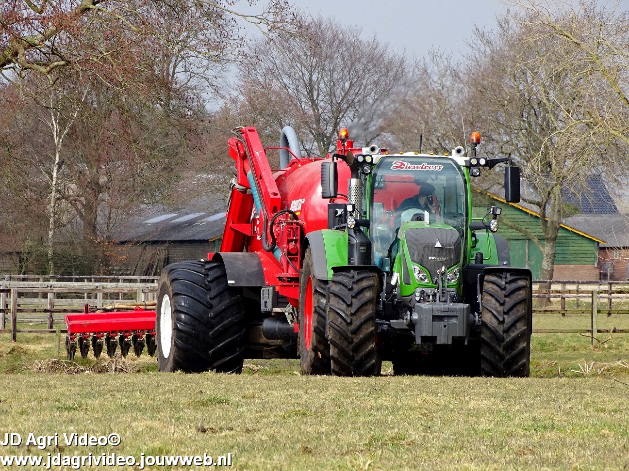 Loonbedrijf P van den Hardenberg uit Elspeet aan het mest injecteren met de nieuwe Fendt 724 met Schuitemaker Robusta mesttank en voor het transport de pas aangeschafte Fendt 828.
