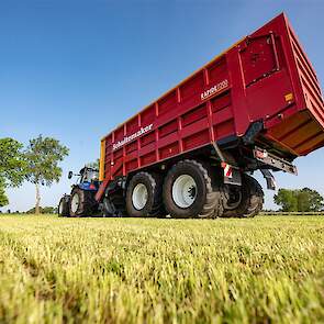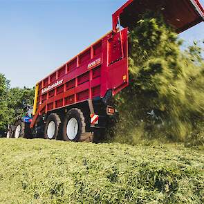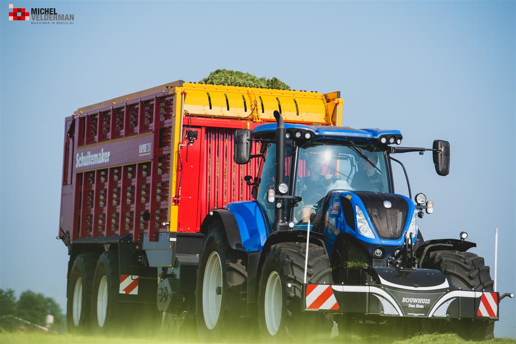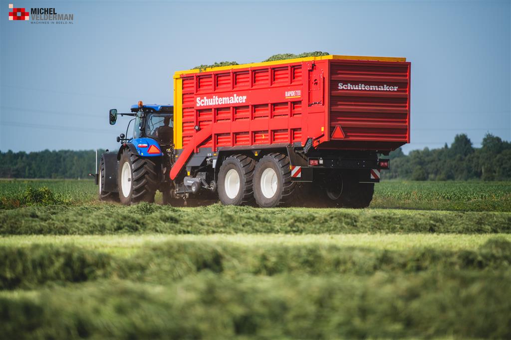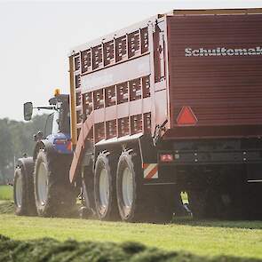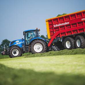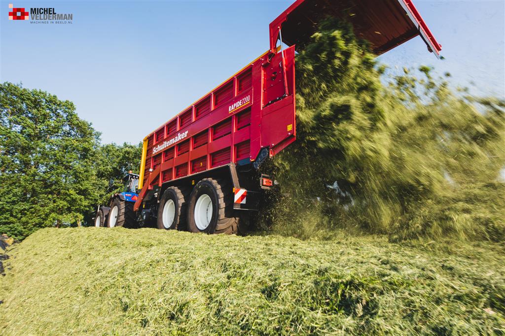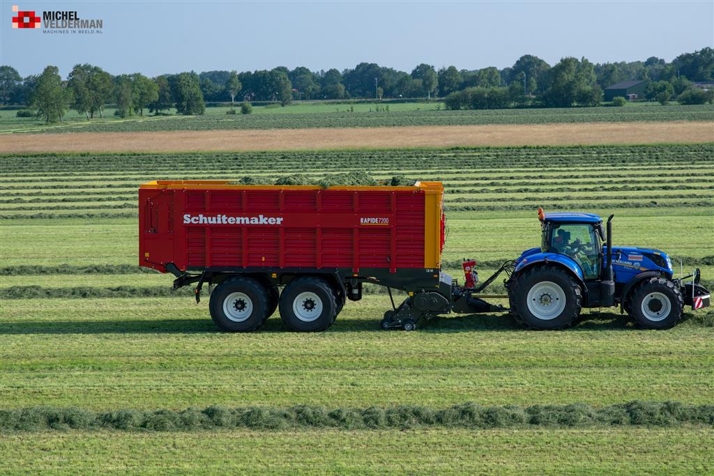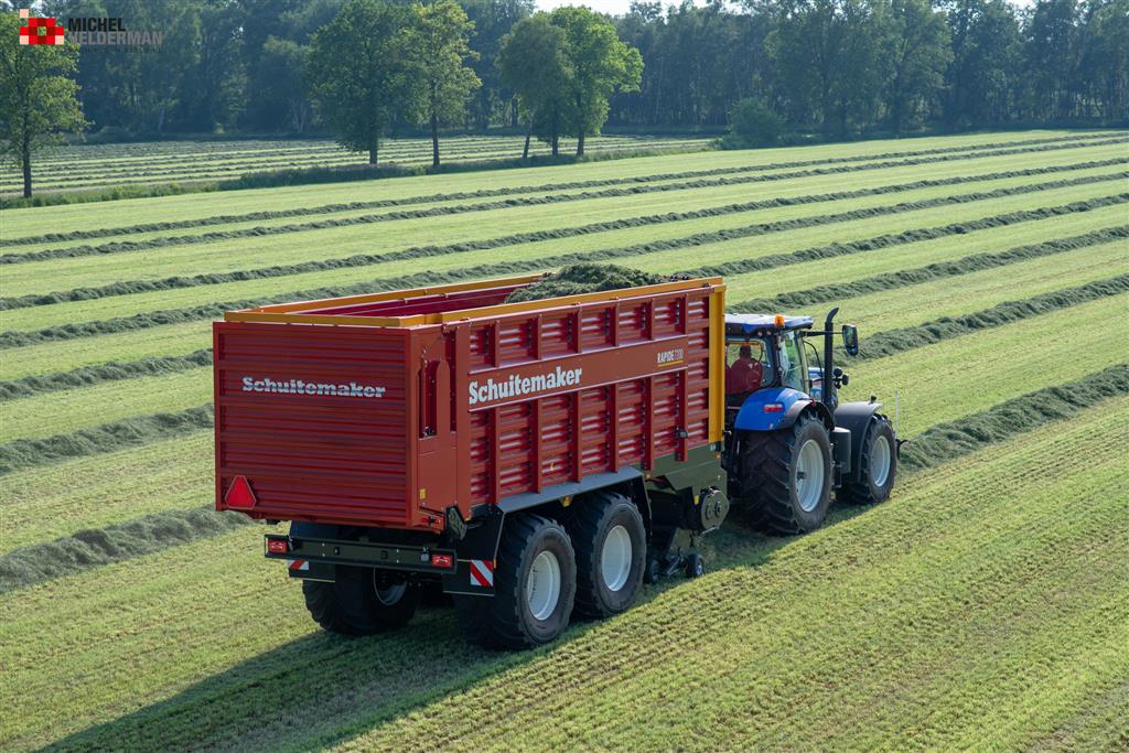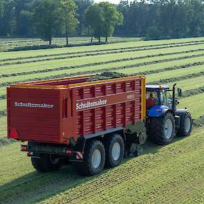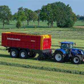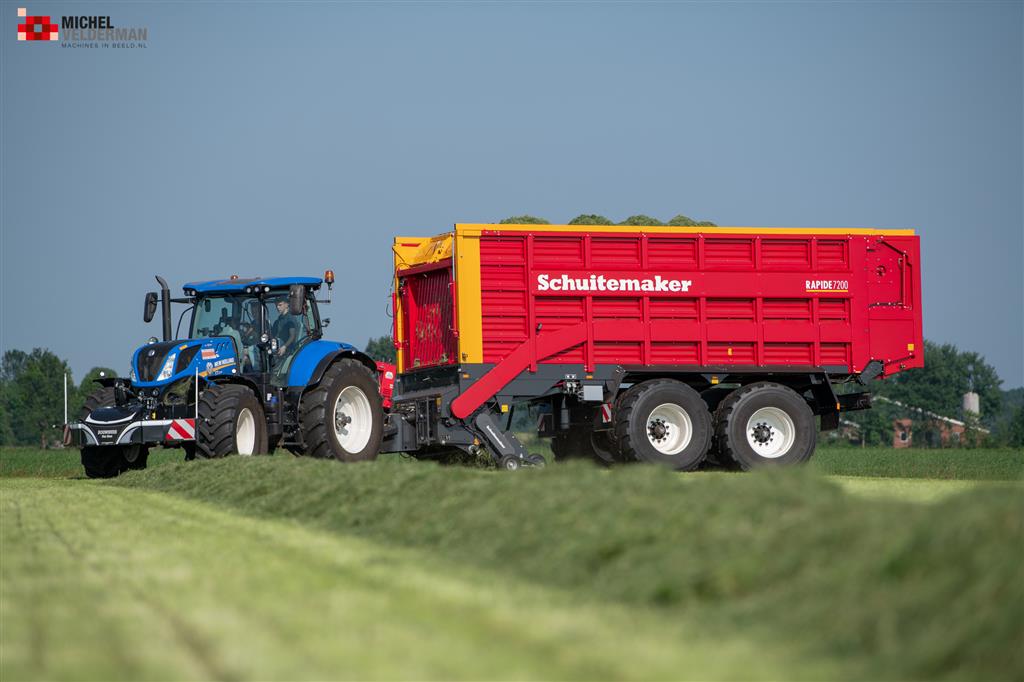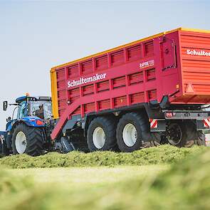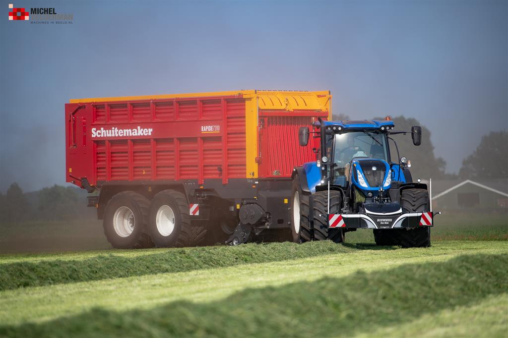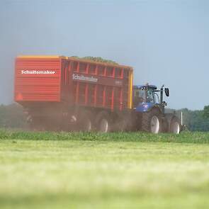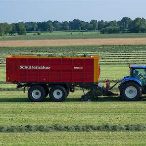 Loonbedrijf Bouwhuis uit Den Ham aan het werk in het gras, met één van hun twee nieuwe Schuitemaker Rapide 7200 opraapwagens.