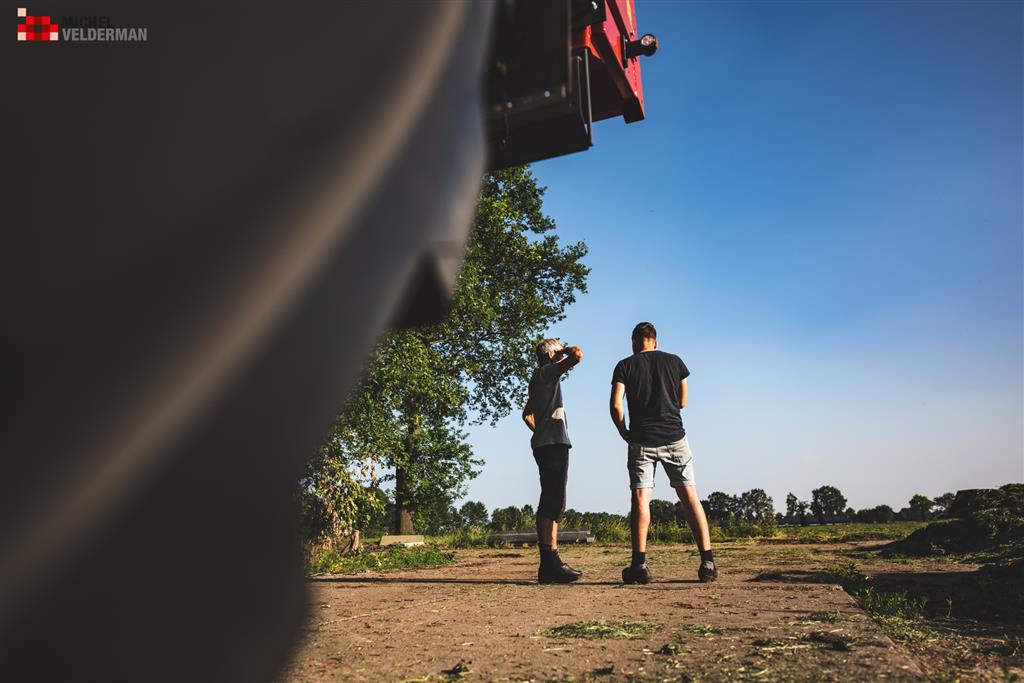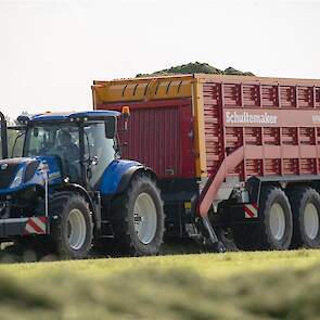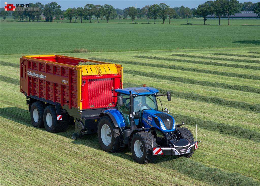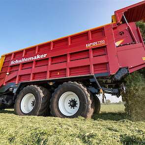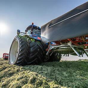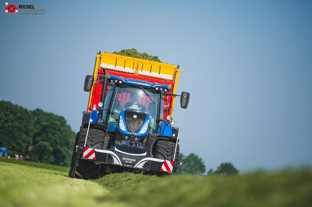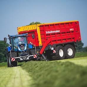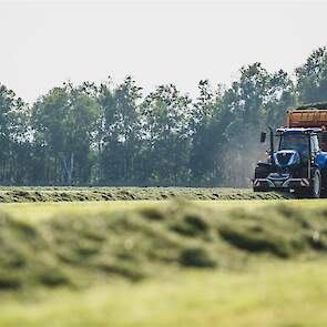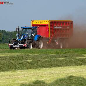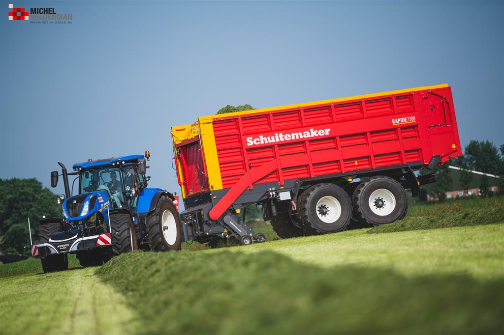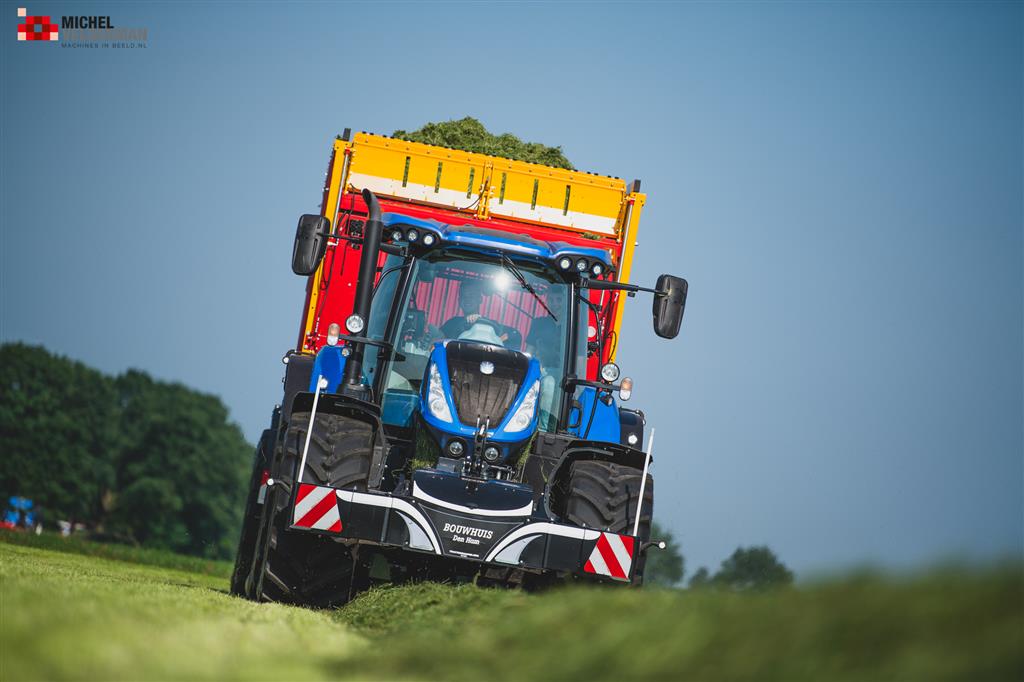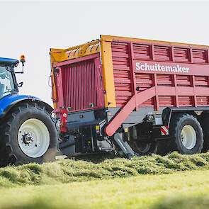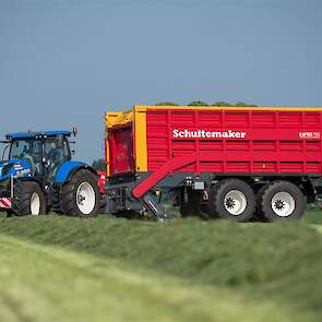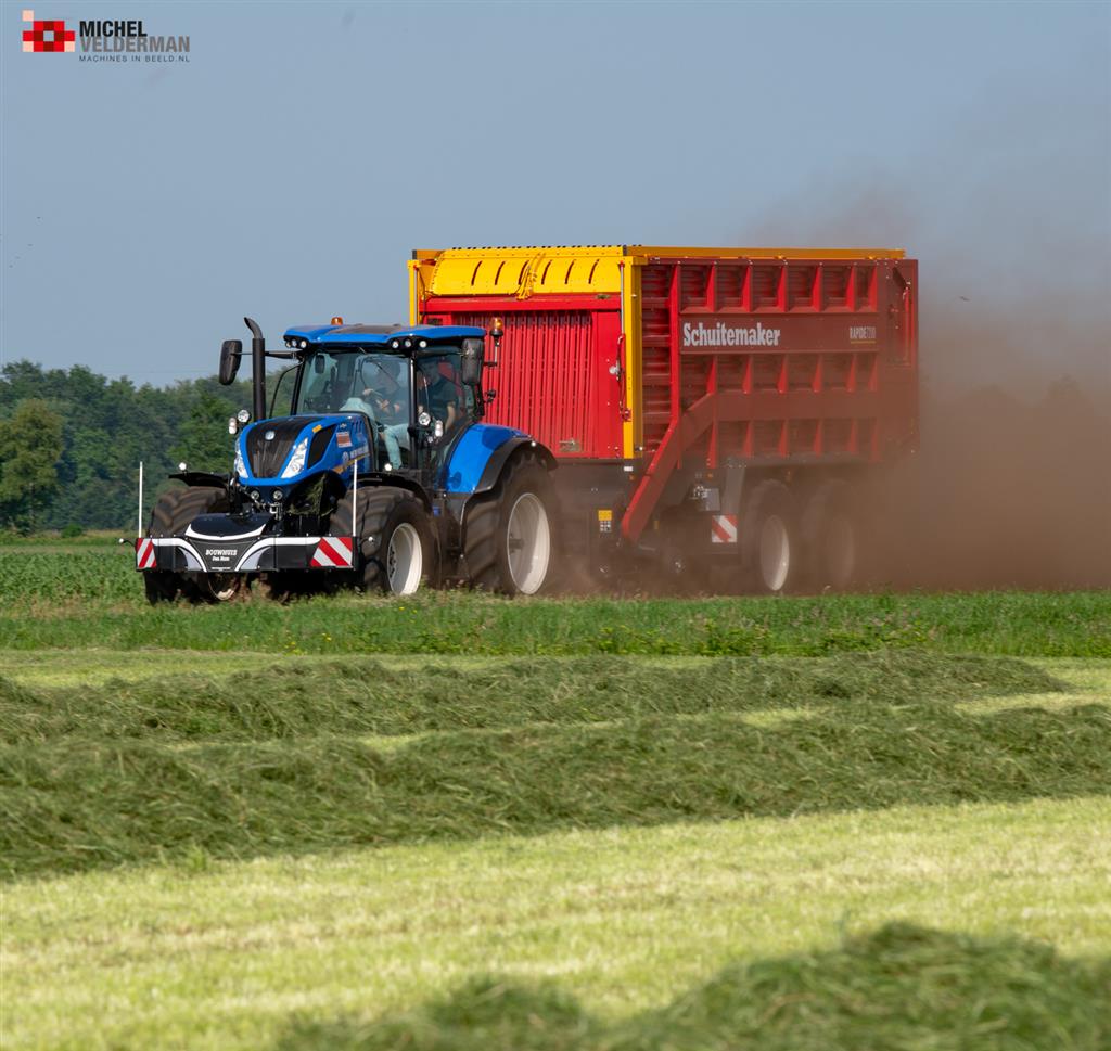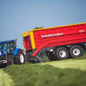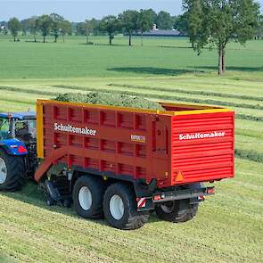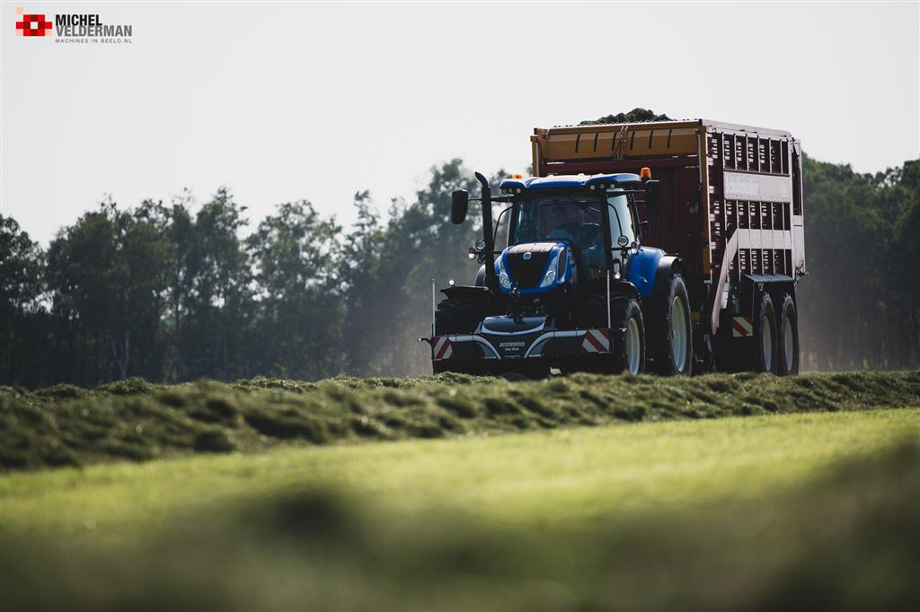 Loonbedrijf Bouwhuis uit Den Ham aan het werk in het gras, met één van hun twee nieuwe Schuitemaker Rapide 7200 opraapwagens.