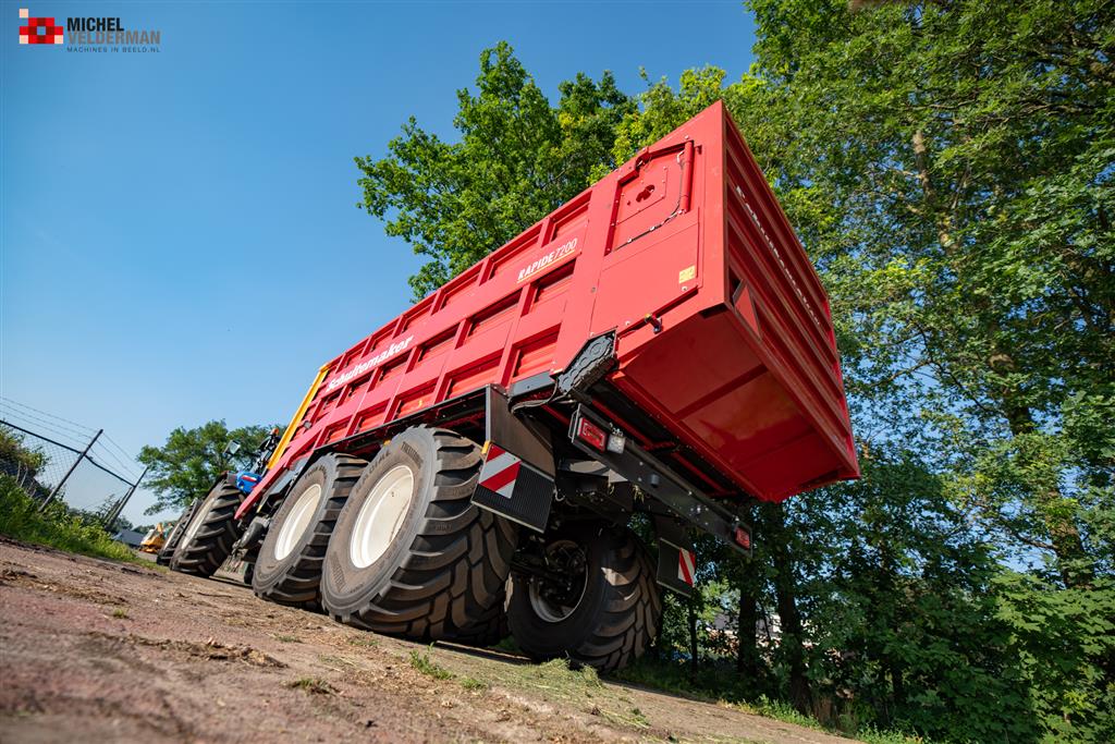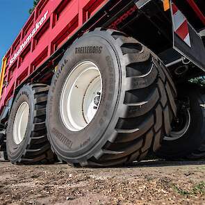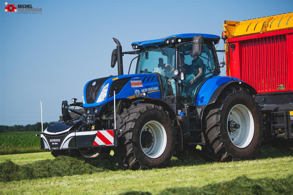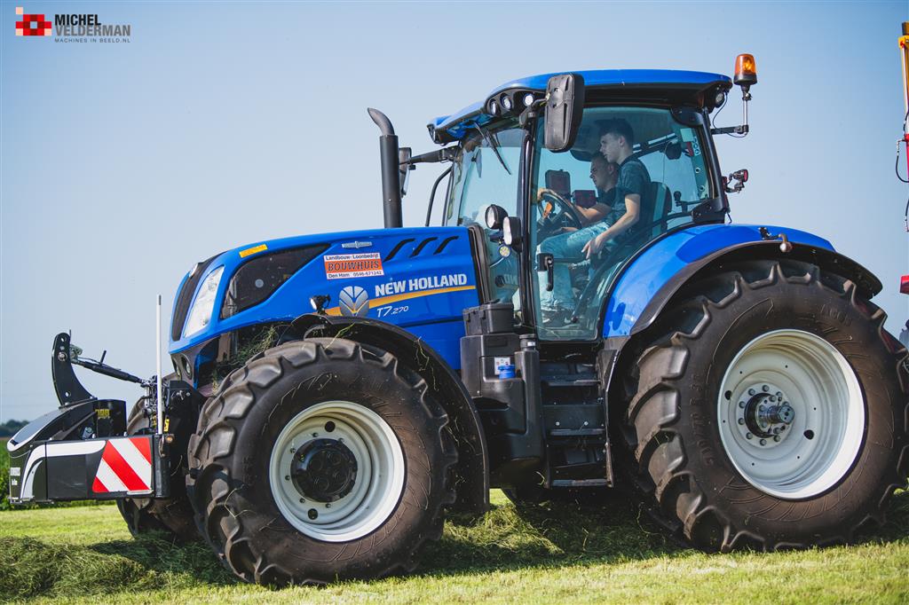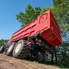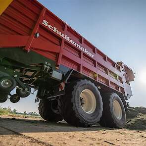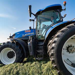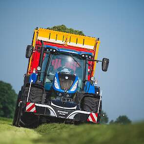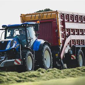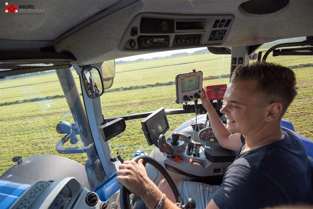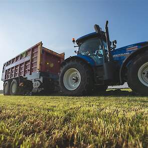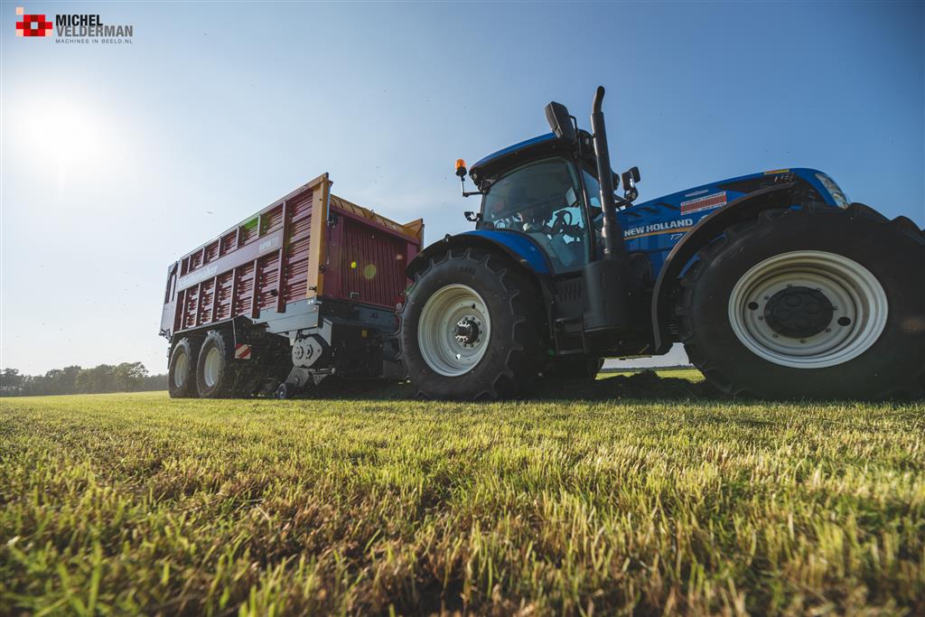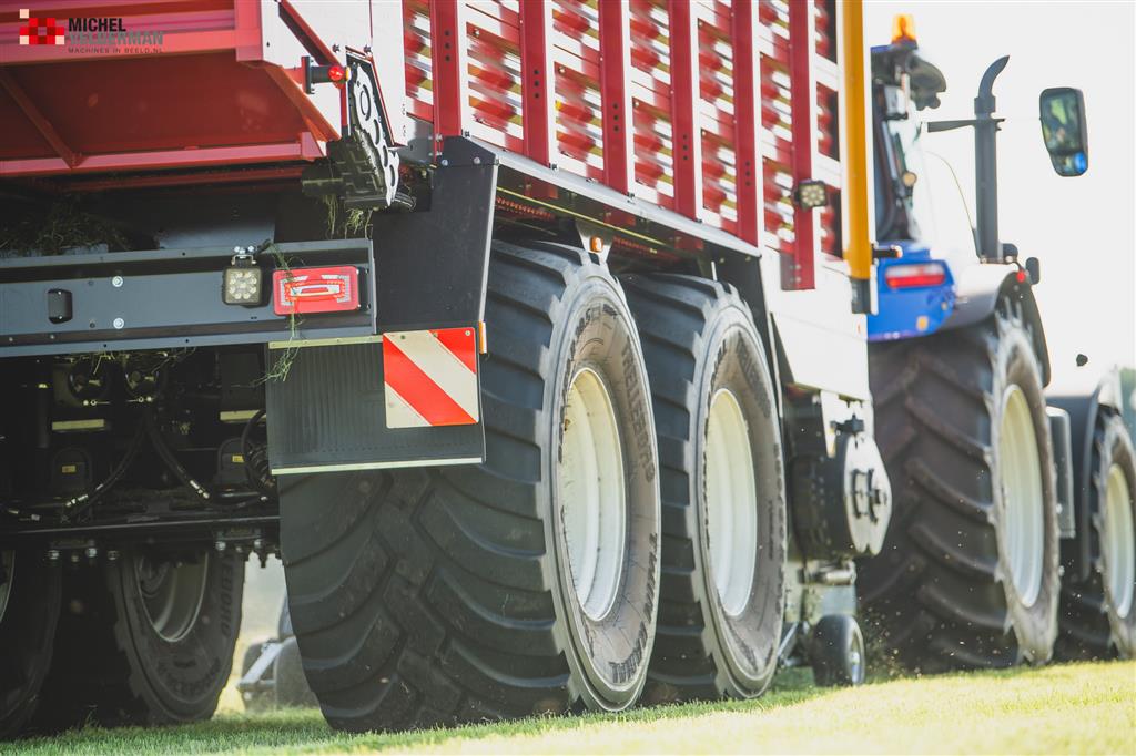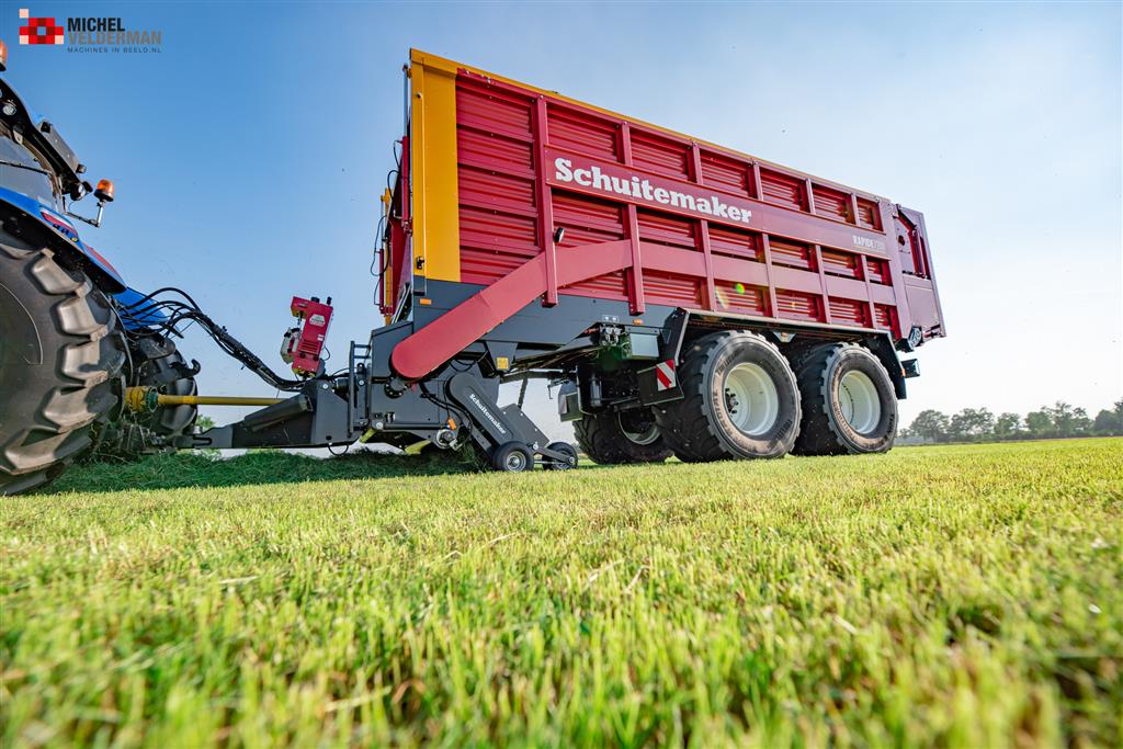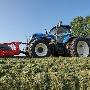 Loonbedrijf Bouwhuis uit Den Ham aan het werk in het gras, met één van hun twee nieuwe Schuitemaker Rapide 7200 opraapwagens.