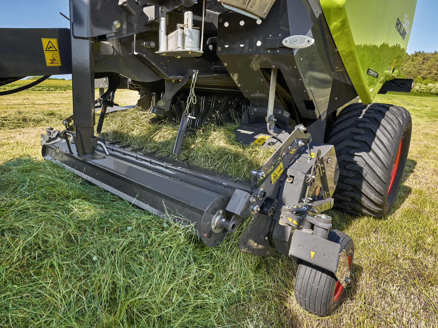 Een 2,10 meter brede pick-up haalt het gewas betrouwbaar en efficiënt op en een dubbele afplatrol is beschikbaar als optionele uitrusting. Dit verbetert de gewasstroom, vooral voor bijzonder grote en kleine zwaden, en bevordert een uniforme baalvorming. Twee zijaanvoervijzels zorgen voor een betrouwbare toevoer naar de rotor. Het optionele hakselmechanisme heeft 15 messen, met een theoretische snijlengte van 70 millimeter.
