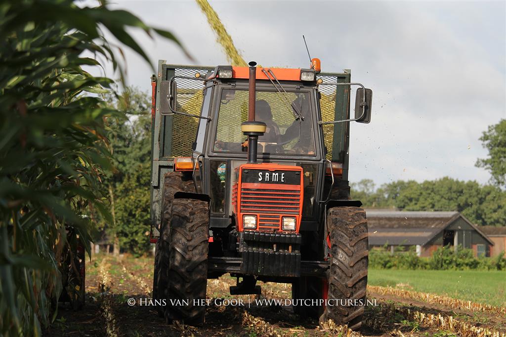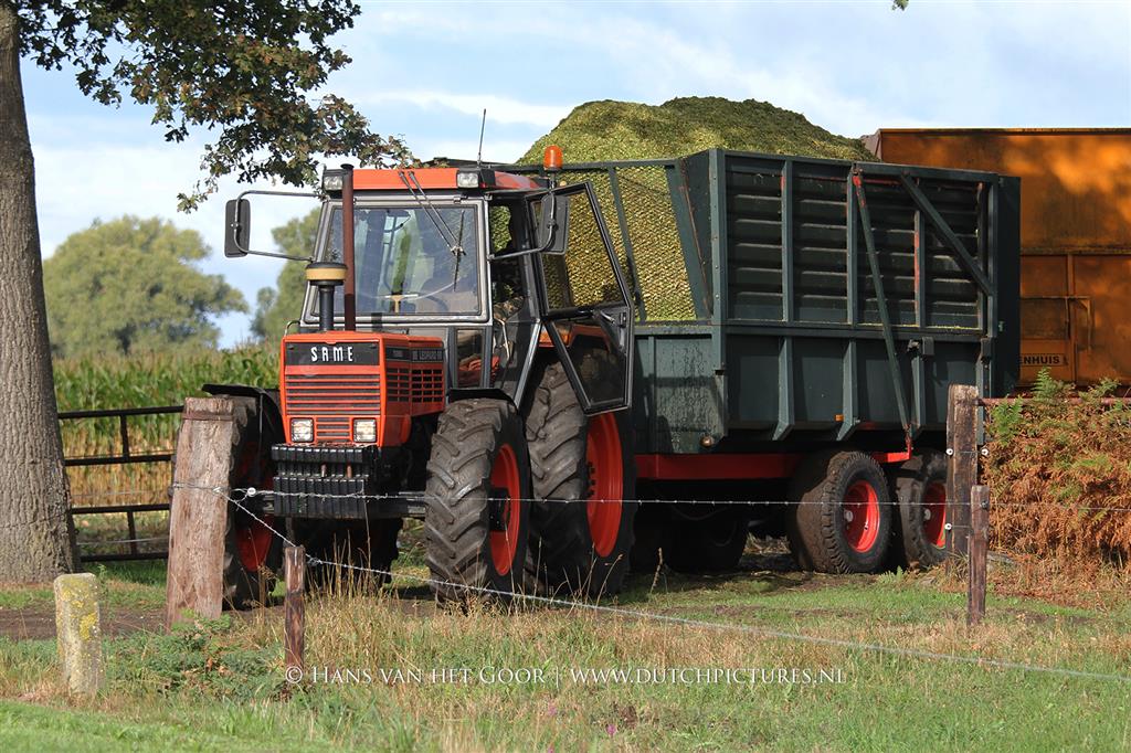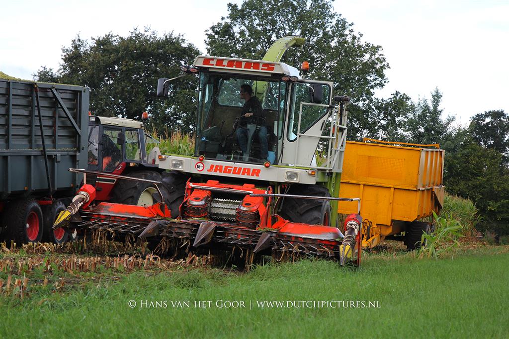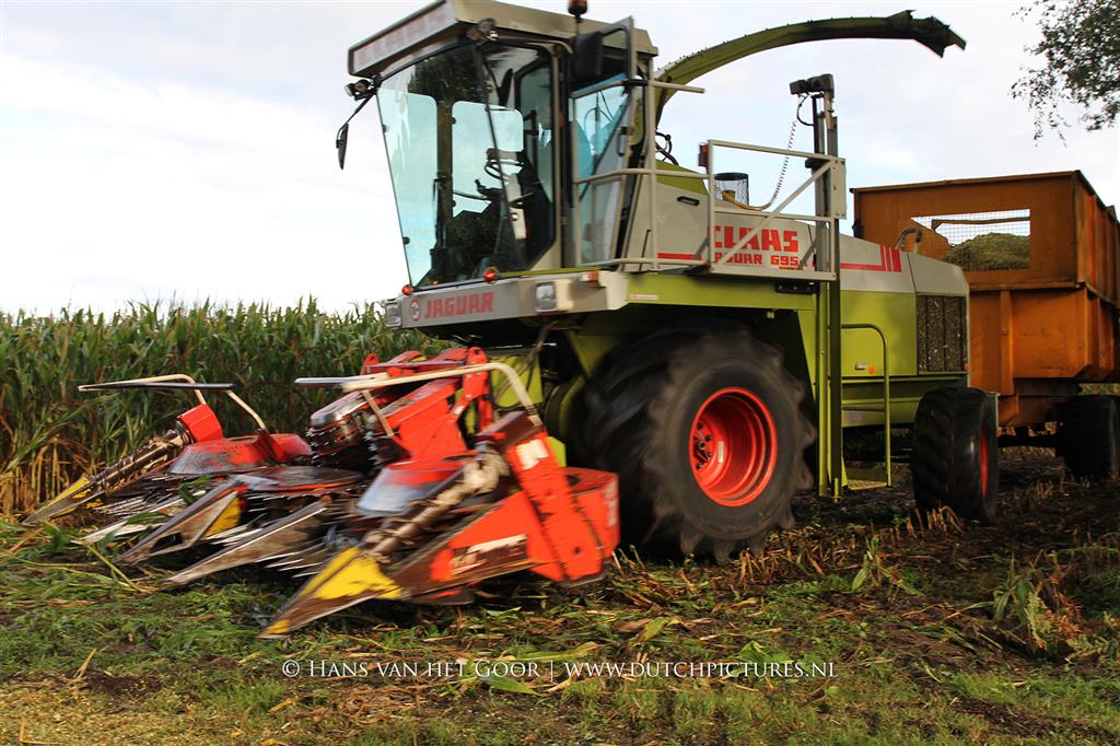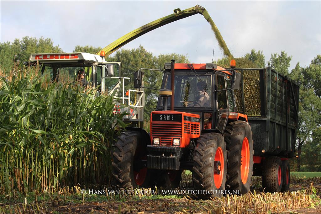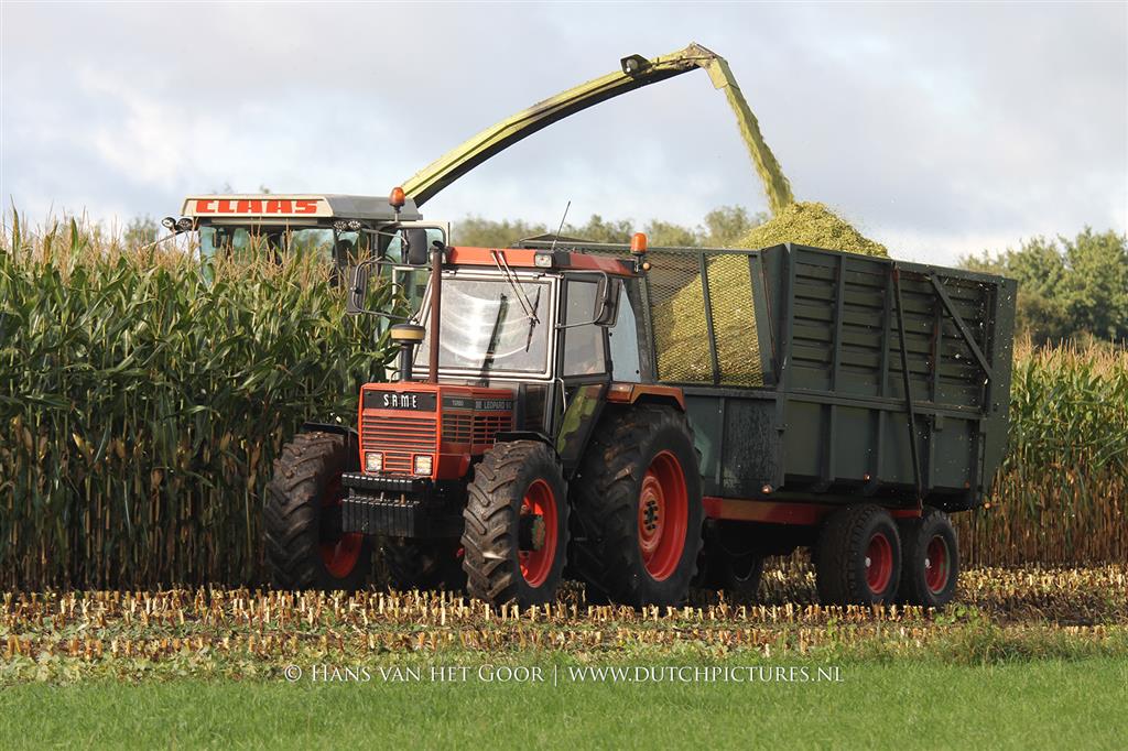 Maïs hakselen tussen Voorthuizen en Barneveld met een Claas Jaguar 695 SL veldhakselaar met Kemper Champion 4500 zesrijer, een Same Leopard 90 Turbo, een International 955 en een John Deere 6820. Loonbedrijf: Maïsploeg Kootwijkerbroek Het Velkemeen uit Kootwijkerbroek.
